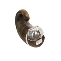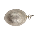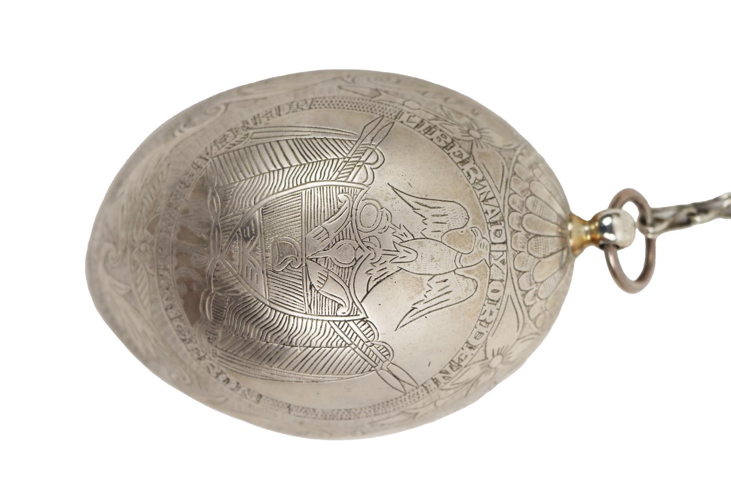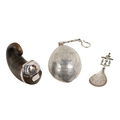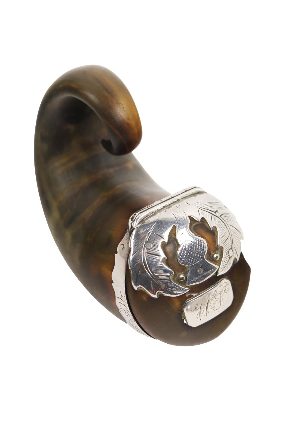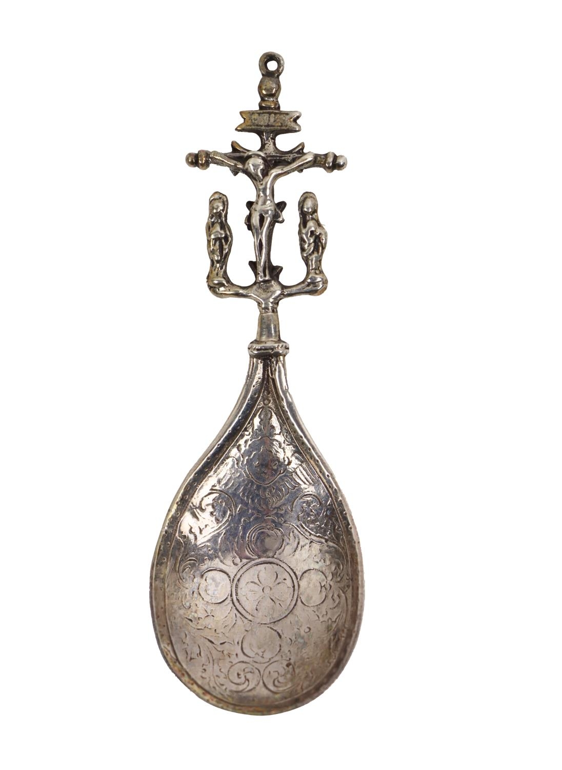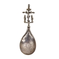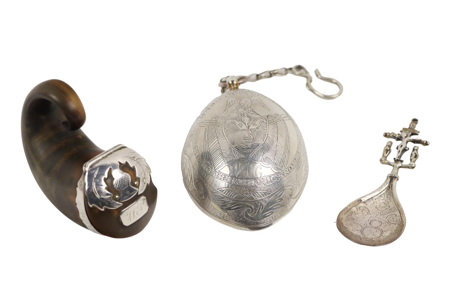 Silverware: An early 20th Century cruciform Caddy Spoon, with pierced handle and etched bowl, [Hanau Neresheimer]. import mark Chester, Berthold Muller, 1905; a rare early 19th Century etched Colombian silver Hunting Water Cup, with inscription and crest and loop; a Victorian Scottish Snuff Mule with etched silver mounts, inscribed 'Wm. Strathdee, Farmer, Tombally,' as a lot. (3)