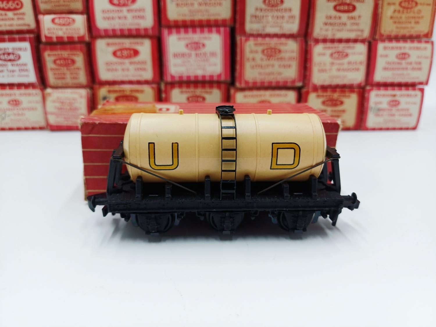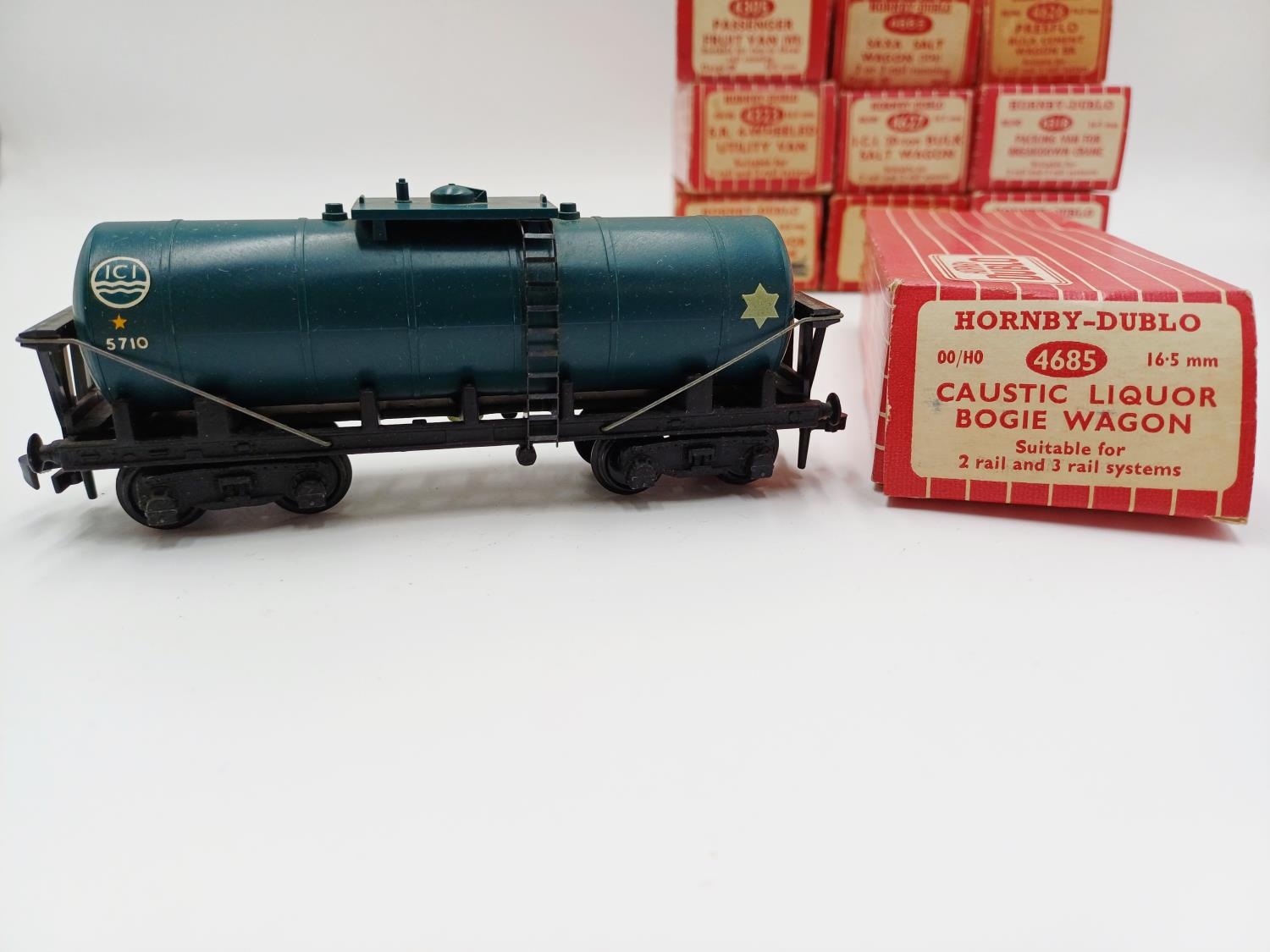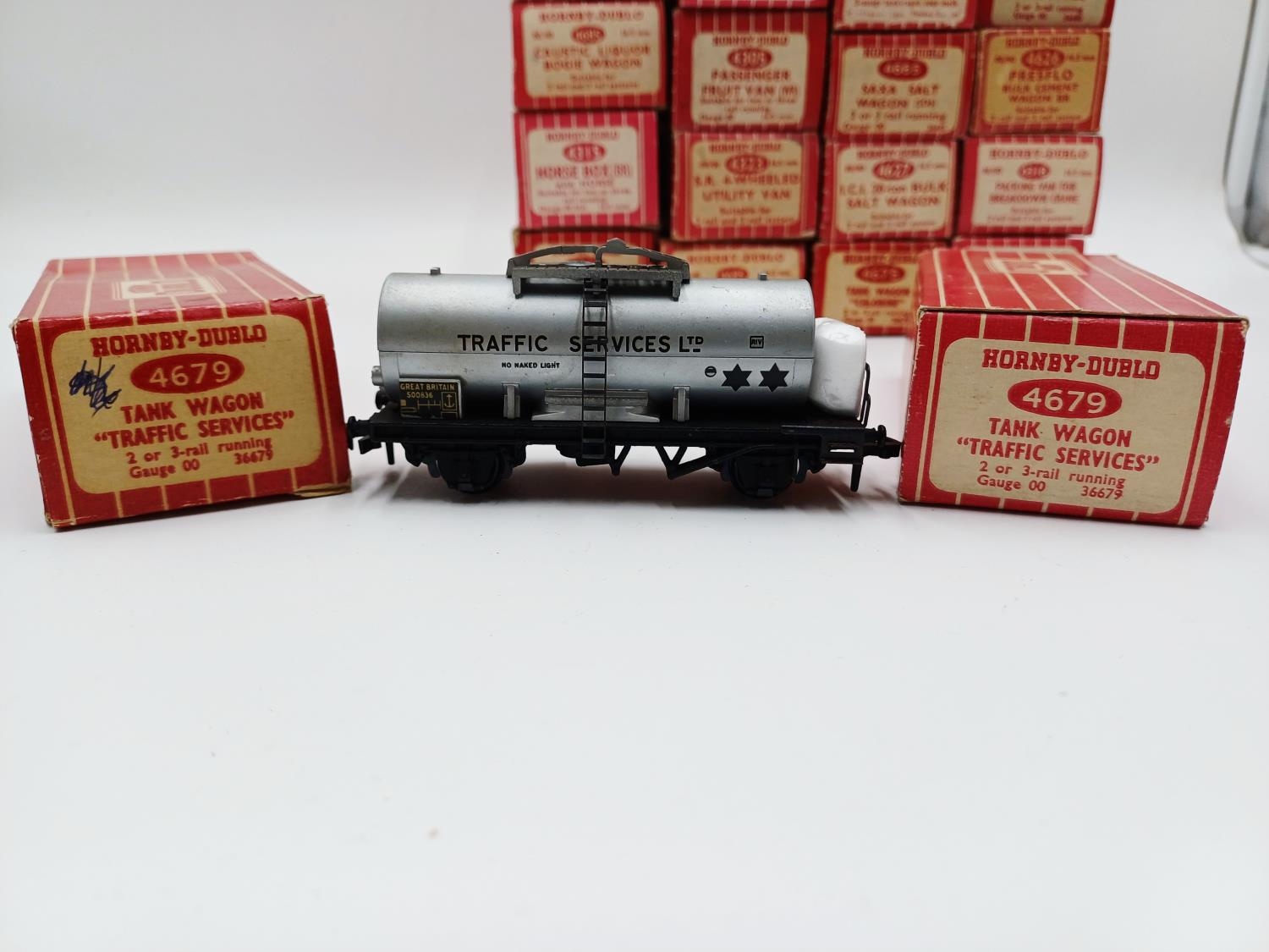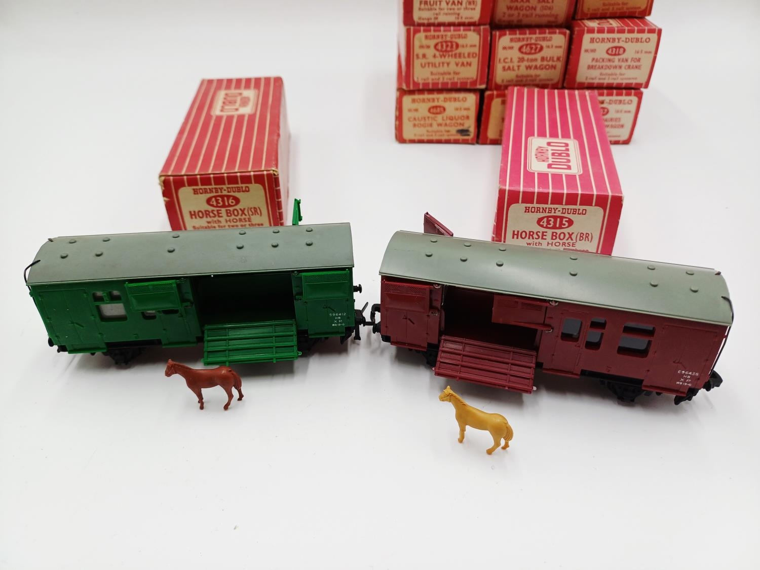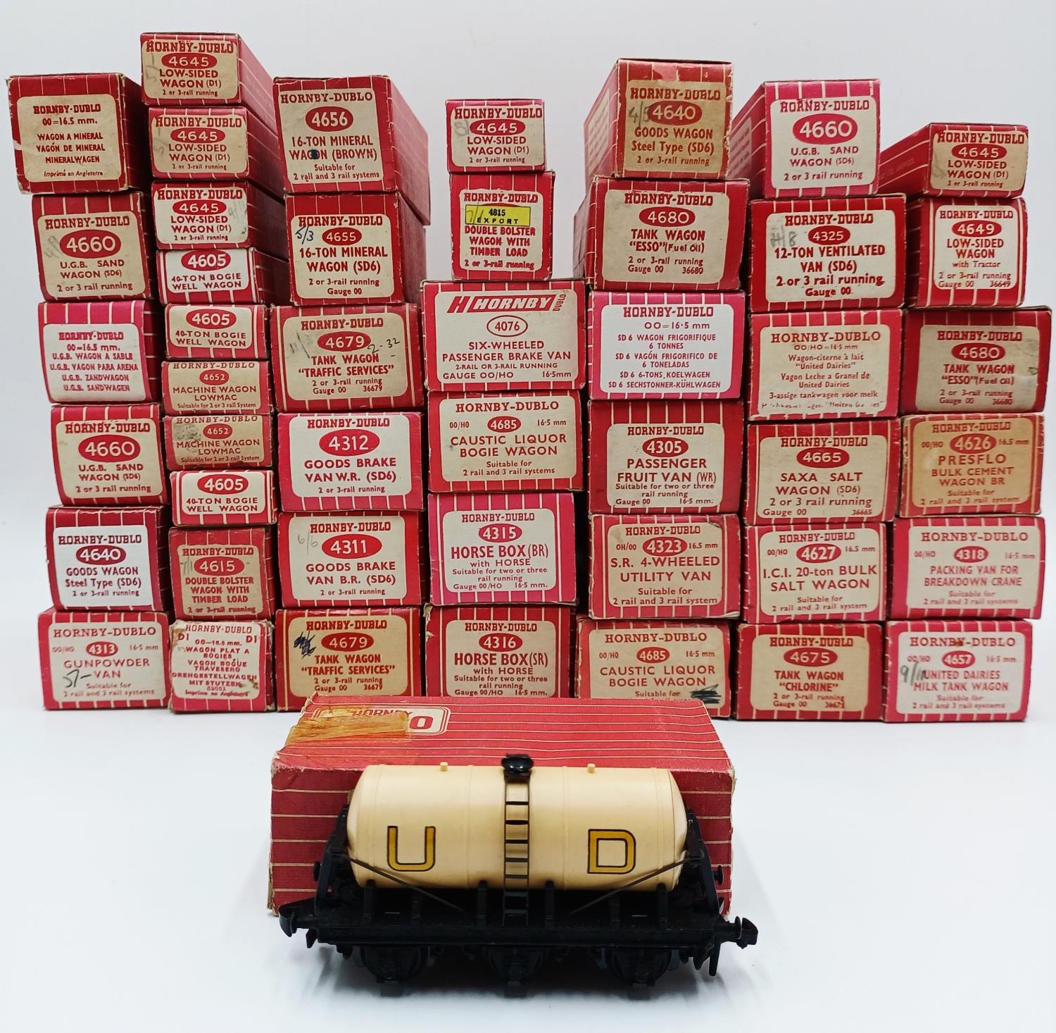 Approx. forty seven boxed Hornby Dublo 00 gauge model railway accessories to include 4305 passenger fruit van, 4316 horsebox, 4679 'Traffic Services' tank wagon, 4675 'Chlorine' tank wagon, 4685 Caustic Liquor bogie wagon, 4652 machine wagon Lowmac etc.