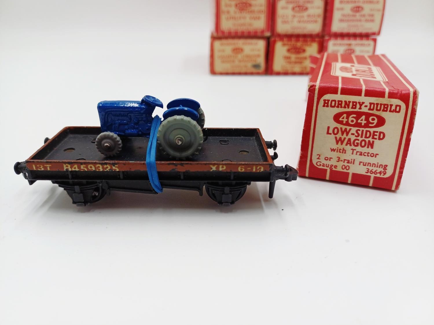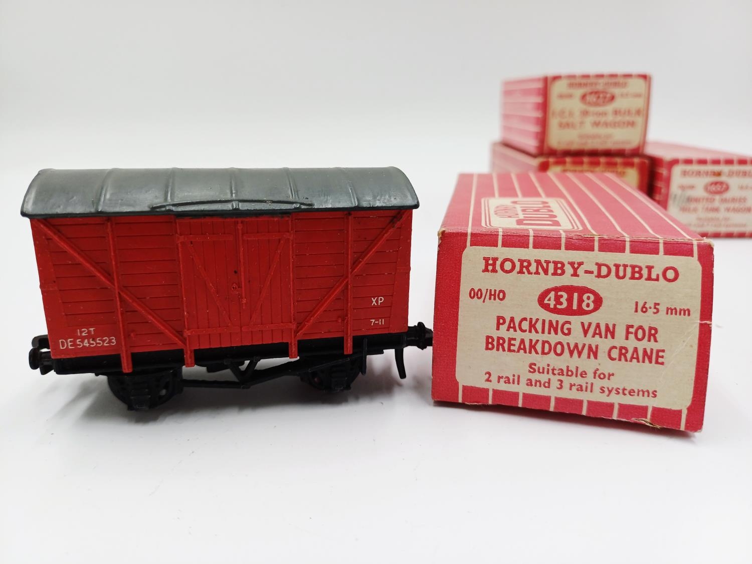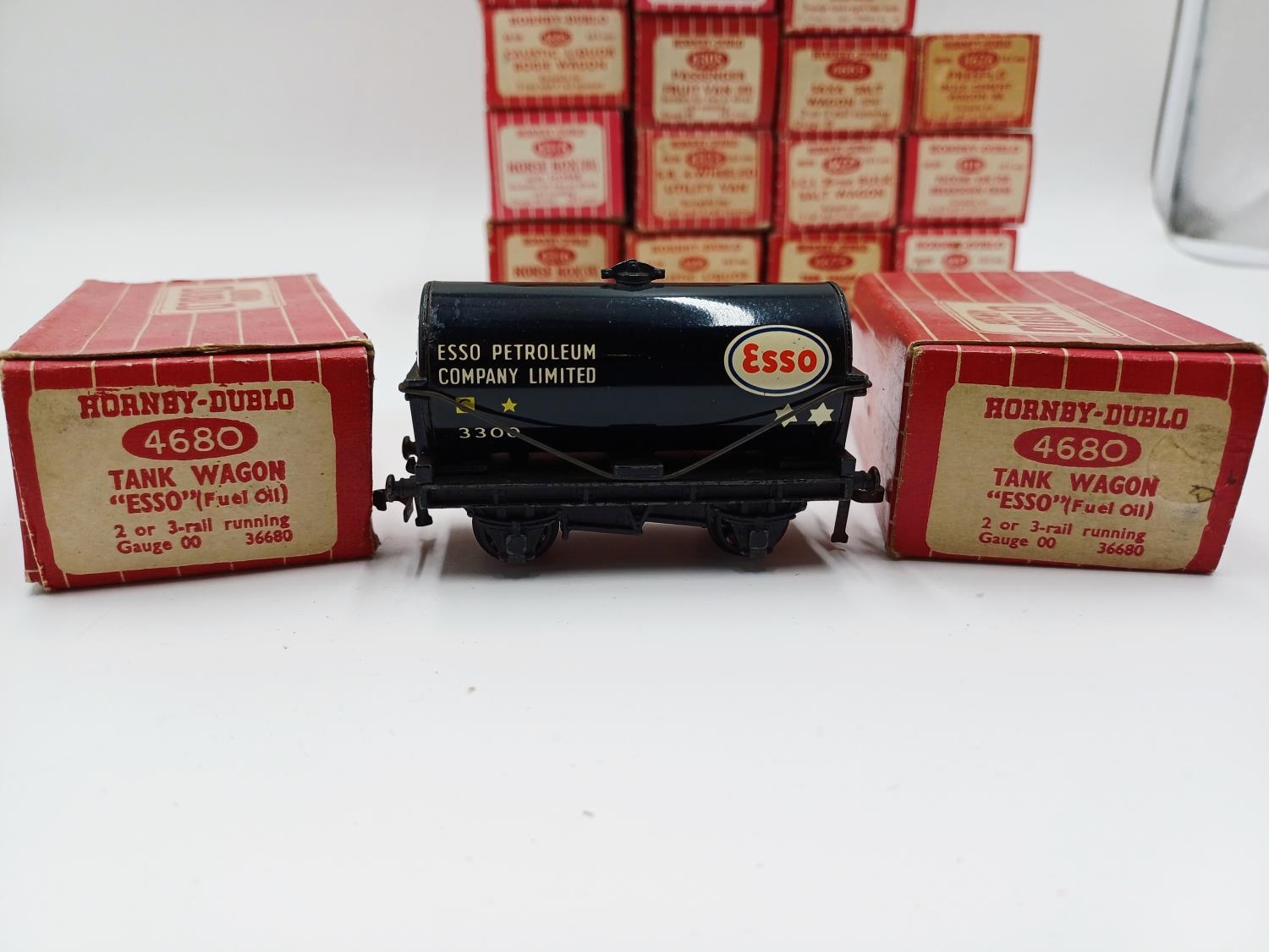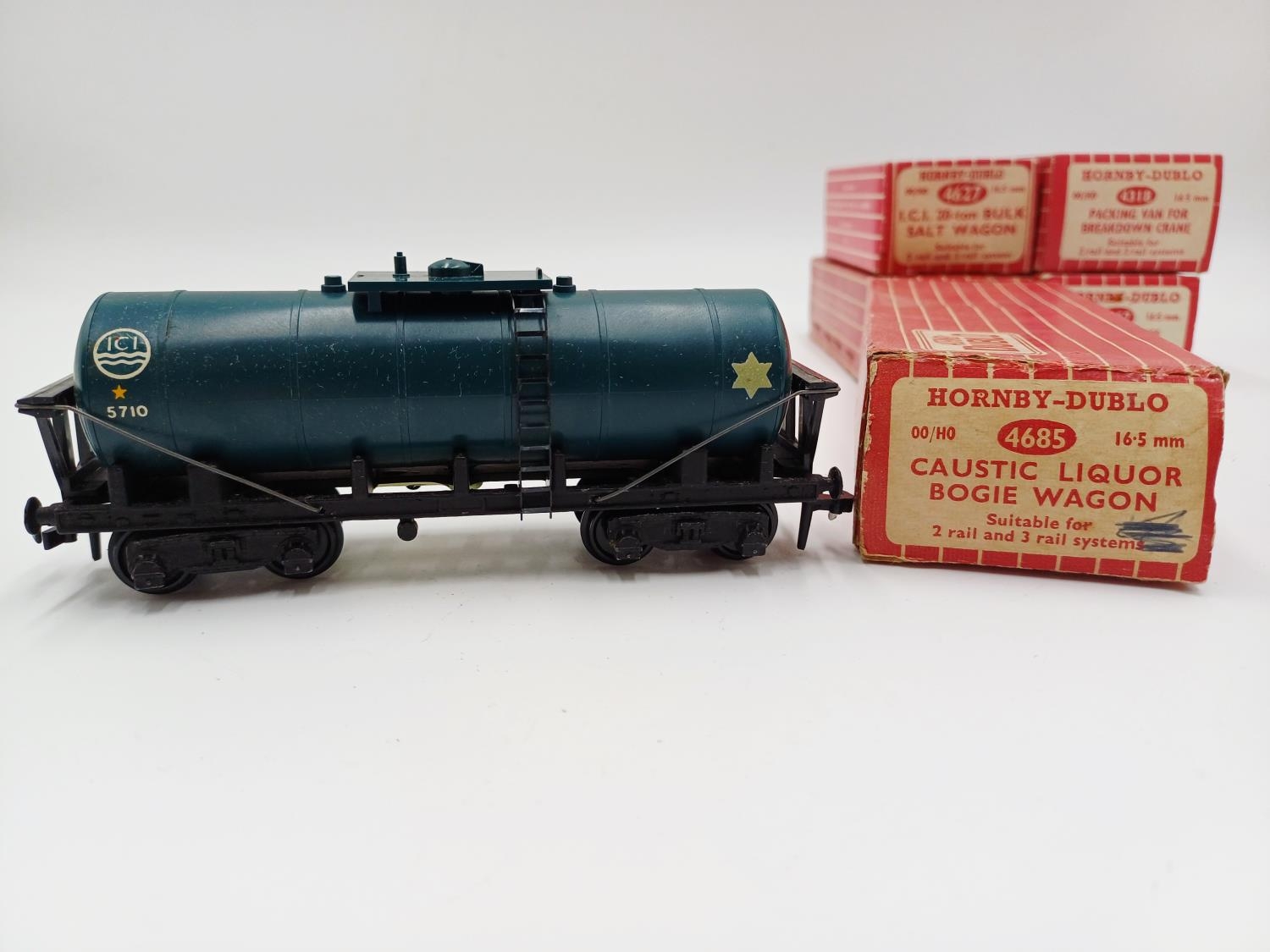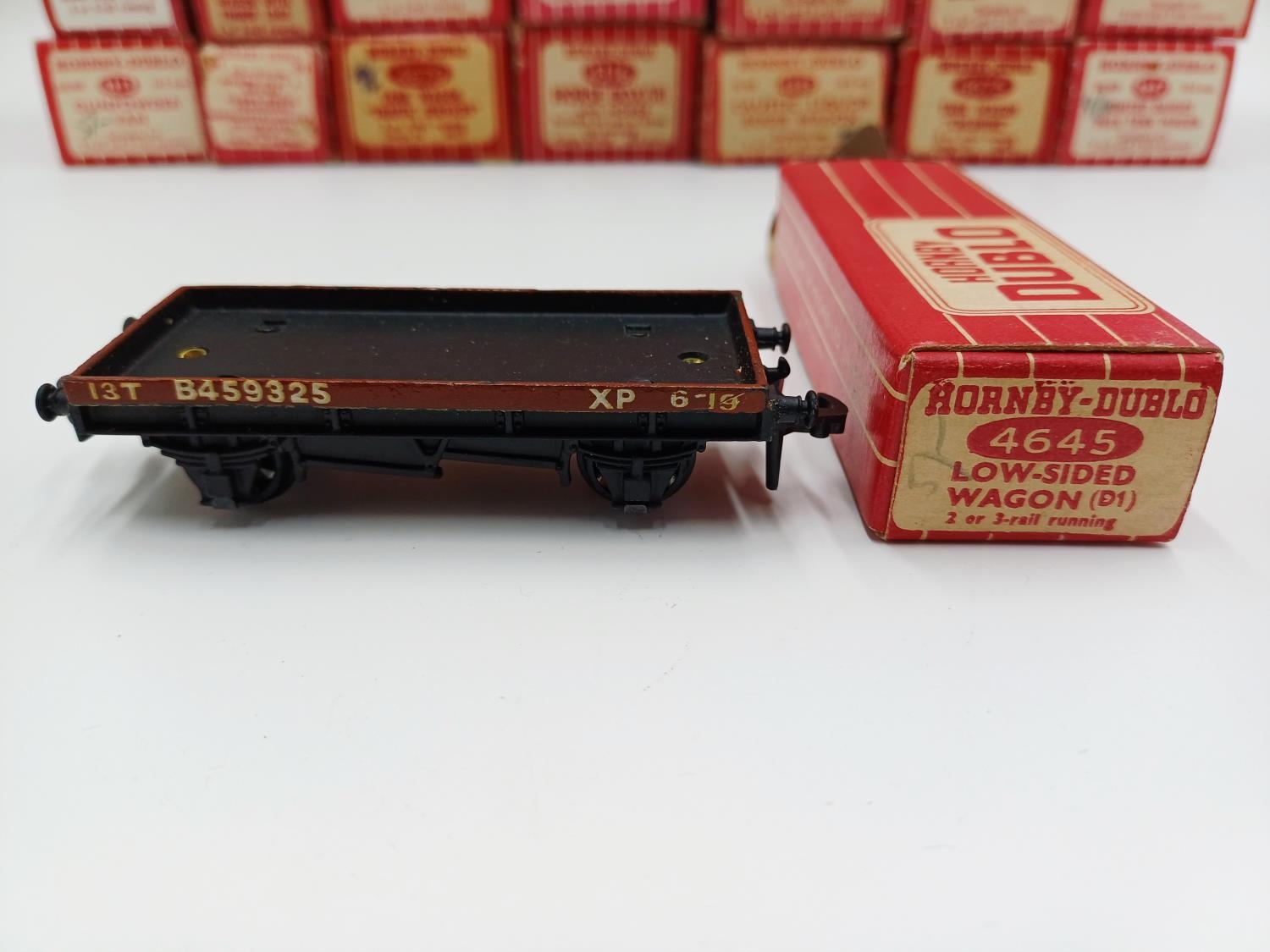 Approx. forty seven boxed Hornby Dublo 00 gauge model railway accessories to include 4305 passenger fruit van, 4316 horsebox, 4679 'Traffic Services' tank wagon, 4675 'Chlorine' tank wagon, 4685 Caustic Liquor bogie wagon, 4652 machine wagon Lowmac etc.