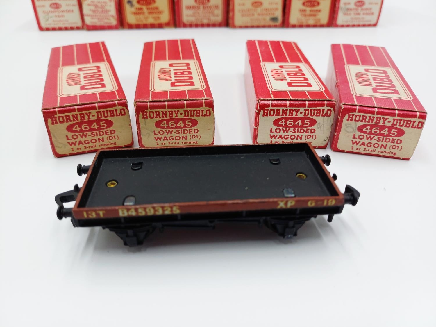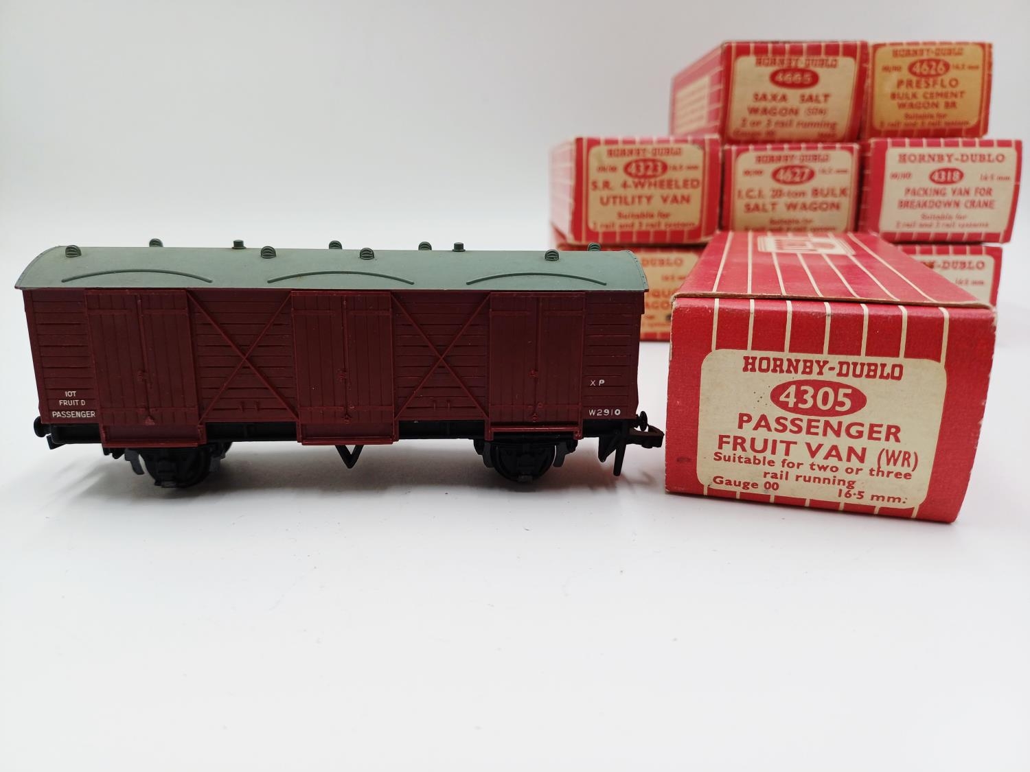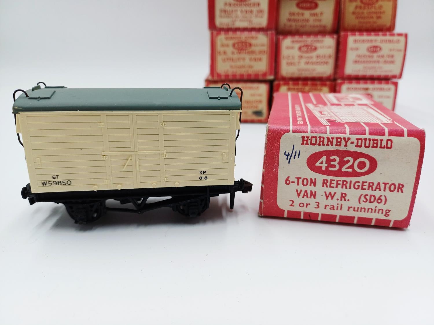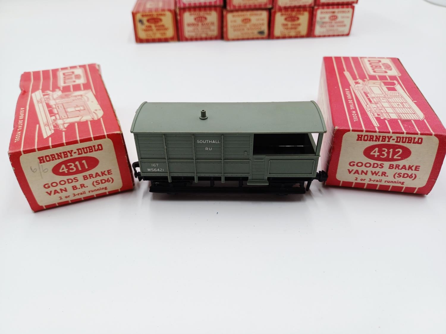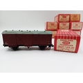 Approx. forty seven boxed Hornby Dublo 00 gauge model railway accessories to include 4305 passenger fruit van, 4316 horsebox, 4679 'Traffic Services' tank wagon, 4675 'Chlorine' tank wagon, 4685 Caustic Liquor bogie wagon, 4652 machine wagon Lowmac etc.