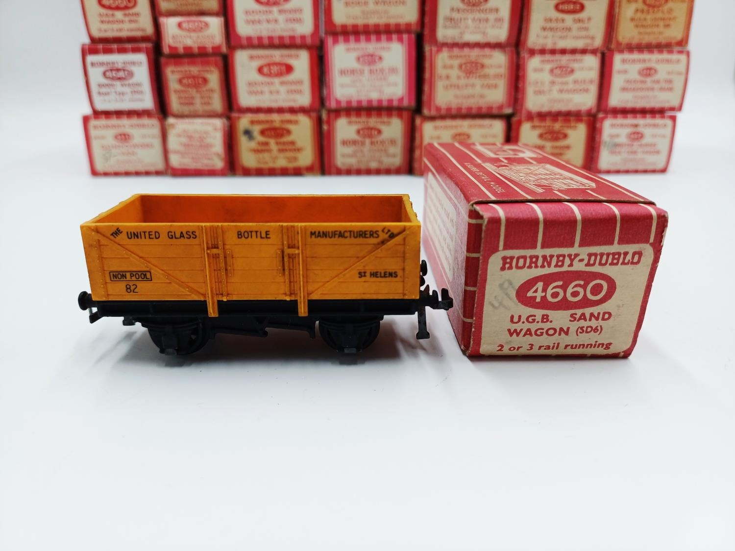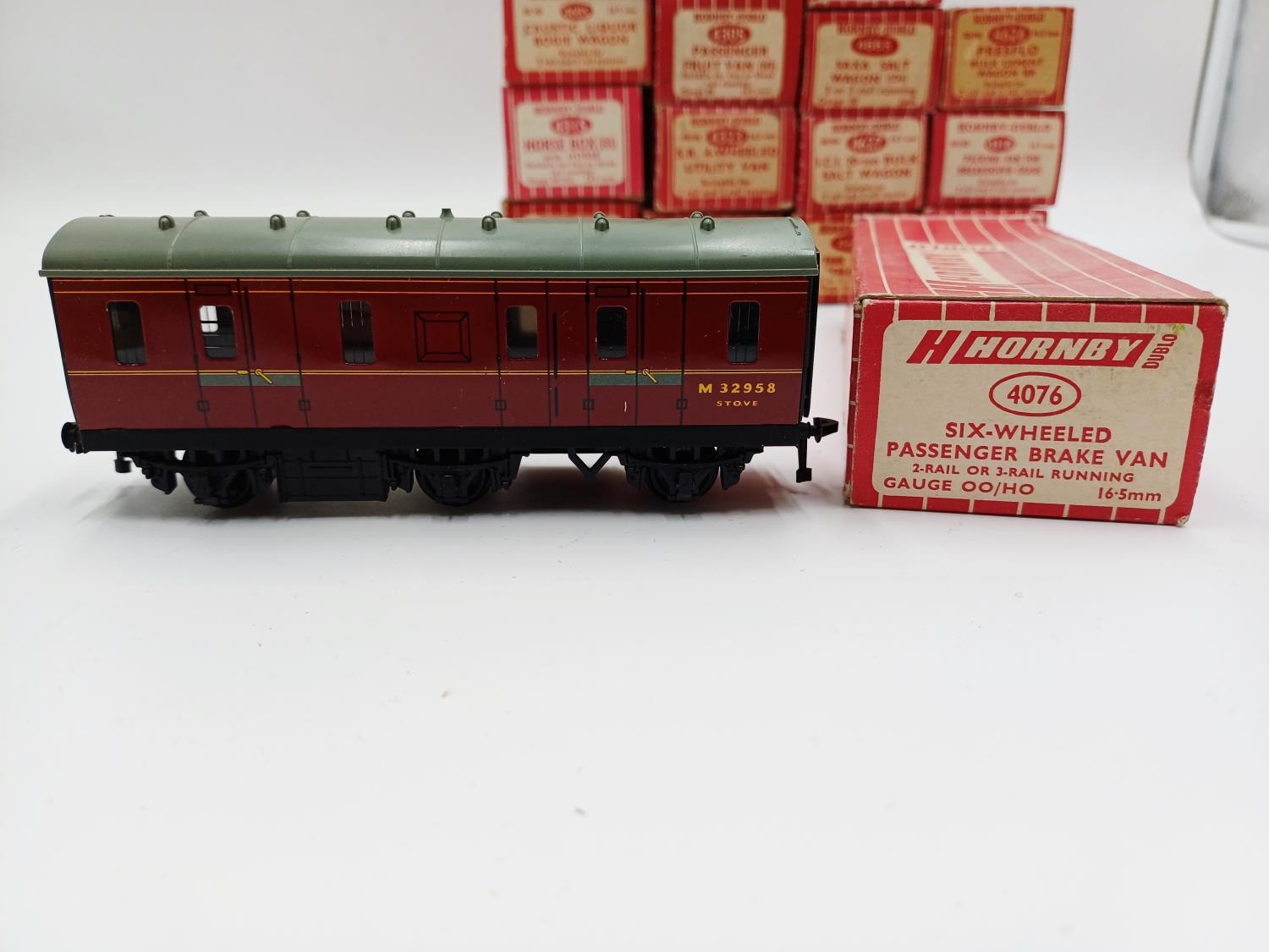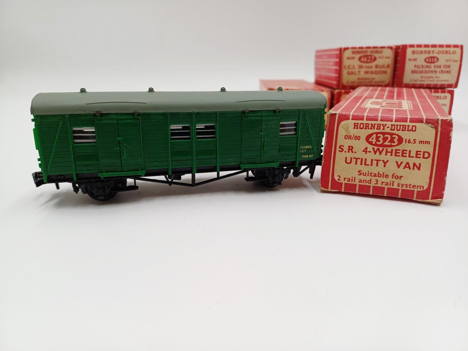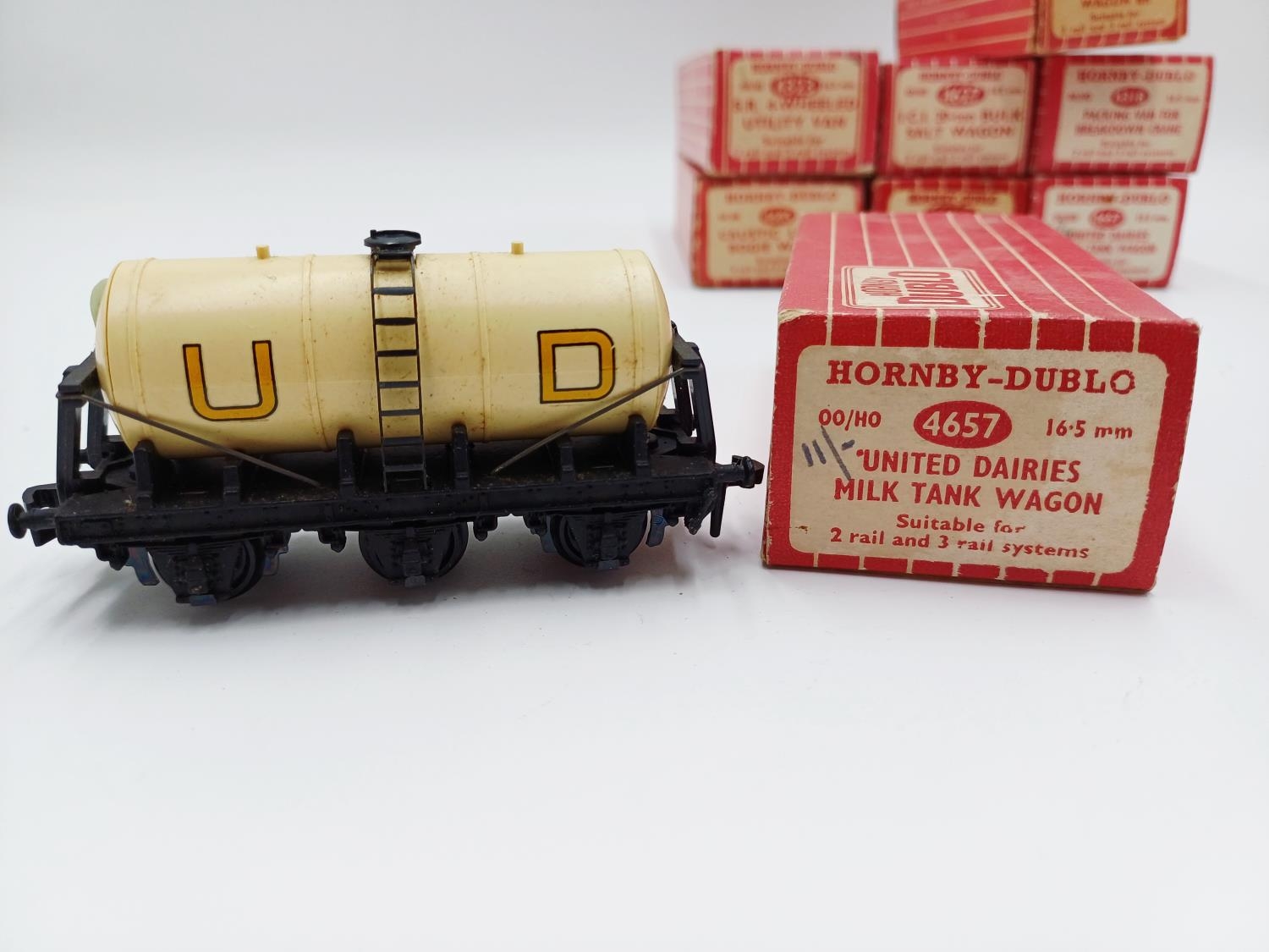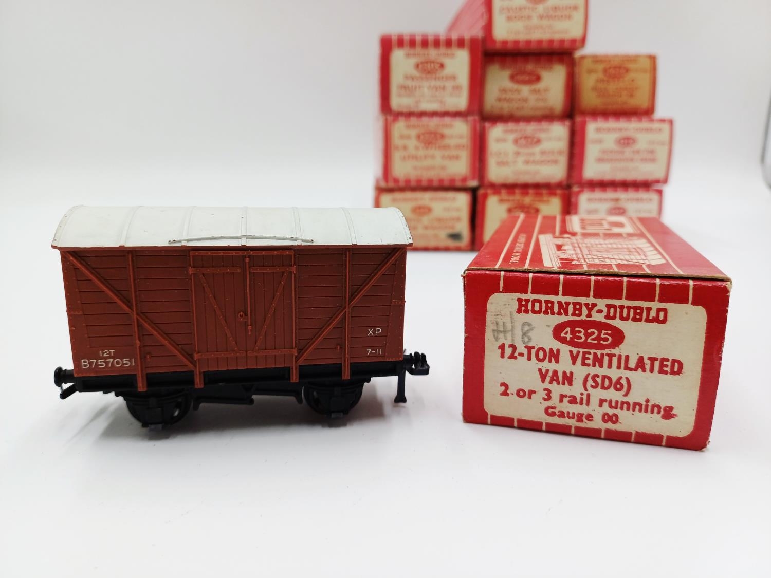 Approx. forty seven boxed Hornby Dublo 00 gauge model railway accessories to include 4305 passenger fruit van, 4316 horsebox, 4679 'Traffic Services' tank wagon, 4675 'Chlorine' tank wagon, 4685 Caustic Liquor bogie wagon, 4652 machine wagon Lowmac etc.