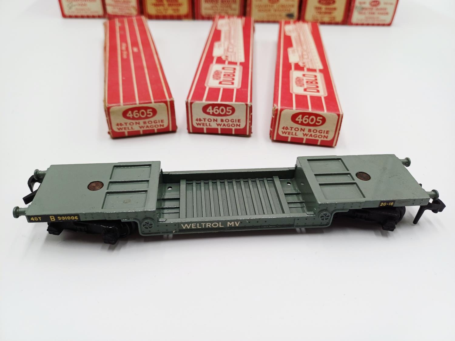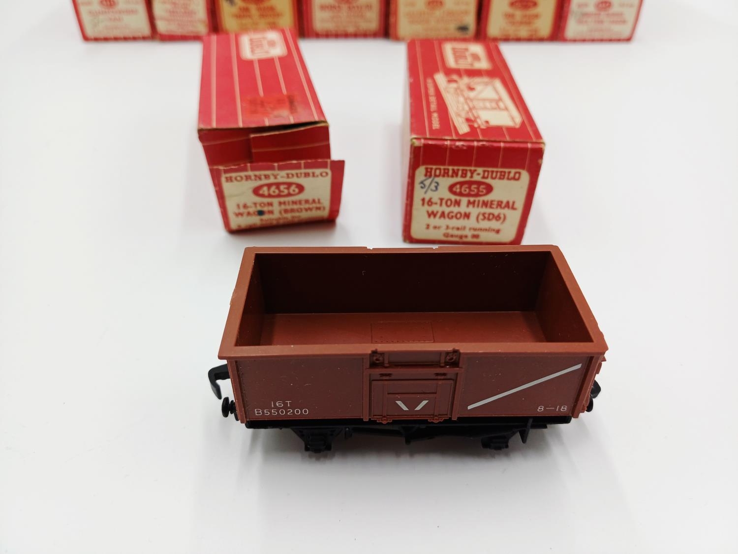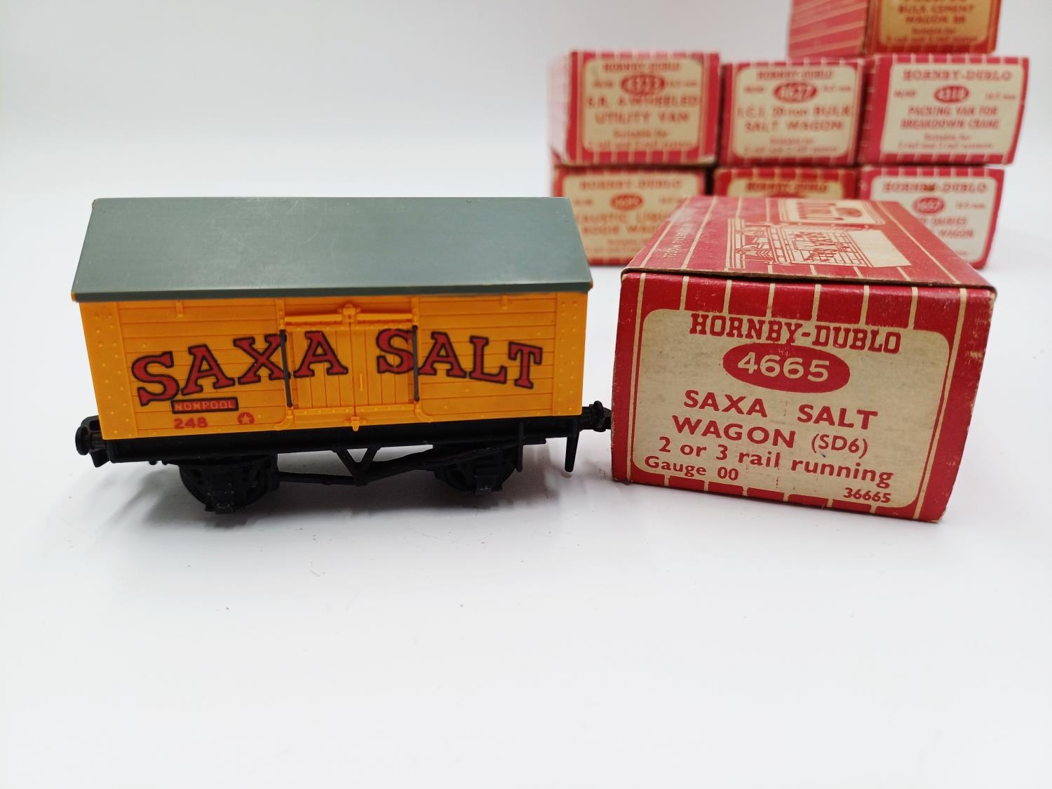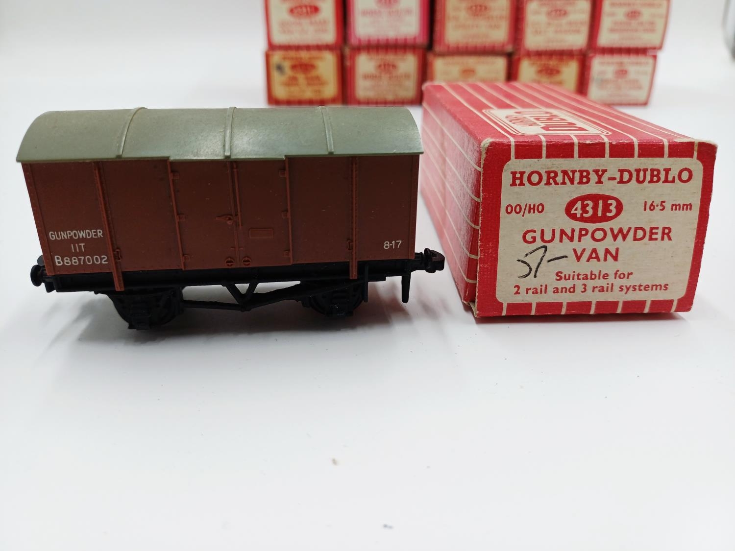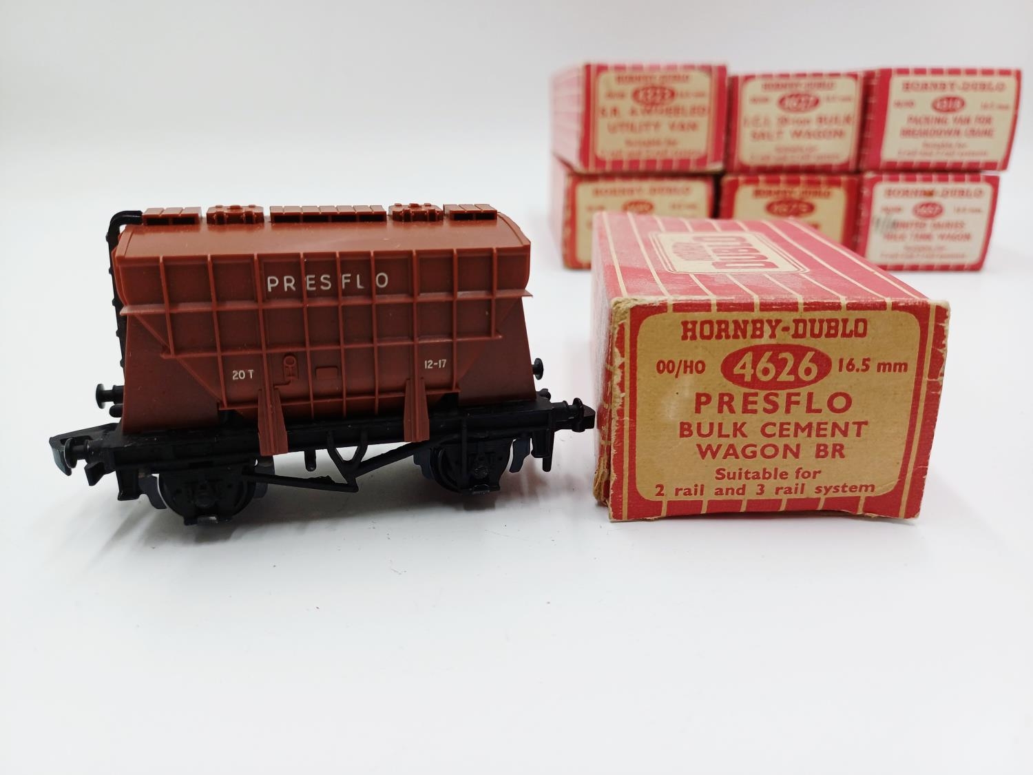 Approx. forty seven boxed Hornby Dublo 00 gauge model railway accessories to include 4305 passenger fruit van, 4316 horsebox, 4679 'Traffic Services' tank wagon, 4675 'Chlorine' tank wagon, 4685 Caustic Liquor bogie wagon, 4652 machine wagon Lowmac etc.