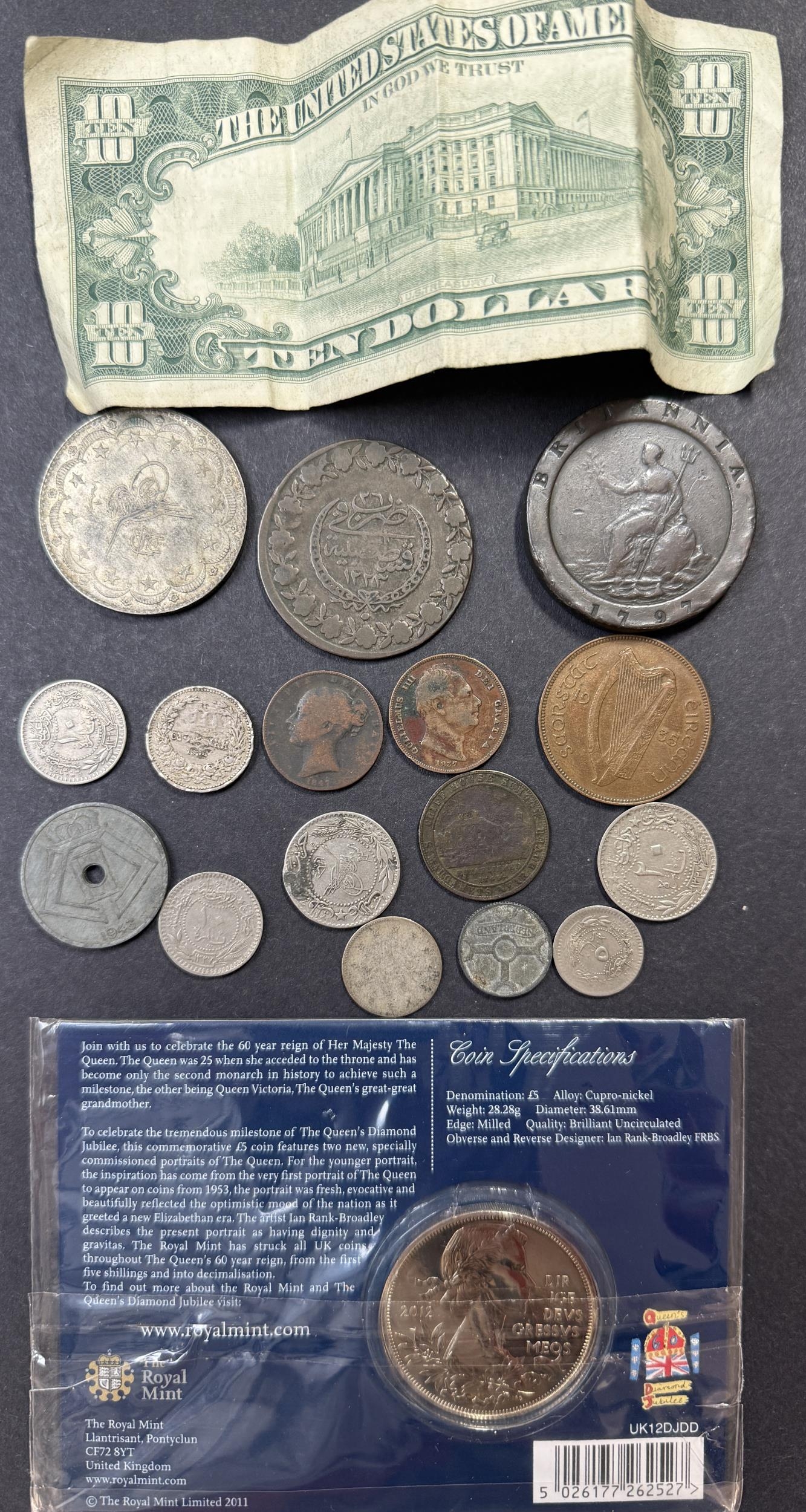 A small accumulation of mainly 20th Century circulated coins and odd banknote, strength in UK and Turkish, noted 1797 2d, Ottoman 5k and USA 1988 $10 banknote, (weight 900g) mixed condition