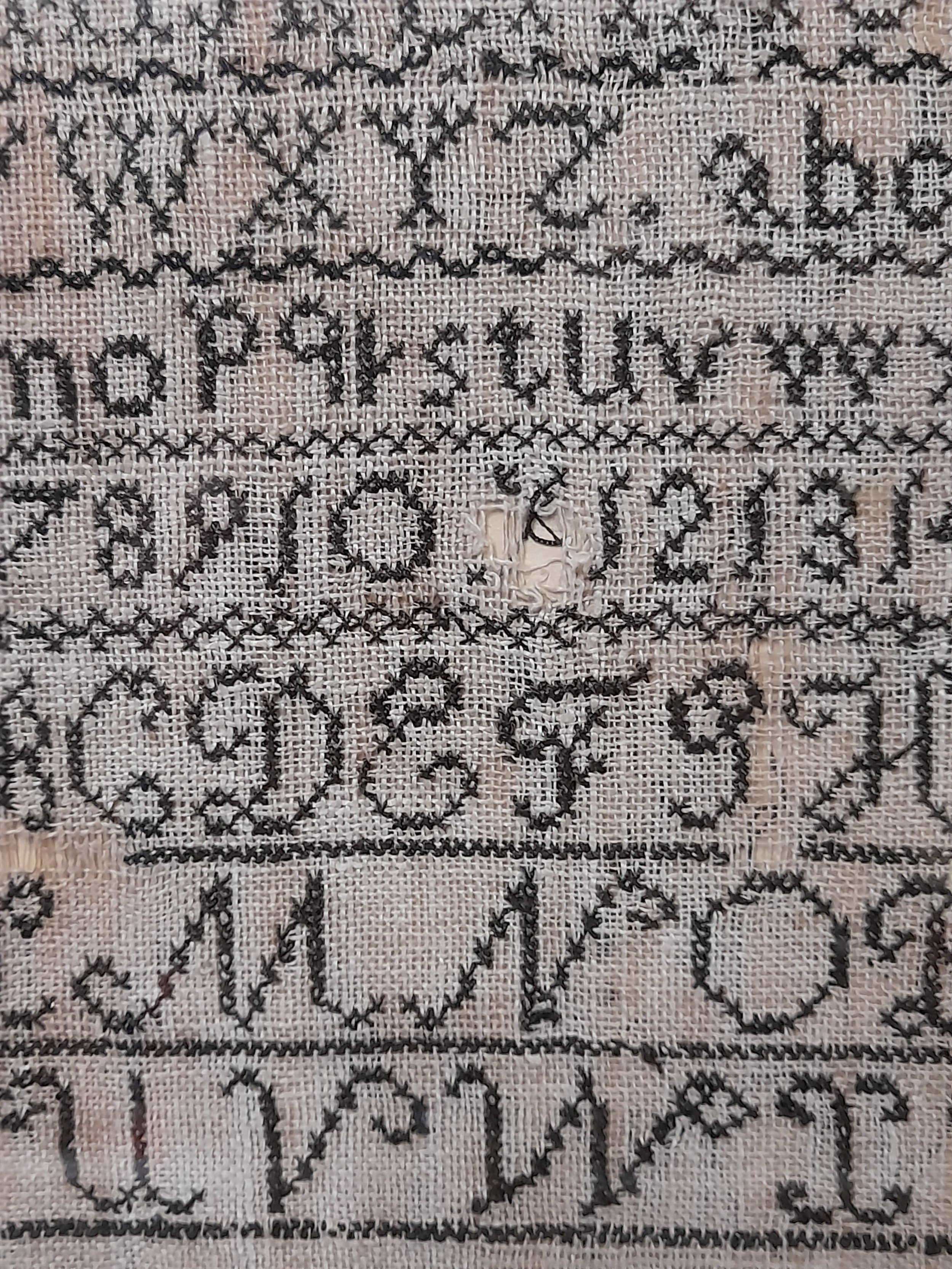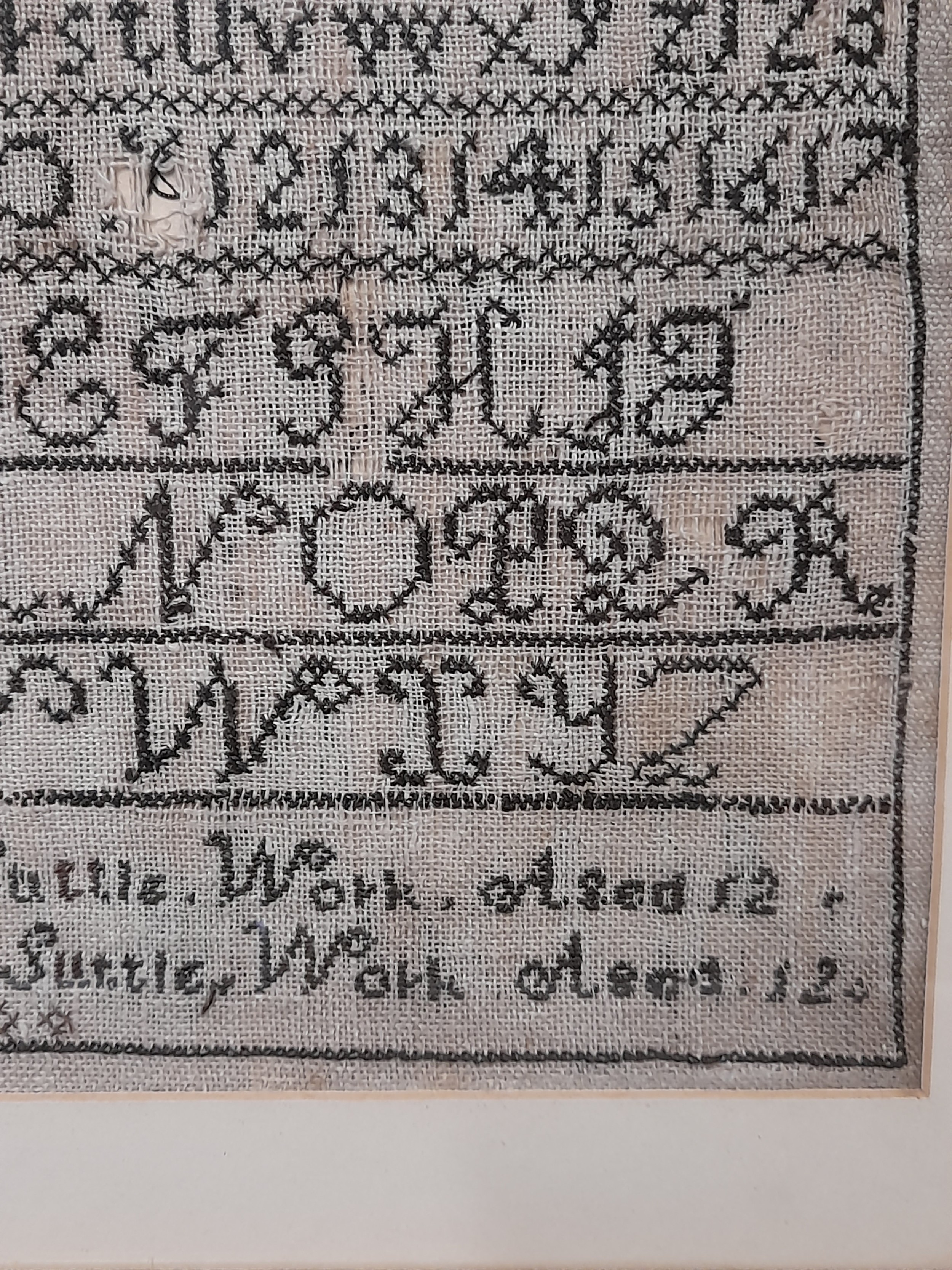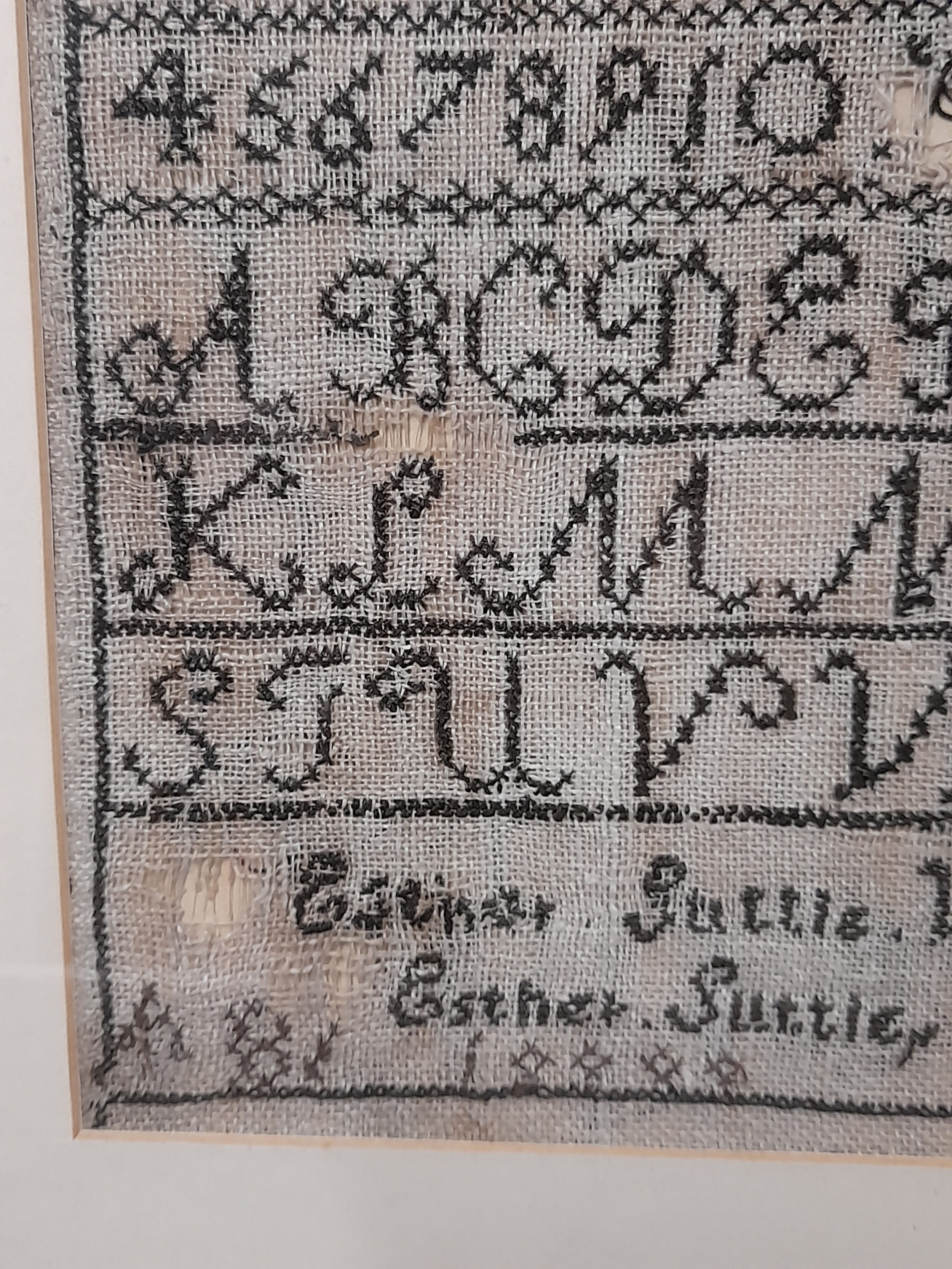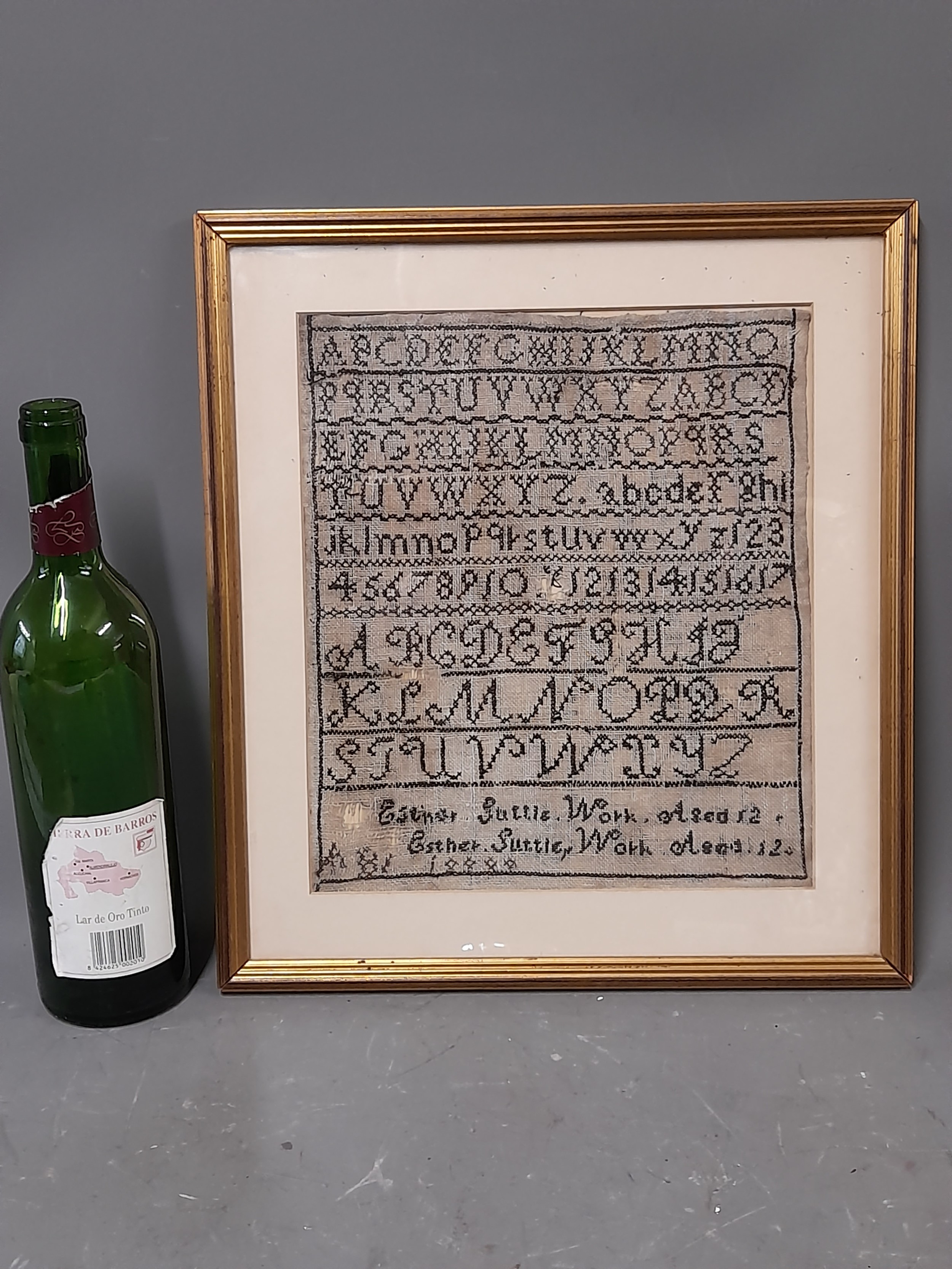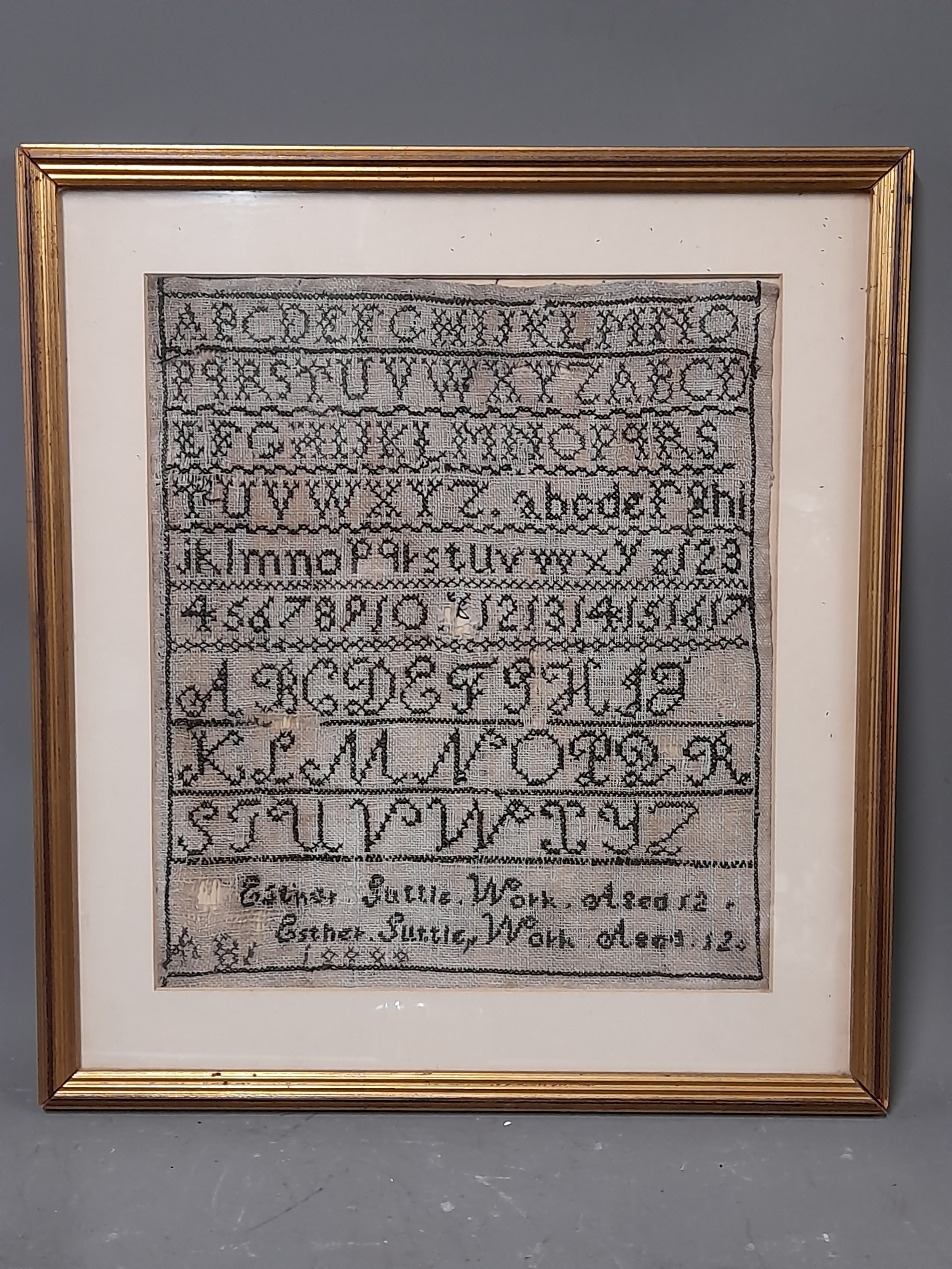 Framed and Glazed Sampler, Depicting Letters and Numbers by Esther Suttle aged 12 dated 1888, overall size 35cm x 39cm