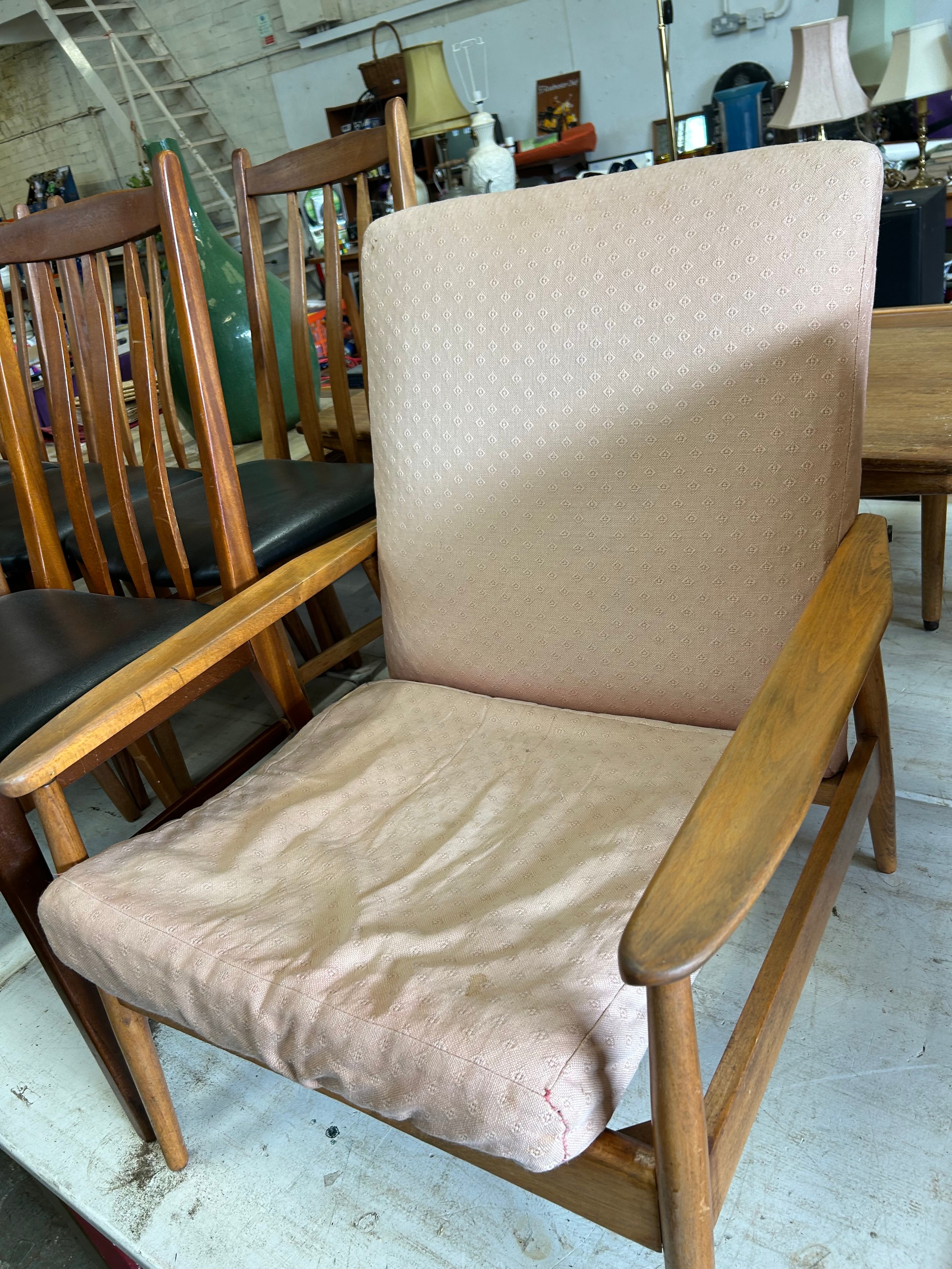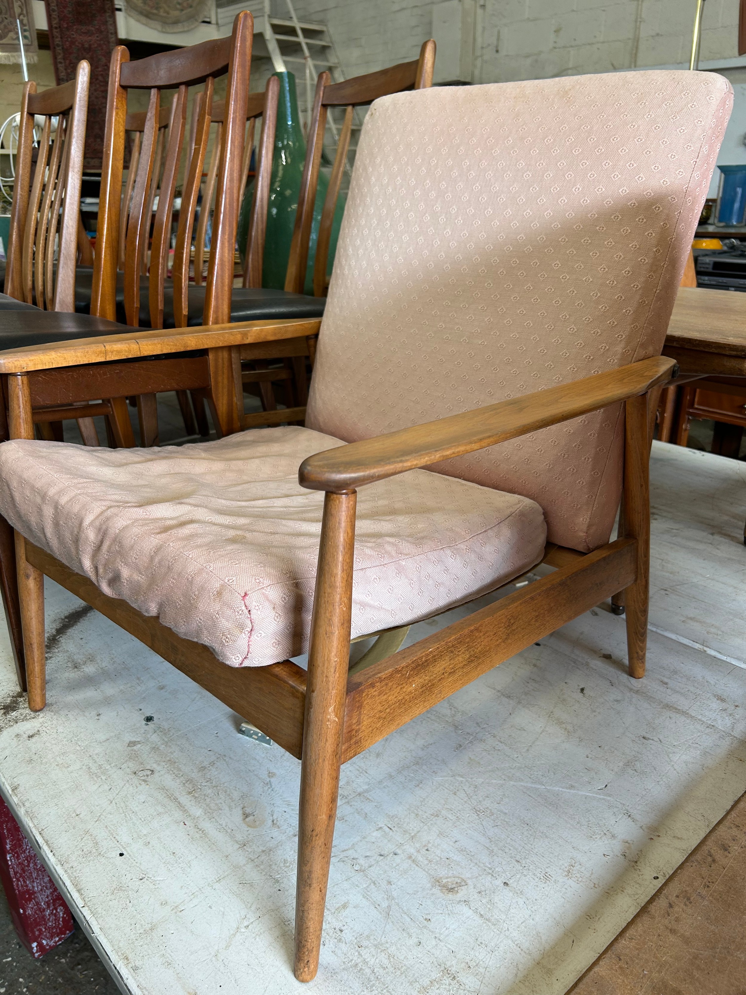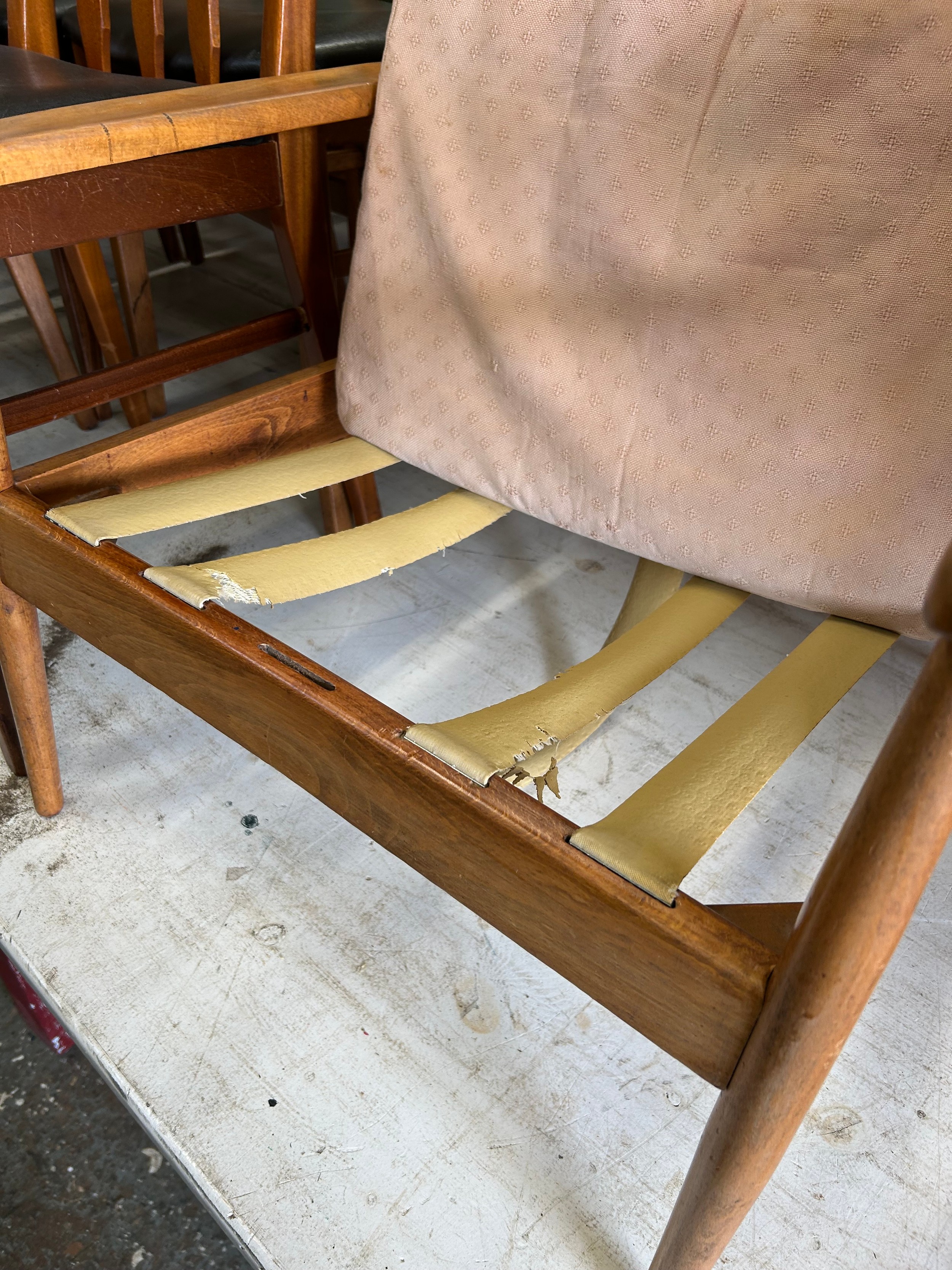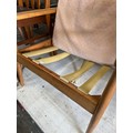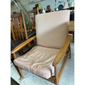 Mid Century Danish style open armchair in pale beech wood. Needs new webbing