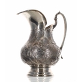 White metal jug, having repousse foliate decoration on a beaten texture ground, with cast leaf capped handle and wide spout, no marks, 8" high, 16.8oz t
