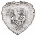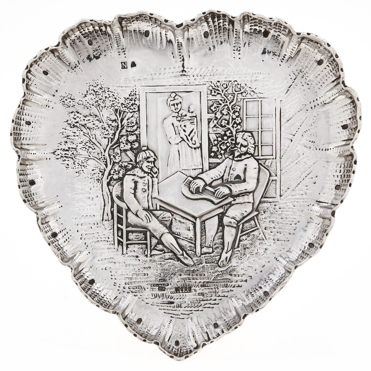 A Continental heart shaped silver dish, embossed with a seated musician and two other figures at a cottage door, 17cm, import marked, marks obscured, c1900, 5ozs 8dwts