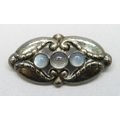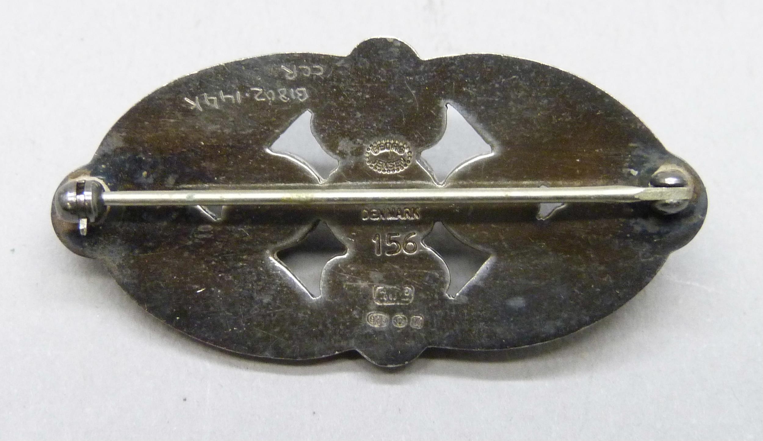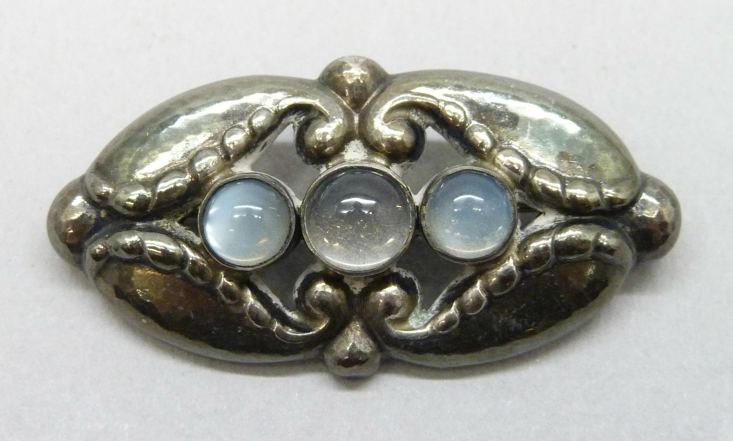 A Georg Jensen silver and moonstone brooch, No.156, with import marks, written engraving of numbers and letters verso, 9.7g, 4.3cm,