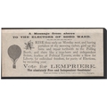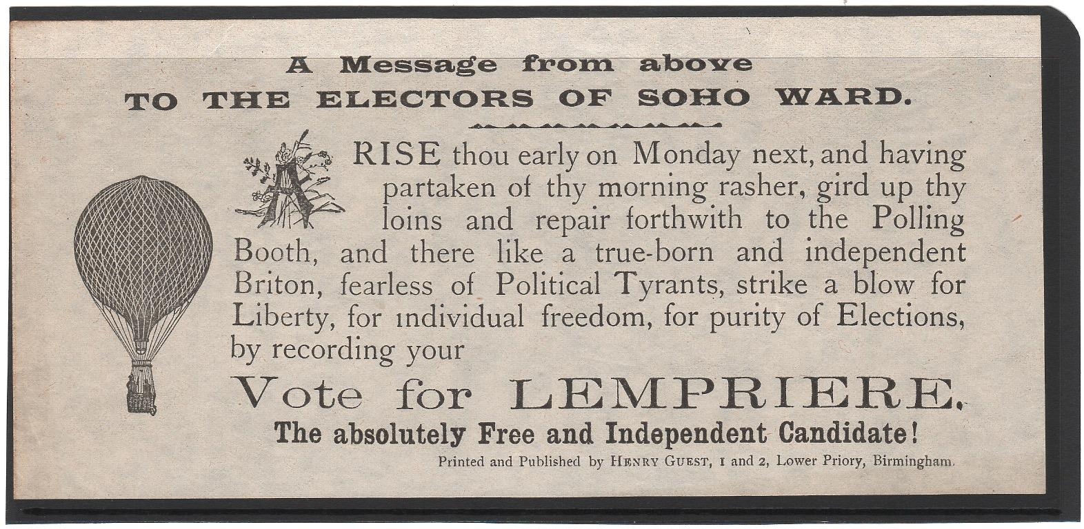 1895 Leaflet headed "A Message from above TO THE ELECTORS OF SOHO WARD", depicting a balloon, dropped from the "Saladin" balloon over Birmingham during local elections, supporting Lempriere, "the free and independent candidate". A fine and rare leaflet, 190x88mm.