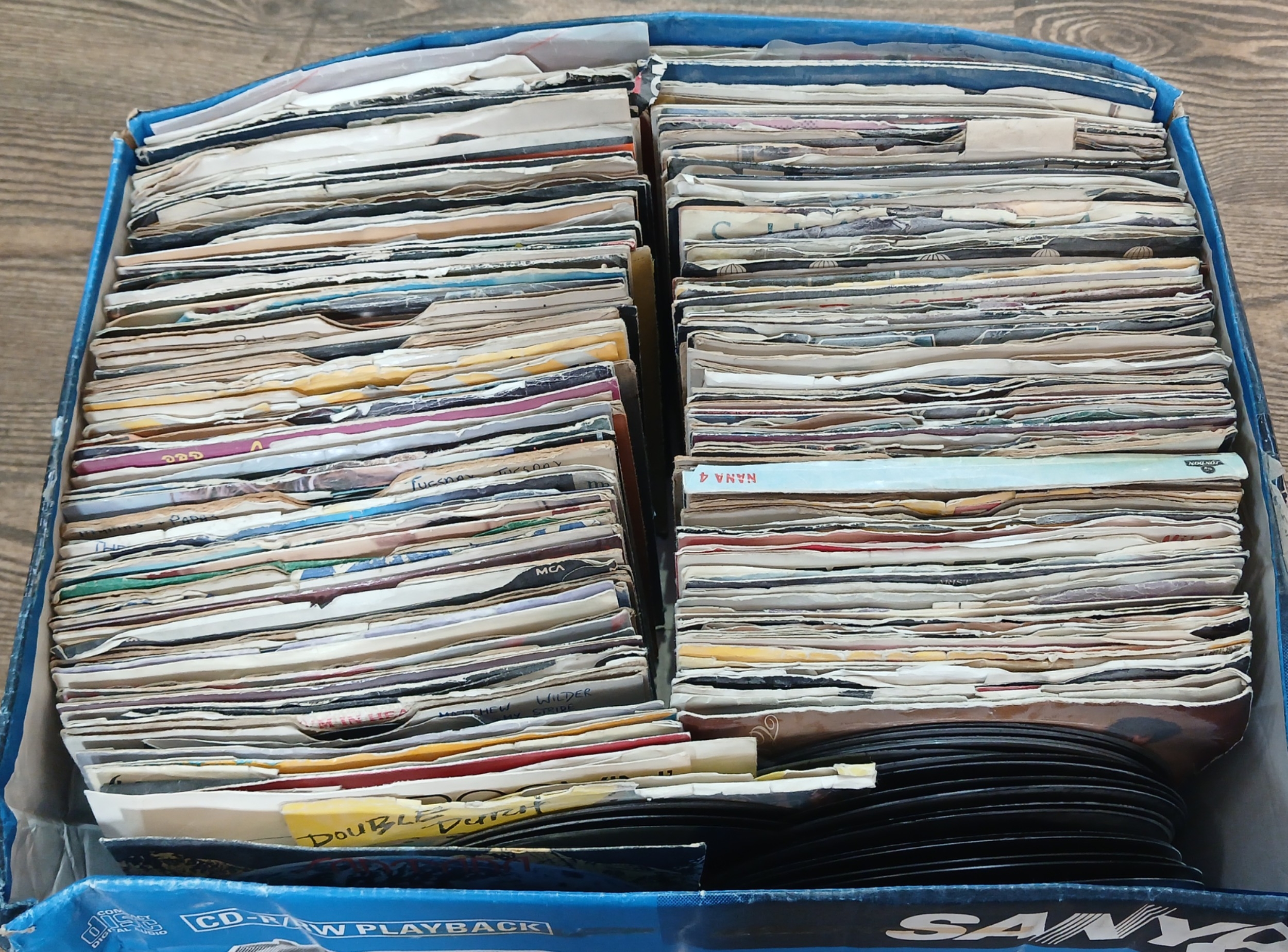 A box of assorted rock and pop 45s.
