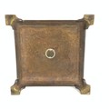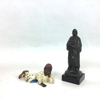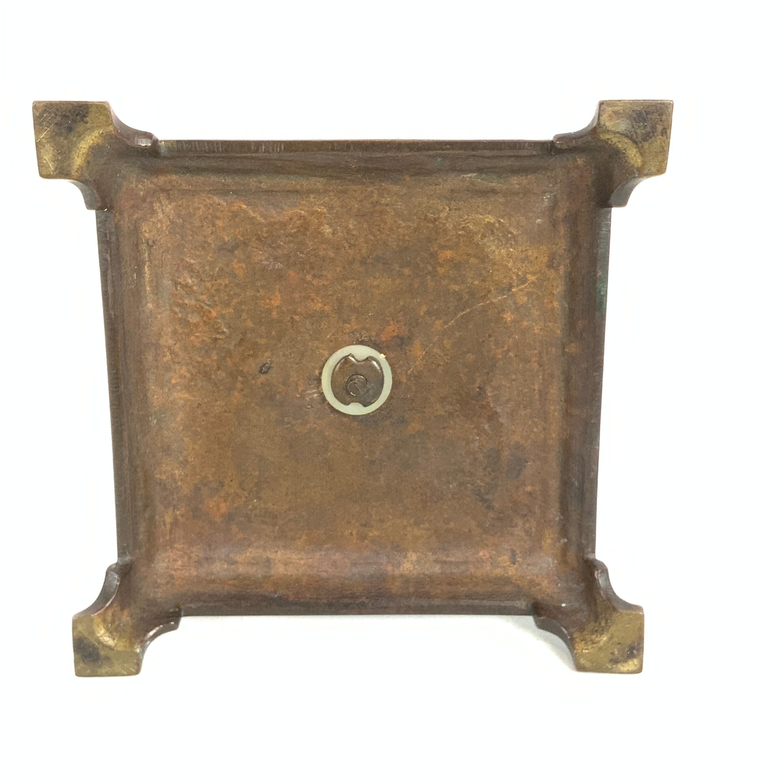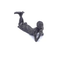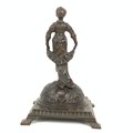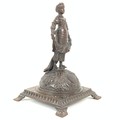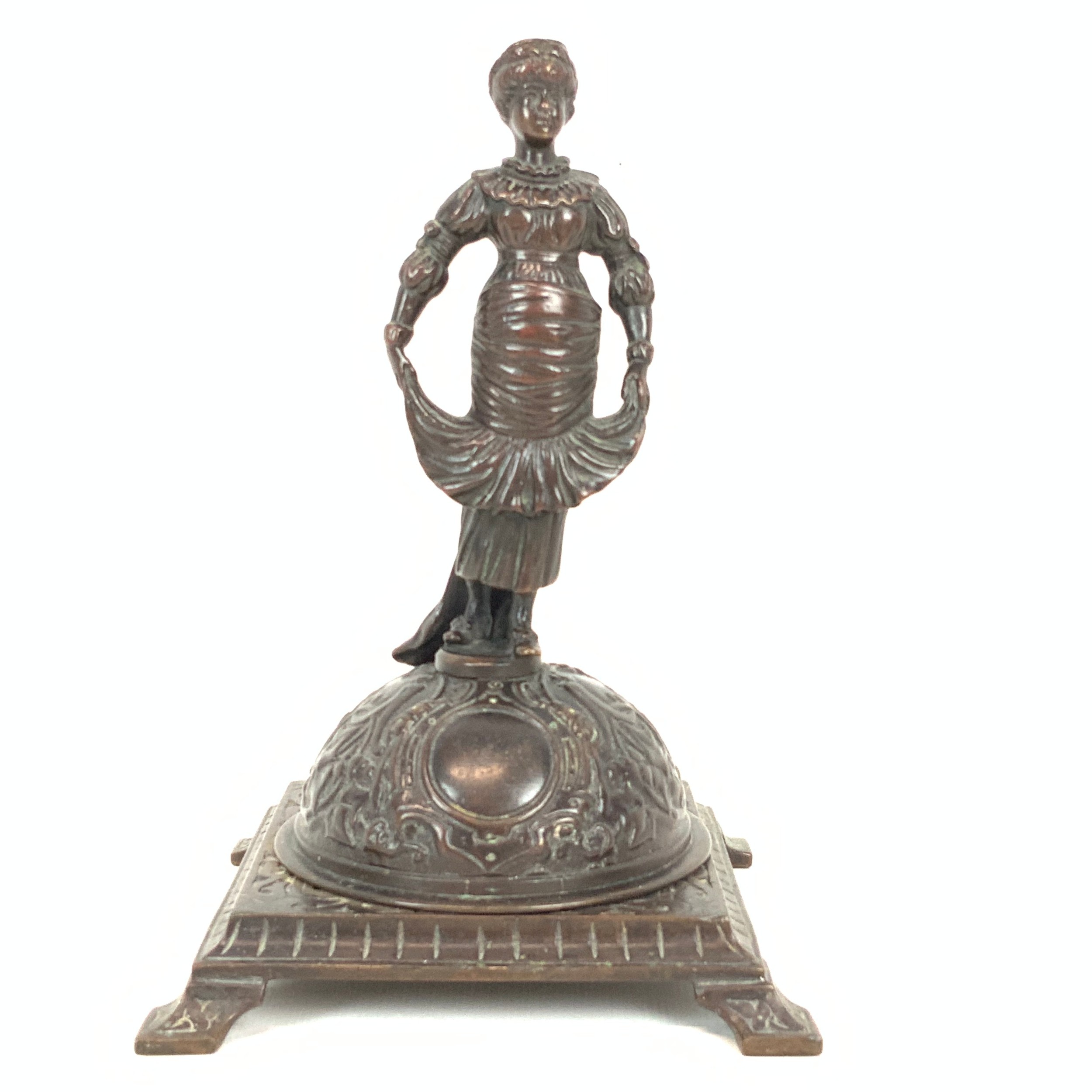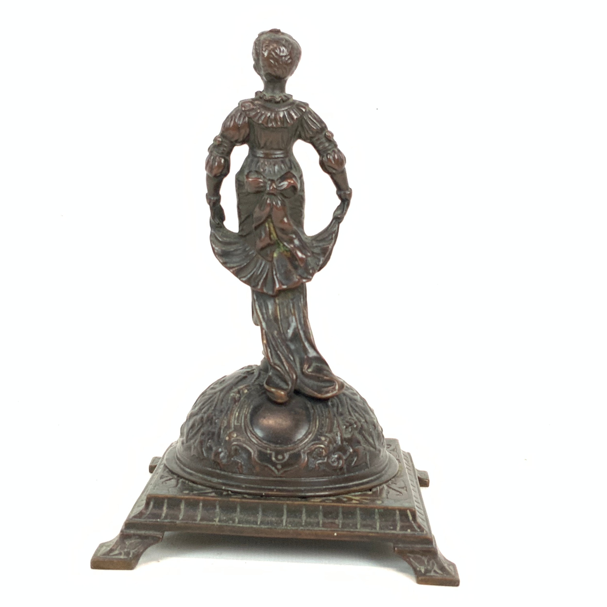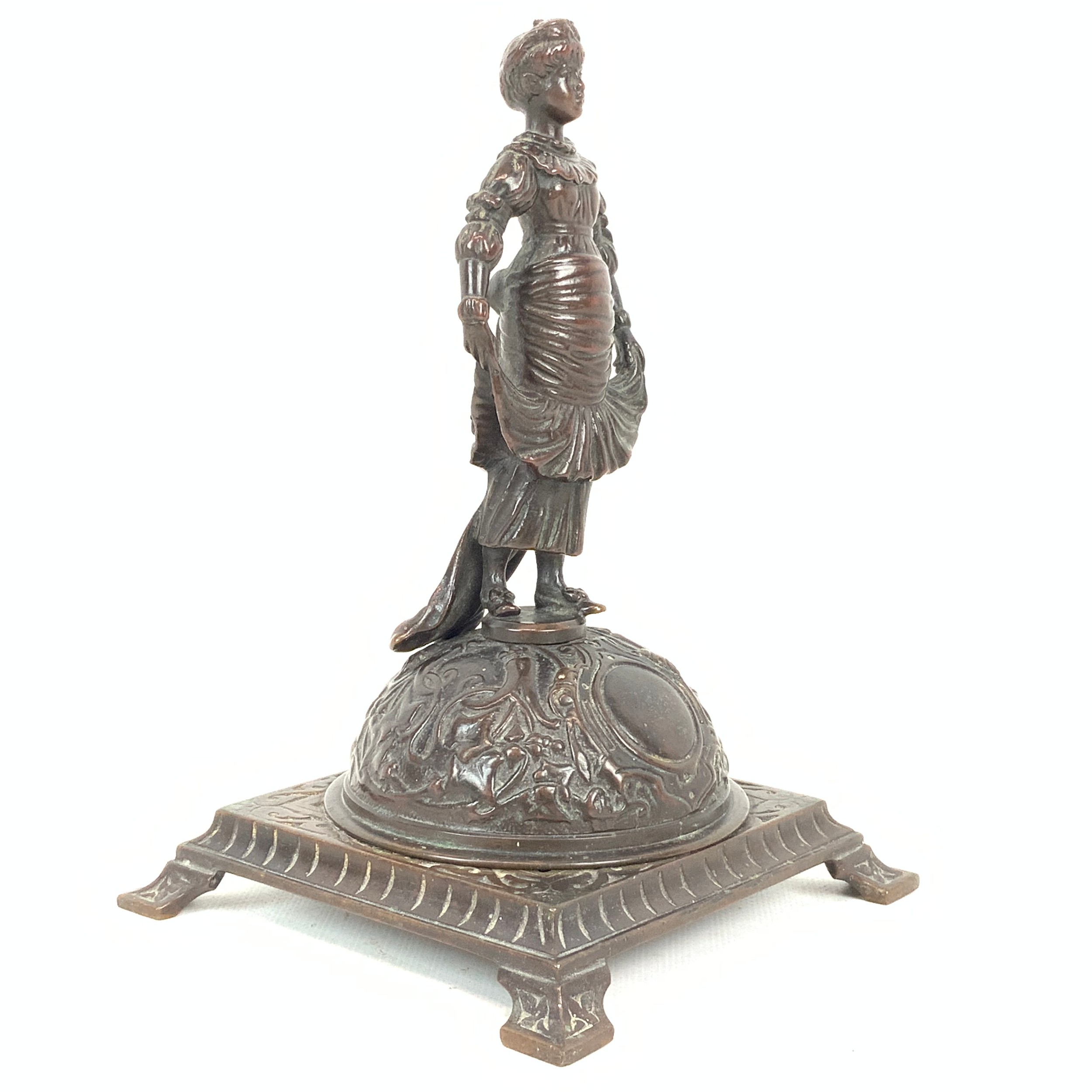 19th Century bronze figure of a lady in pose, raised on a dome with vacant cartouche, decorated with grapes and vines, set on a square stepped base on four corner bracket supports. H16cm.