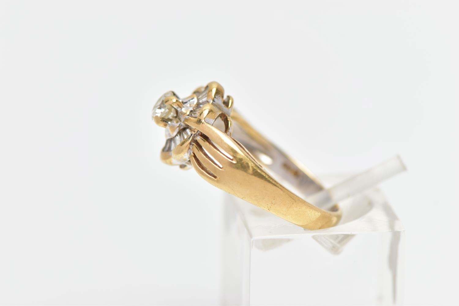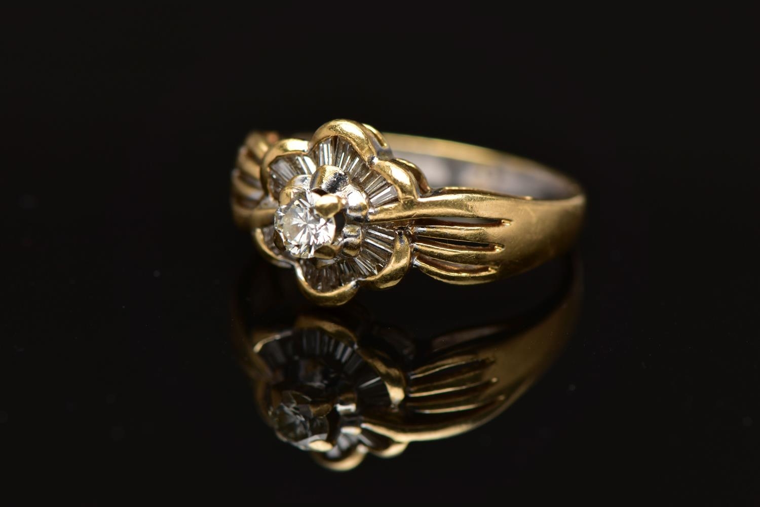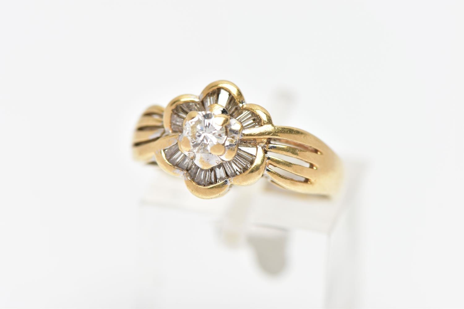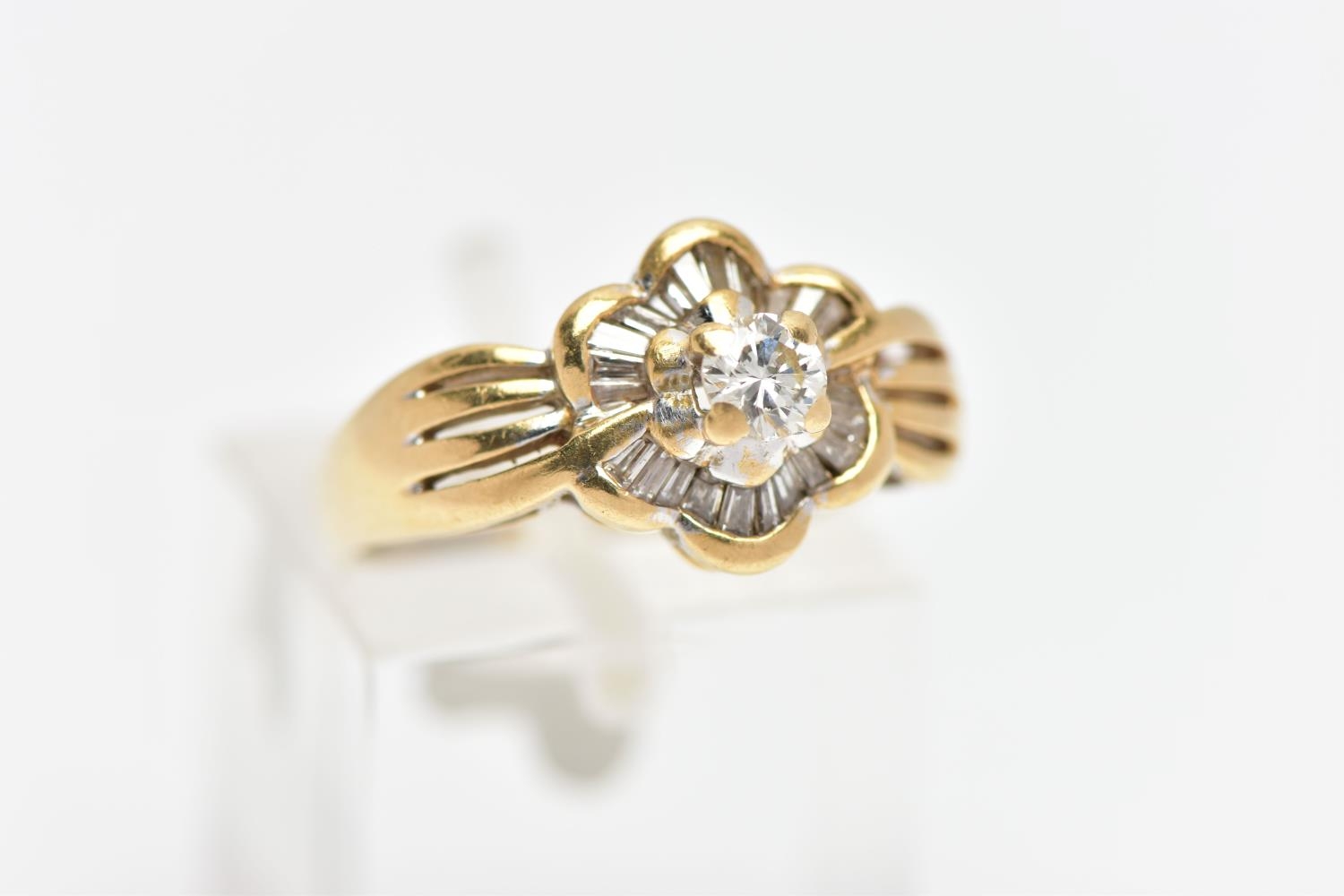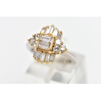 A MODERN YELLOW METAL DIAMOND CLUSTER RING, set with a principal round brilliant cut diamond, within an undulating surround of approximately twenty four tapered baguette cut diamonds, to the four row split shoulders and plain band, estimated principal diamond weight 0.20ct, colour assessed as I-J, clarity assessed as VS, estimated total diamond weight of the surrounding stones 0.24ct, ring stamped 18k m 13, ring size L 1/2, approximate gross weight 4.9 grams (Condition report: overall condition good, diamonds bright and lively)