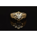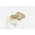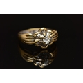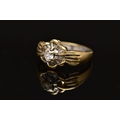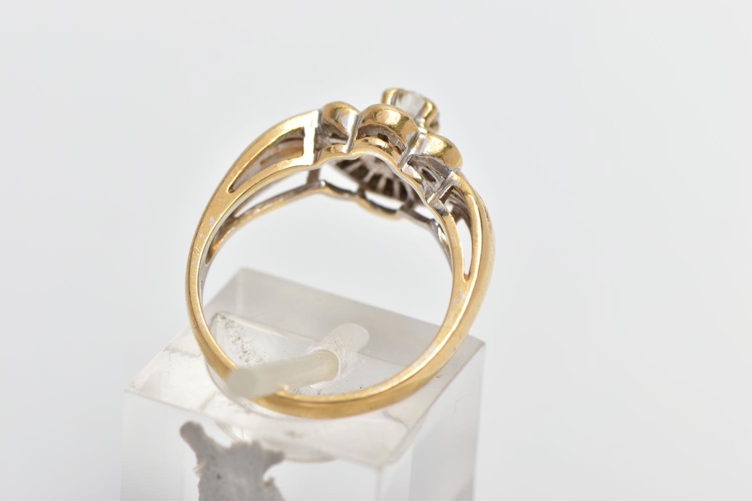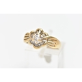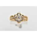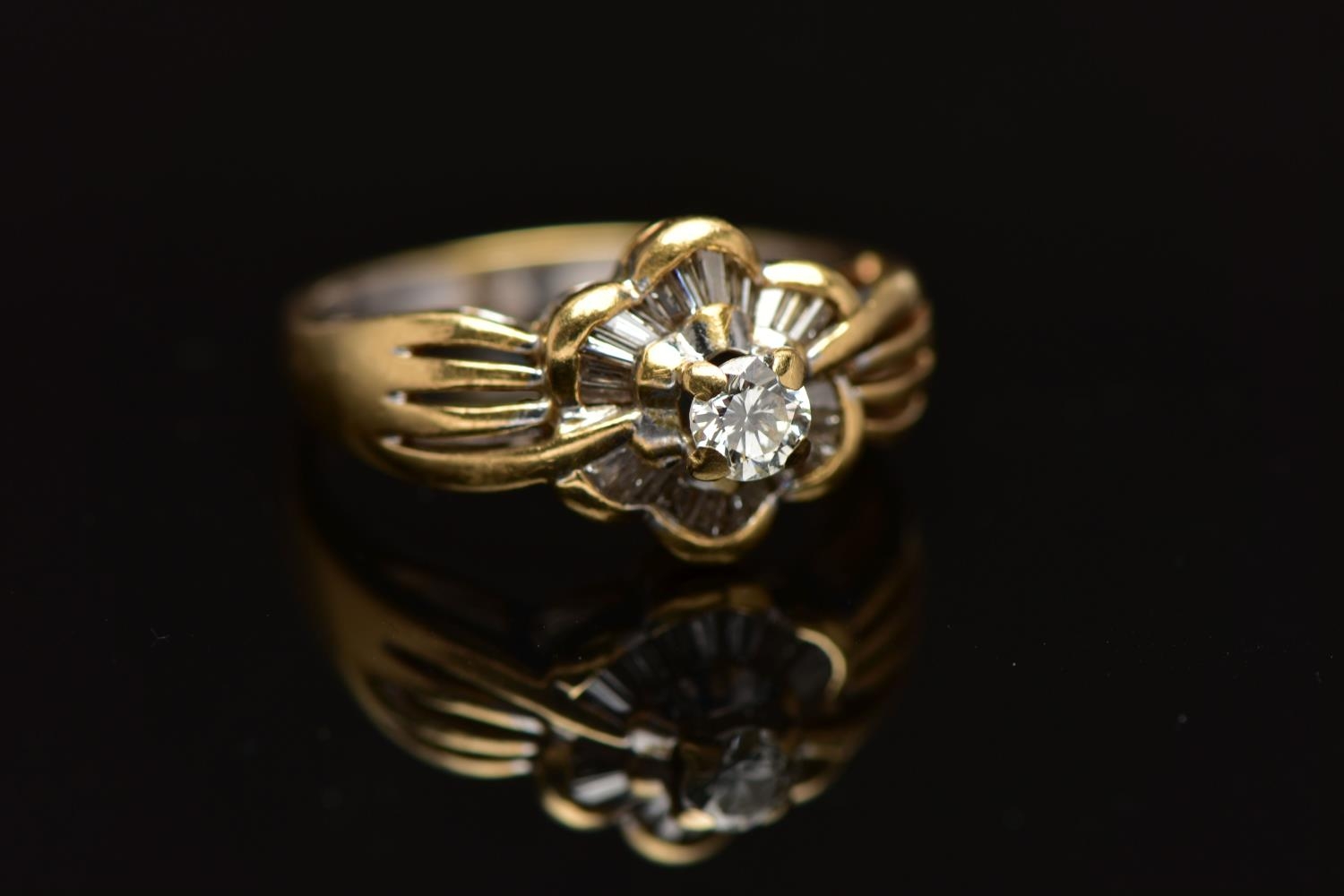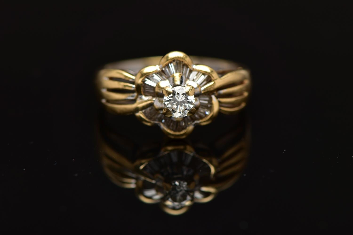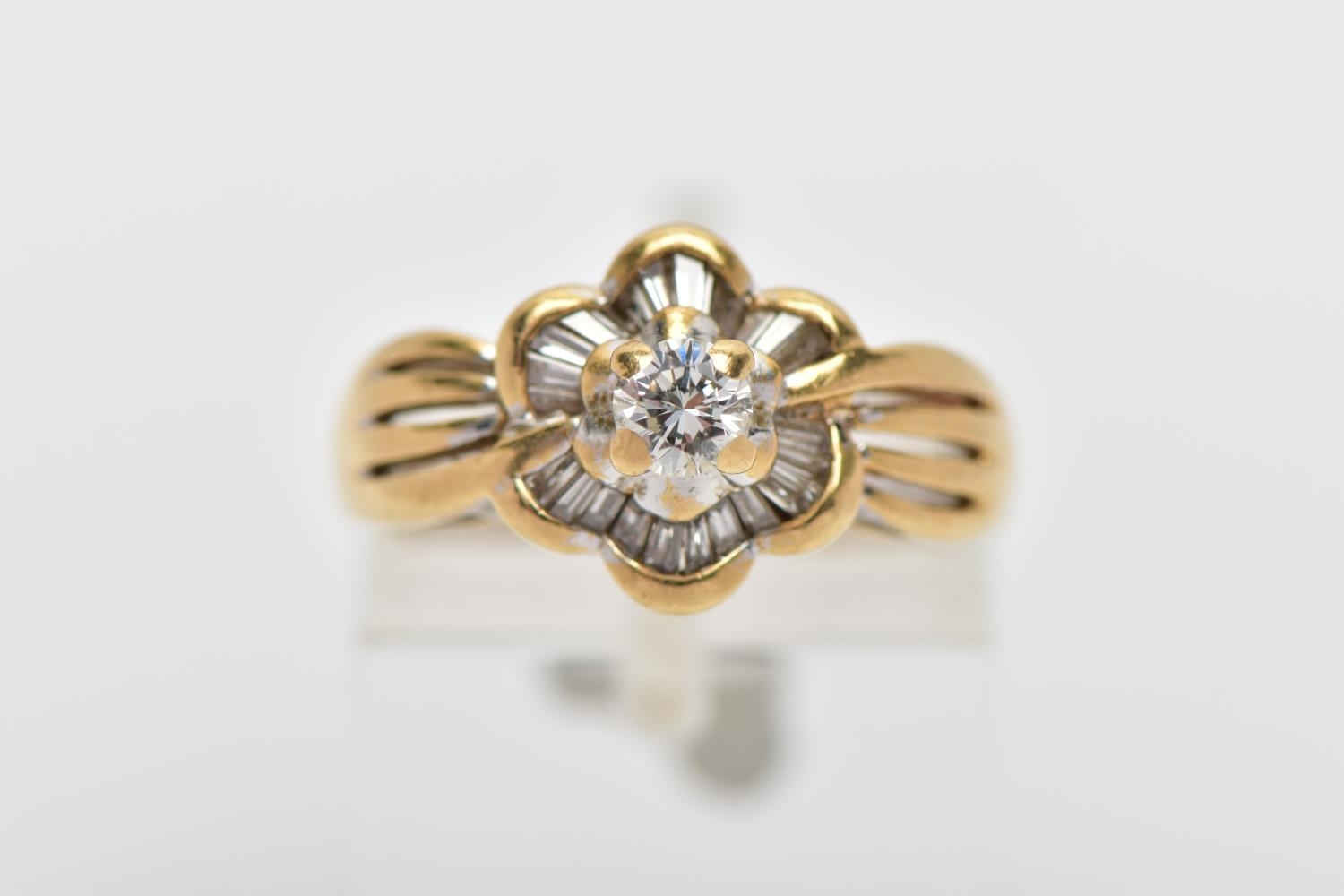 A MODERN YELLOW METAL DIAMOND CLUSTER RING, set with a principal round brilliant cut diamond, within an undulating surround of approximately twenty four tapered baguette cut diamonds, to the four row split shoulders and plain band, estimated principal diamond weight 0.20ct, colour assessed as I-J, clarity assessed as VS, estimated total diamond weight of the surrounding stones 0.24ct, ring stamped 18k m 13, ring size L 1/2, approximate gross weight 4.9 grams (Condition report: overall condition good, diamonds bright and lively)