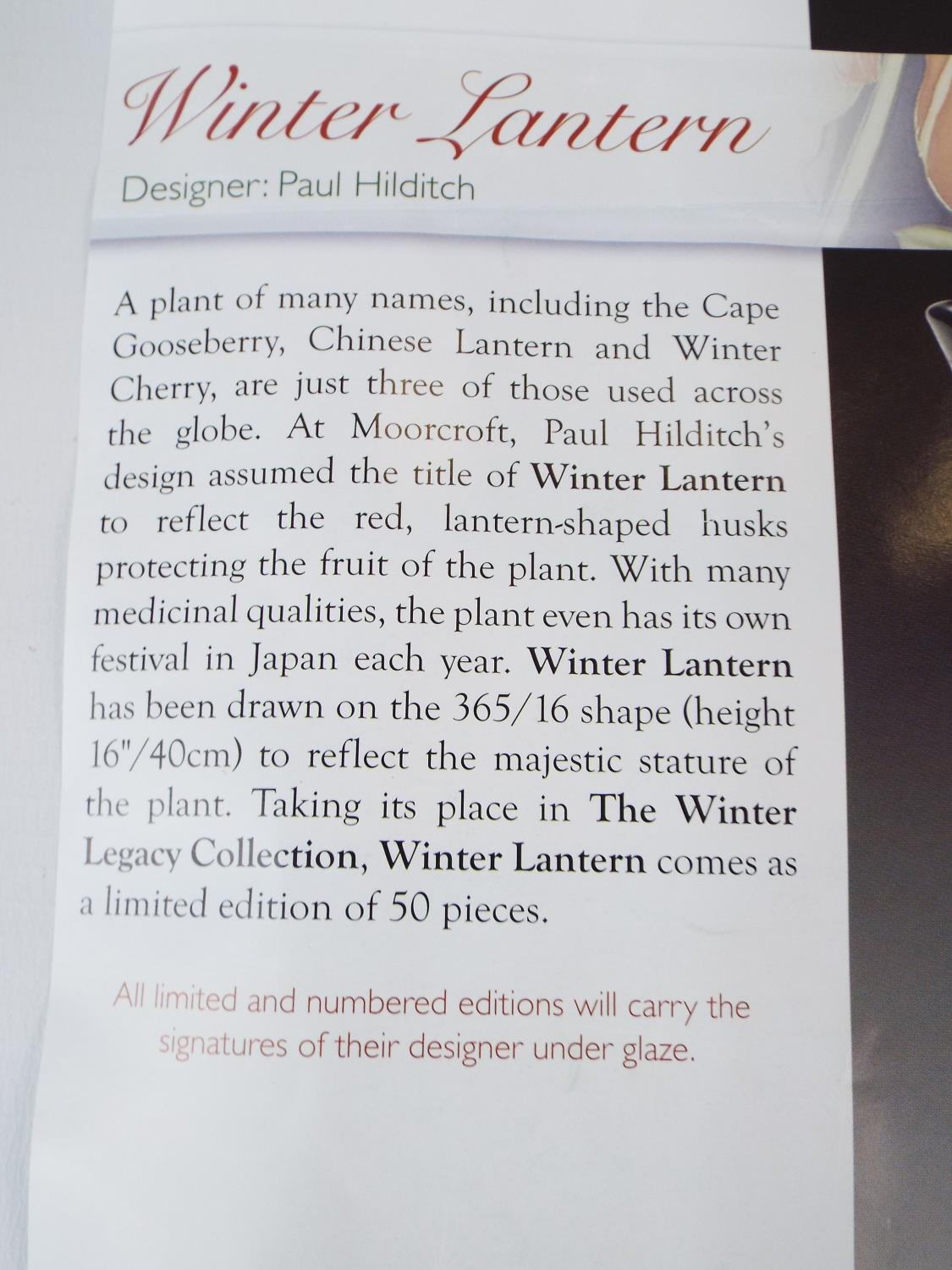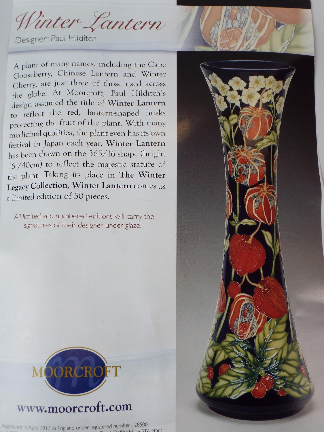 Very Ltd Edition, 36/50 2013 Moorcroft Vase in the Winters Lantern design. Signed by Paul Hilditch. 16 inches tall..Bought new for £1150 Excellent conditon free from any faults. With Box