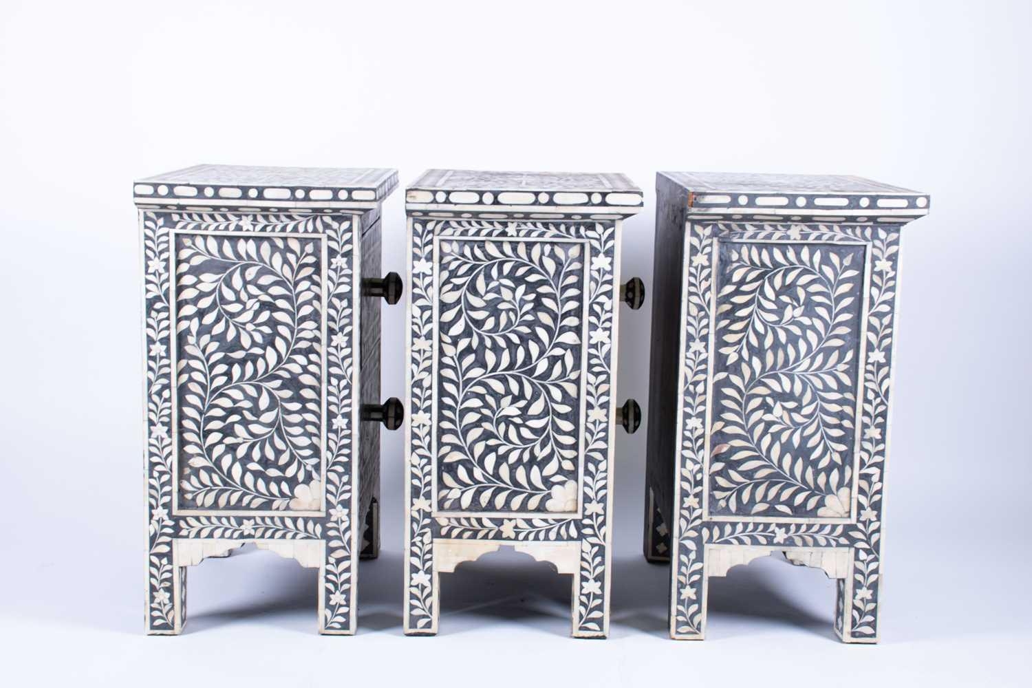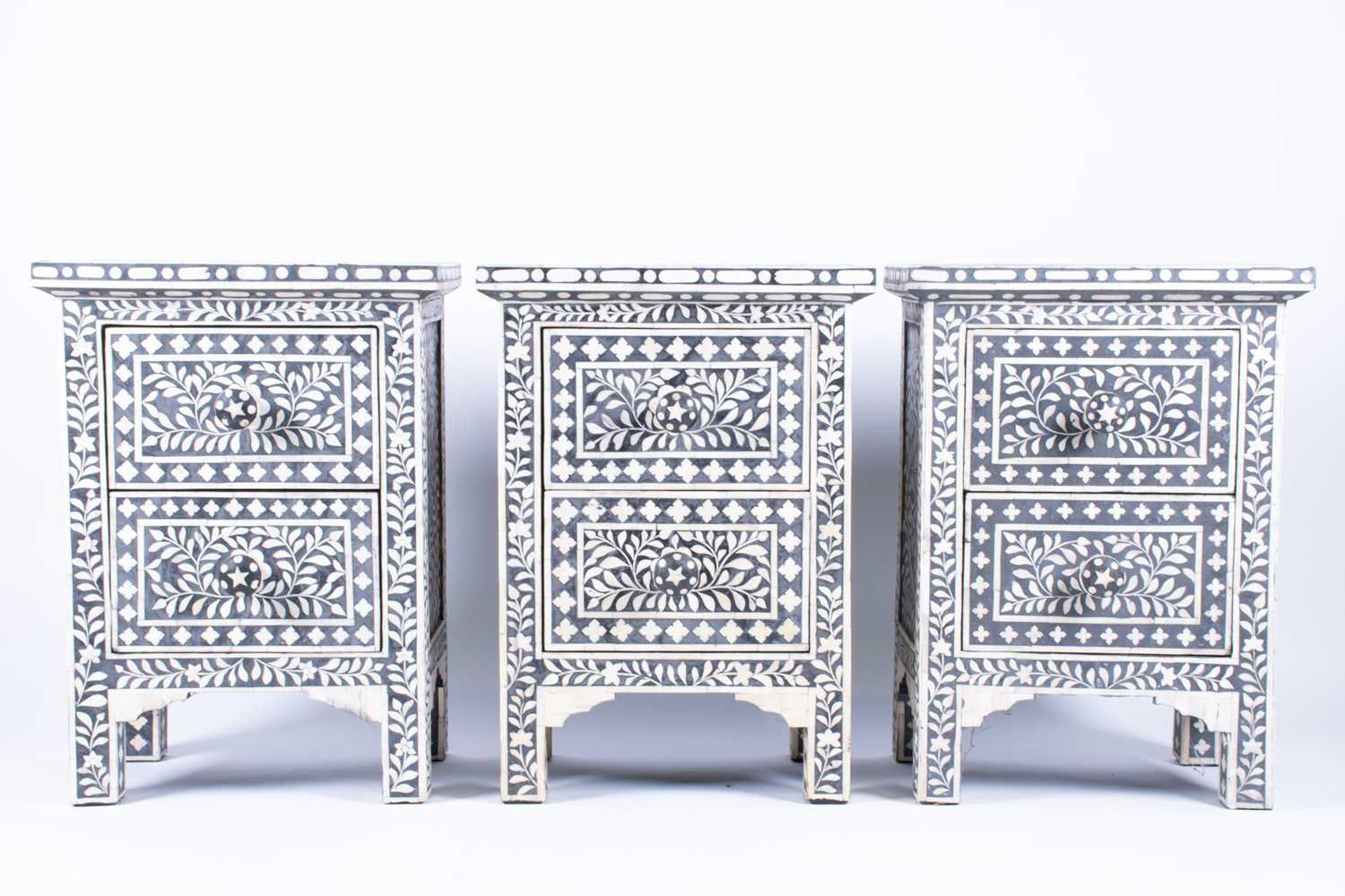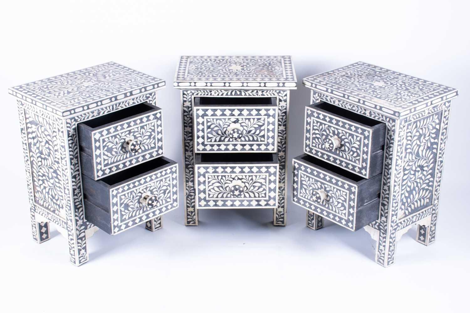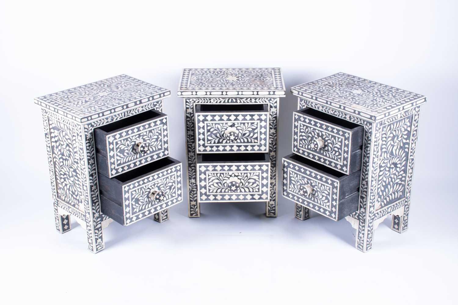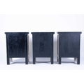 A set of three ebonised and bone inlaid narrow chests each with two drawers, on plain legs. (Dimensions: 61 cm high x 44 cm x 30 cm) (Qty: 3)