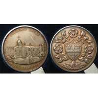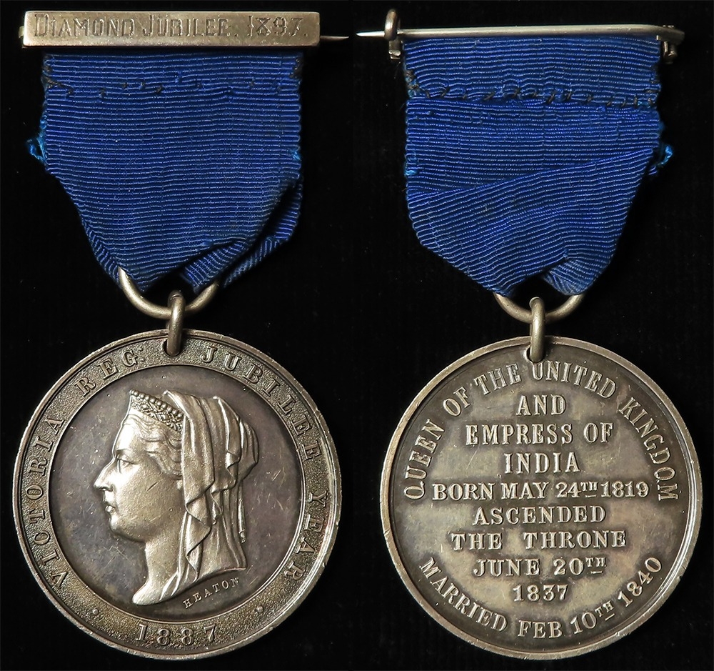 British Commemorative Medal / Society Jewel, unmarked silver d.38.5mm, c.22g (disc weight): Queen Victoria Golden Jubilee 1887 (medal) by Heaton, suspended from a ribbon with engraved white metal pin bar, and engraved on edge 'HEDLEY. H. HOSKING'. EF, a few surface marks.