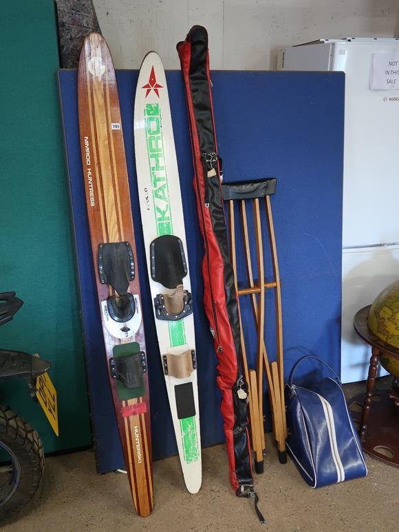 WATERSKIS, CRUTCHES, SKIIS, BOOTS IN BAG