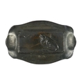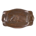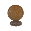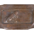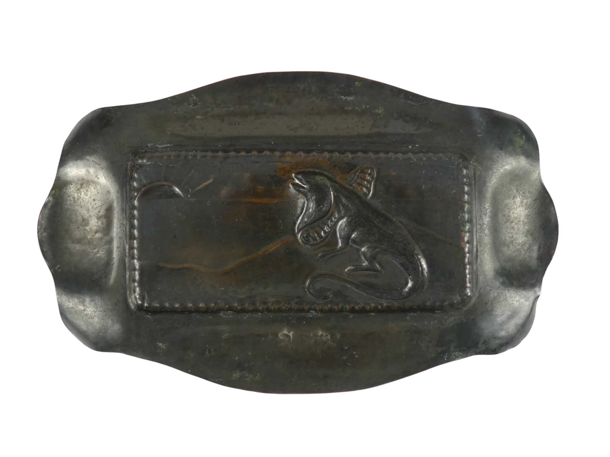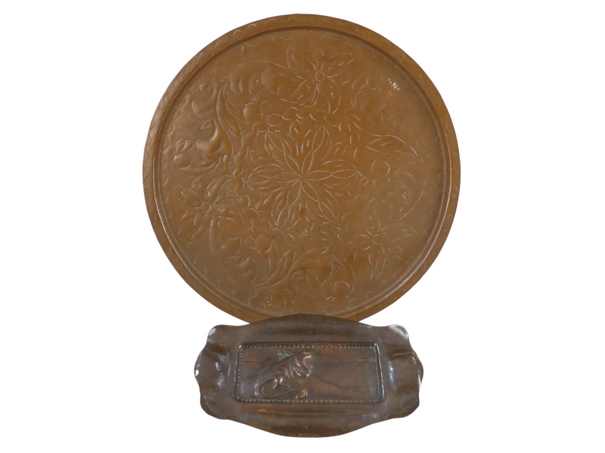 A copper repousse rectangular tray - decorated with a lizard, 21cm wide, together with another circular tray. (2)