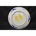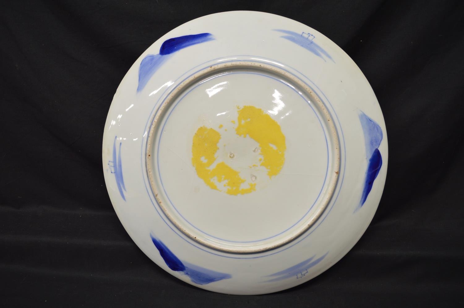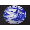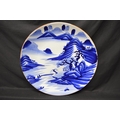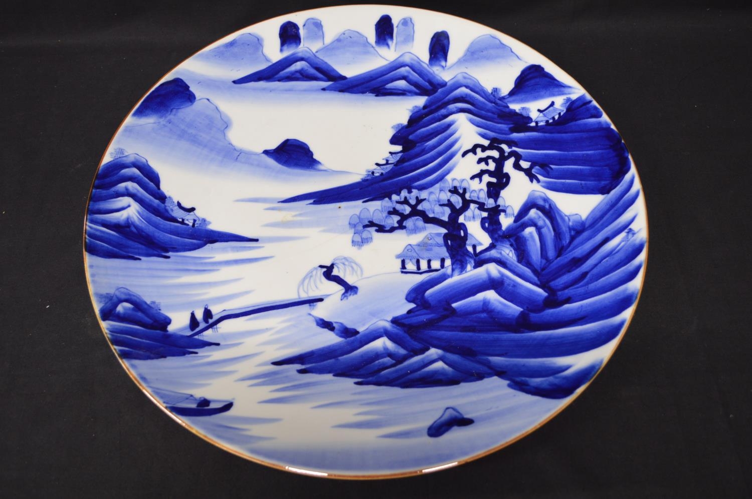 Possibly Chinese blue and white charger decorated with scene of river, mountains and buildings - 18.25" dia