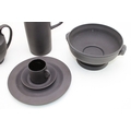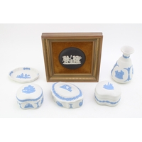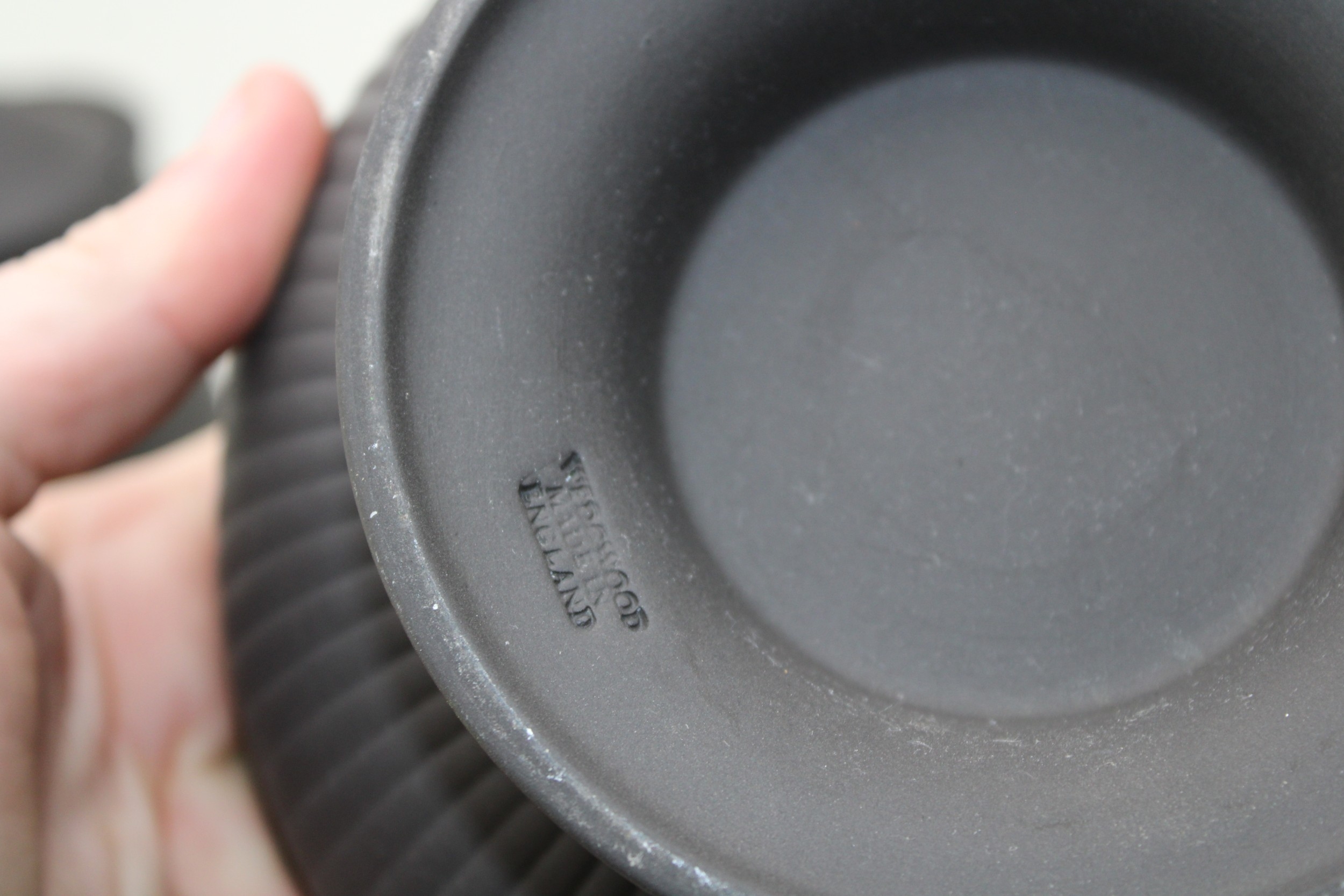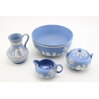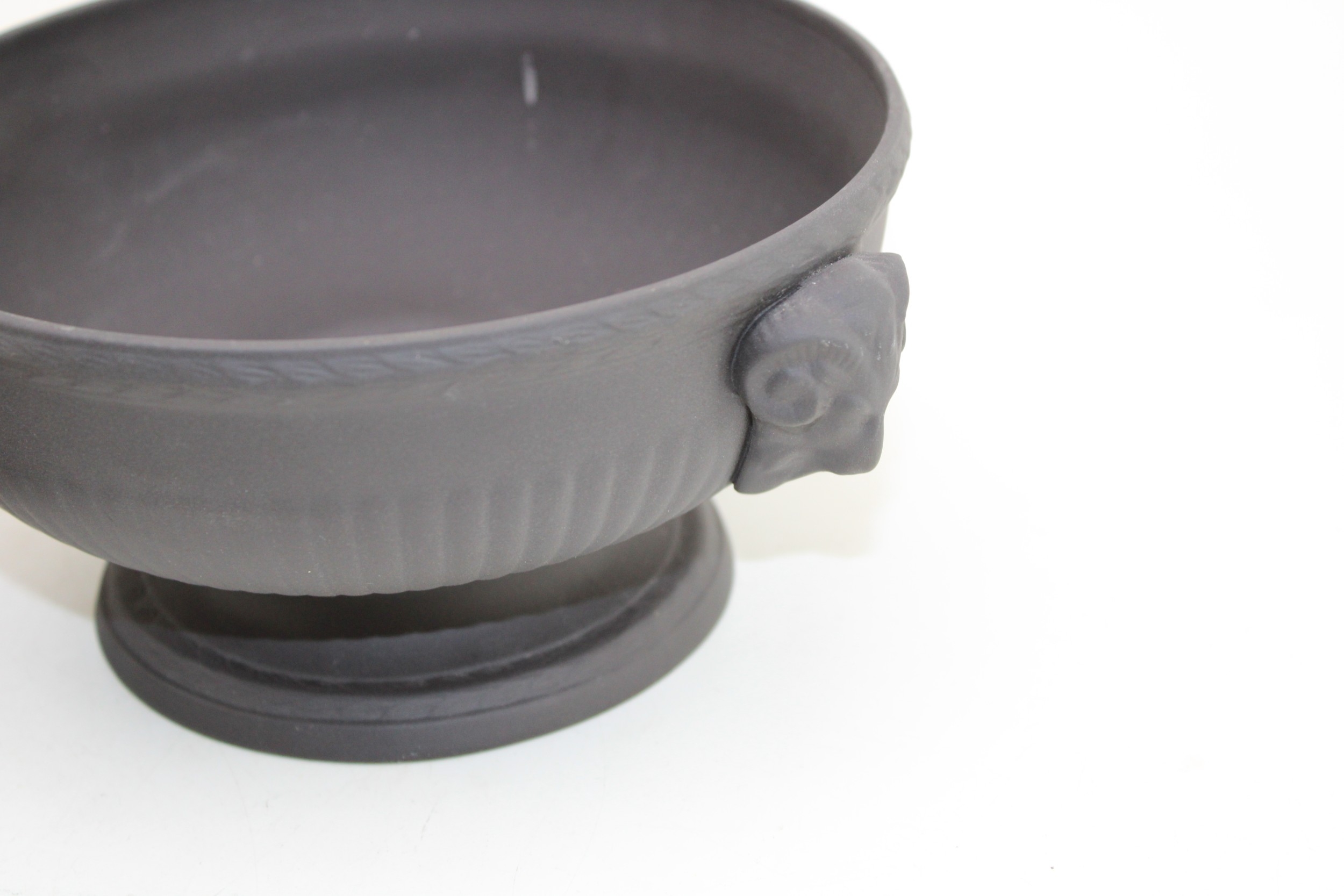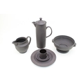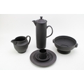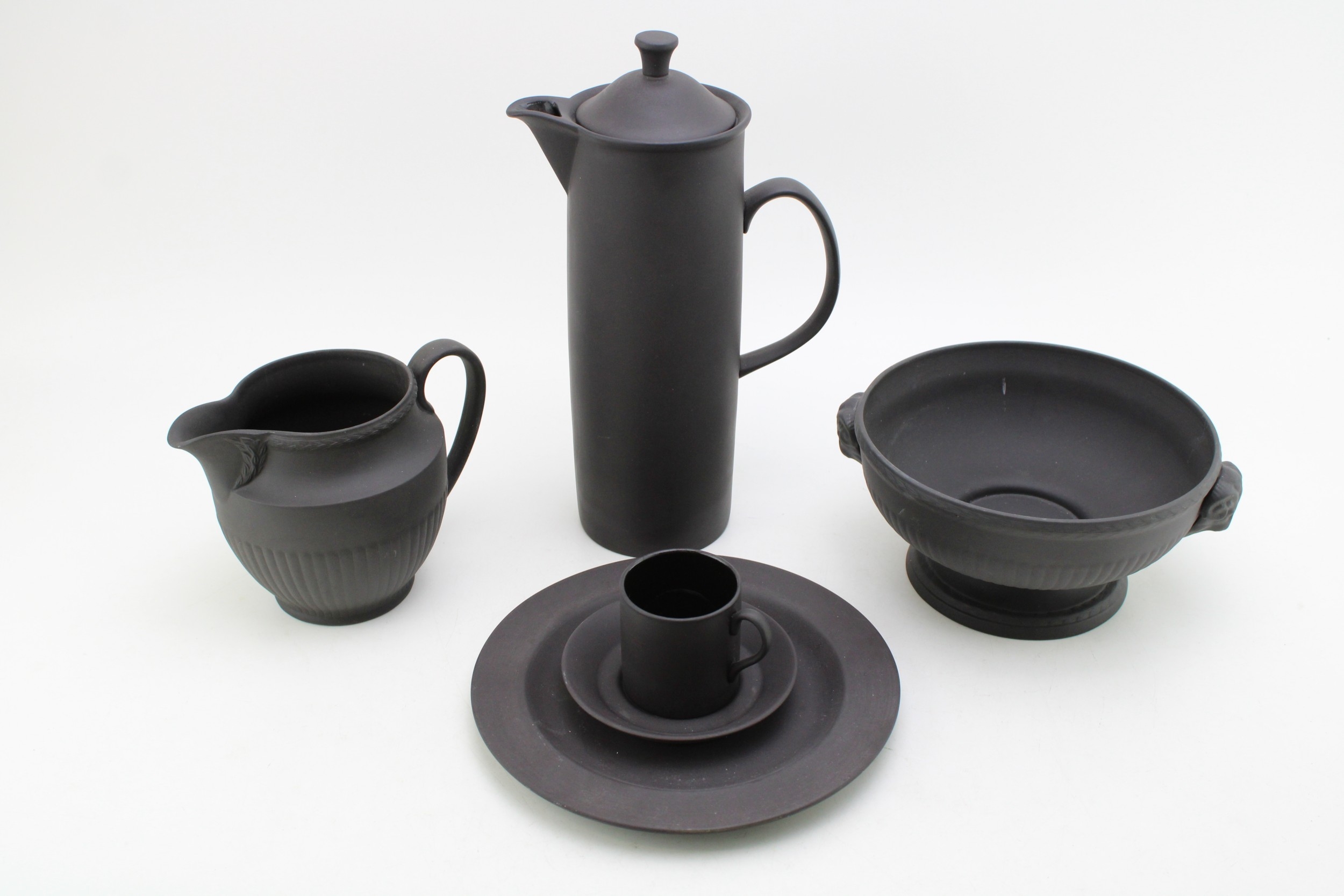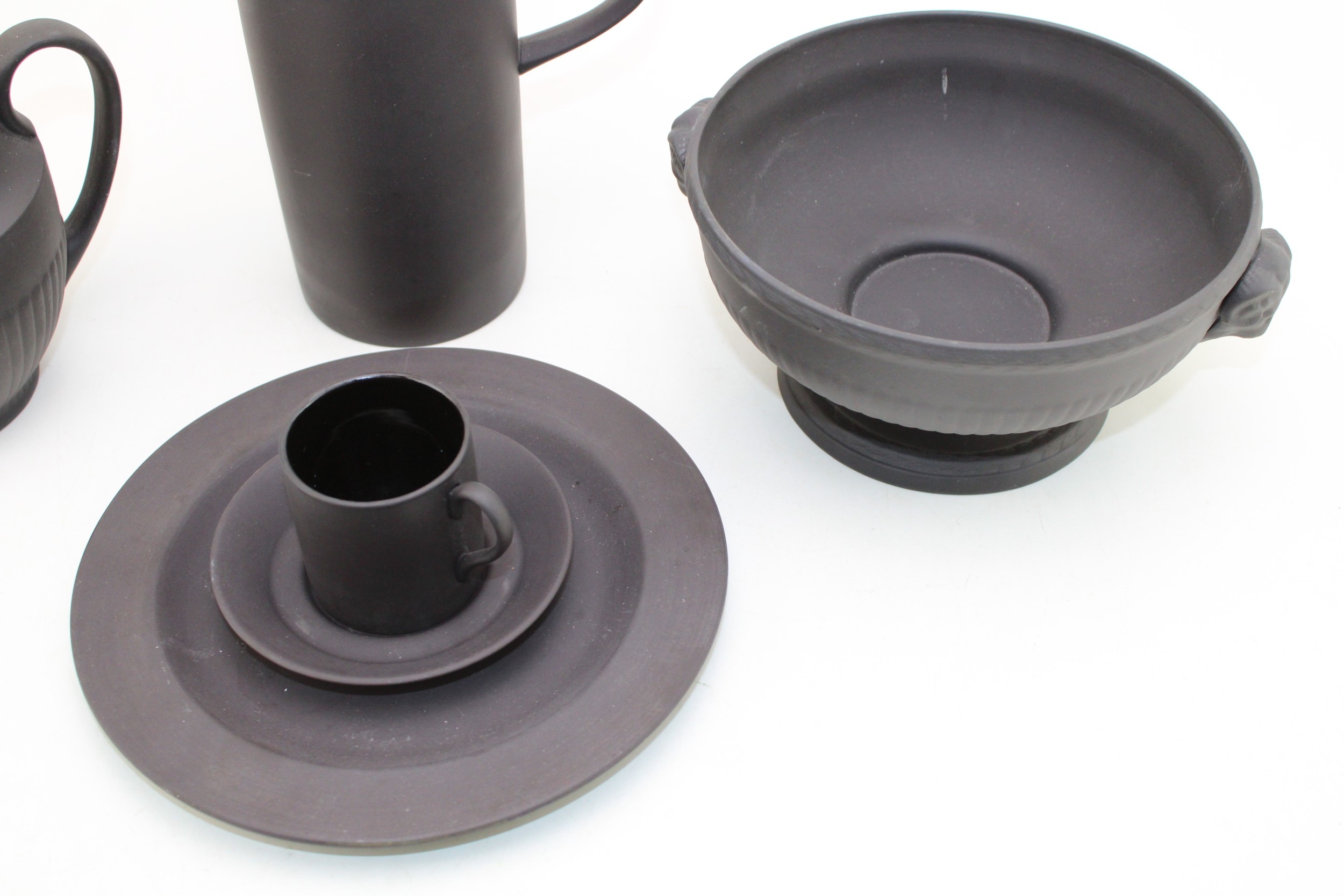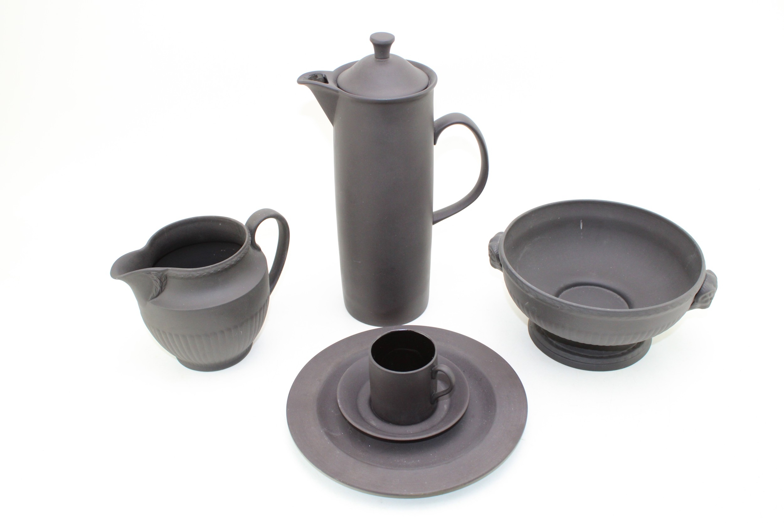 Wedgwood Black Basalt porcelain to include a Bowl with Ram terminals, Lidded Coffee Pot, Cup and Saucer, Jug and Plate (5).