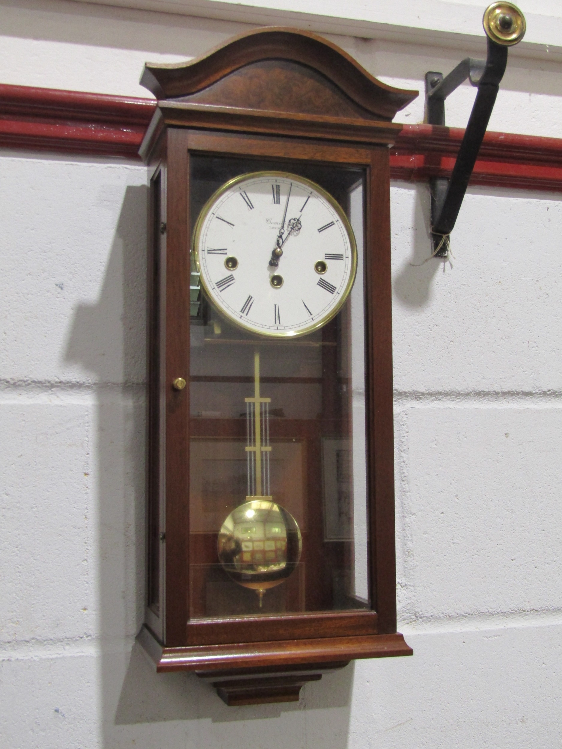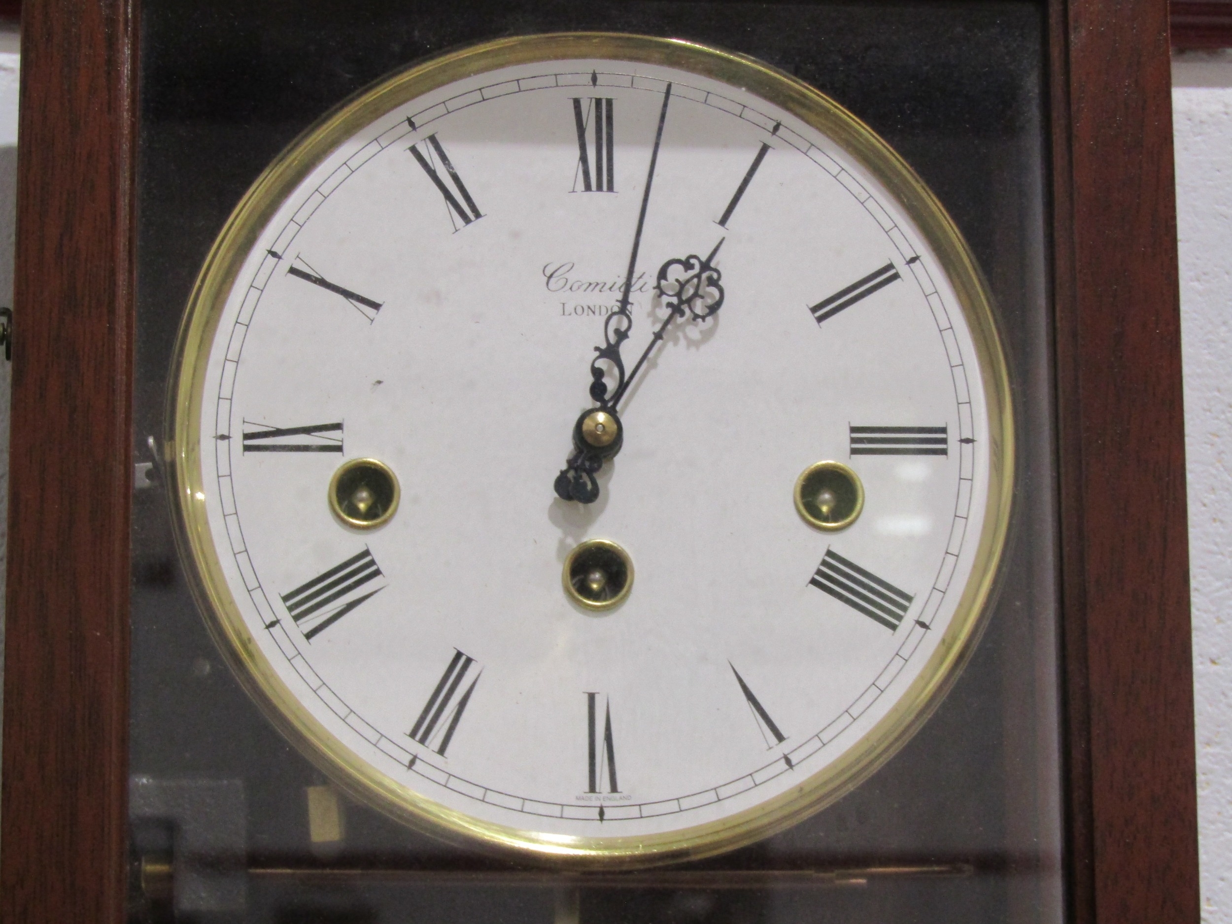 A Comitti London wall clock with key and pendulum