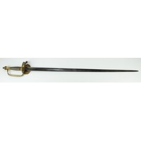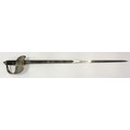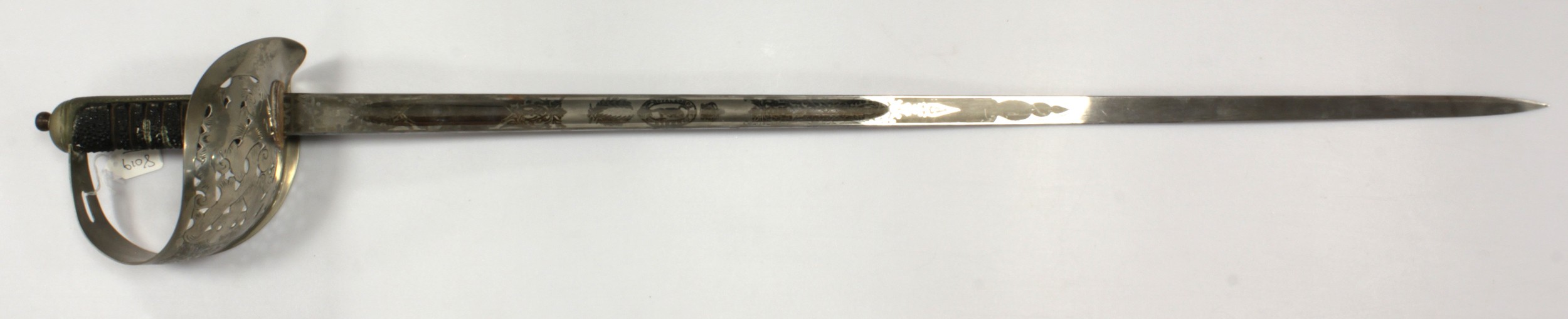 Sword: A good George VI Pattern 1897 infantry officer's sword. Blade 32". Ricasso maker marked "ALKIT LTD CAMBRIDGE CIRCUS LONDON WC2." Blade etched "Royal Corps of Signals." Wirebound fishskin grip. Steel guard with George VI cipher. No scabbard. Sword in excellent condition.