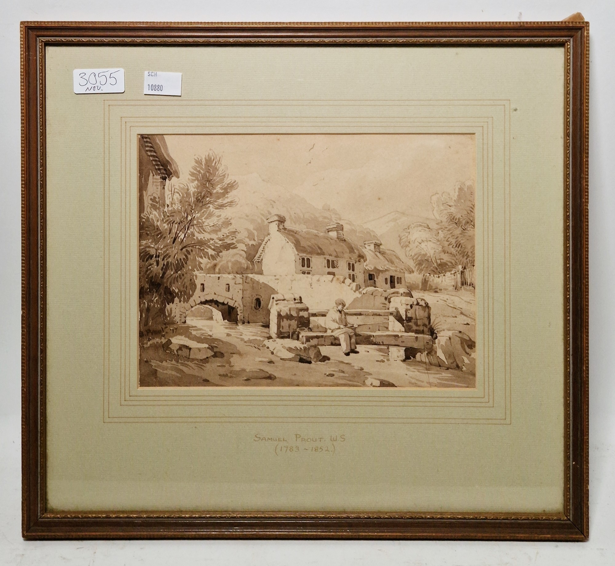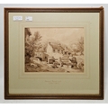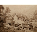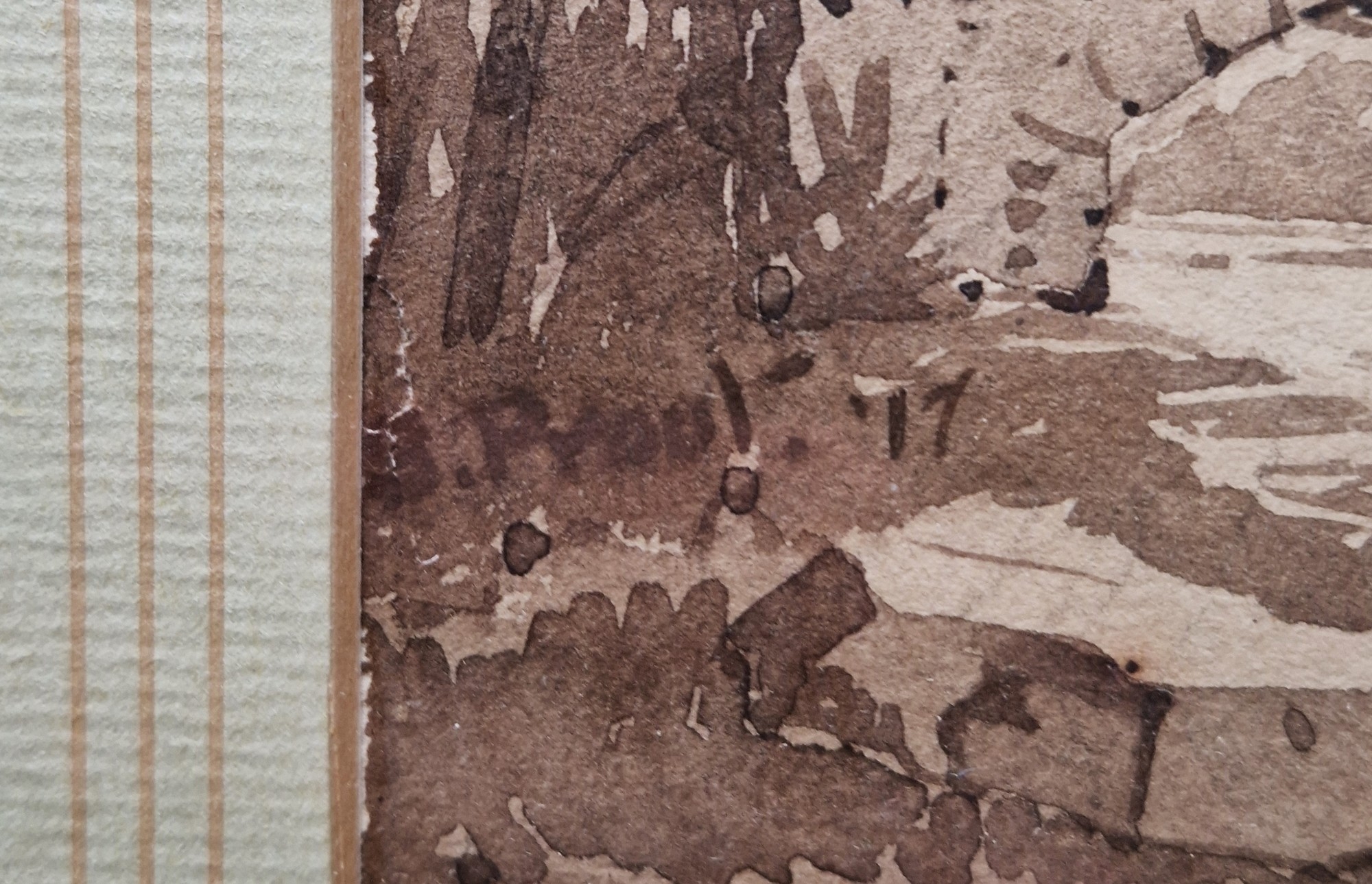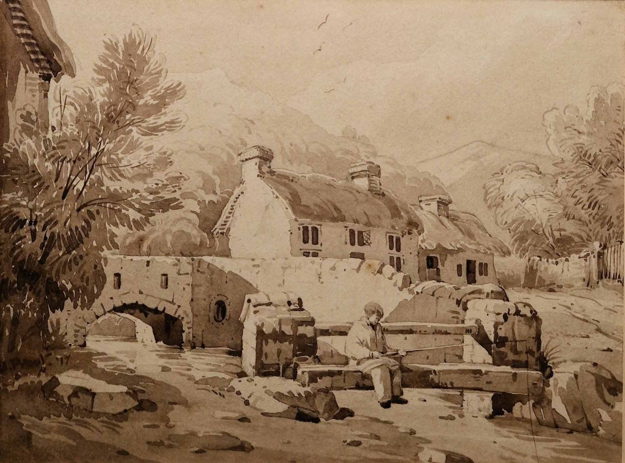 Rural scene with boy seated on bridge fishing, signed and dated '17 lower left, framed and glazed, mount aperture 17.5cm x 23.5cm