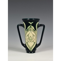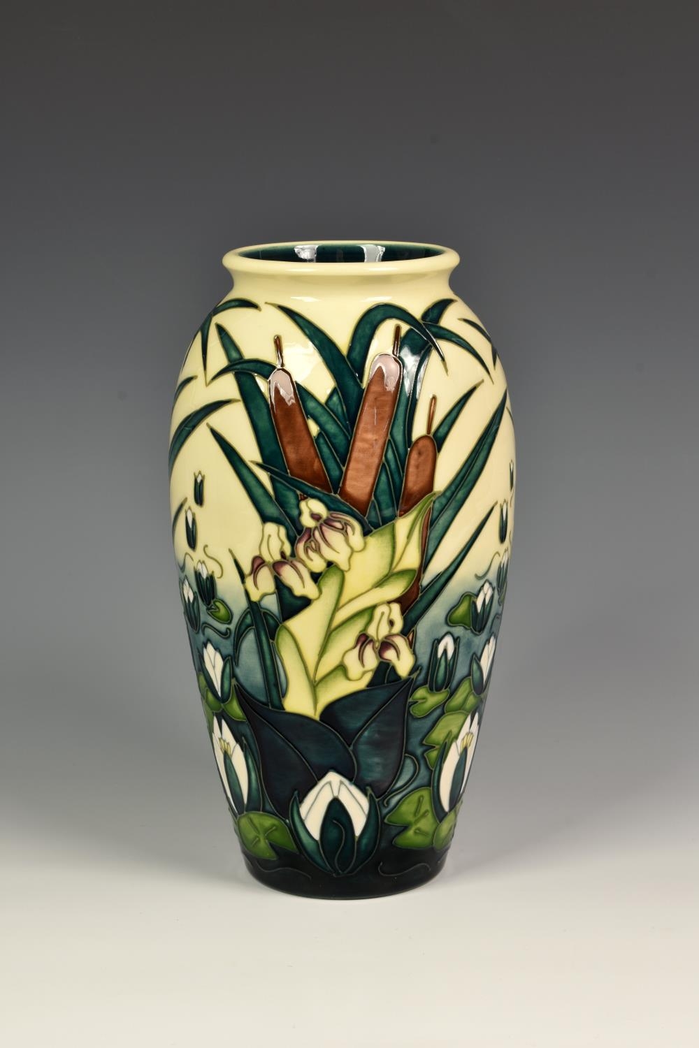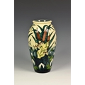 A Moorcroft Pottery 'Lamia' pattern vase, of slender ovoid form, tubeline decorated in the Lamia pattern, depicting a pond scene with reeds and lilies on cream / blue ground, designed by Rachel Bishop, c.1995, painted and impressed marks to base, 10in. (25.4cm.) high.