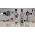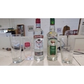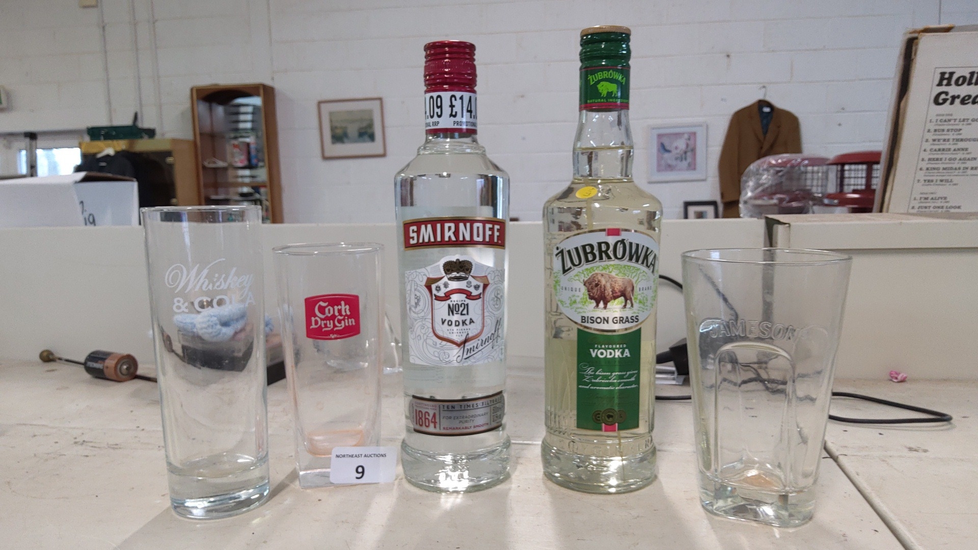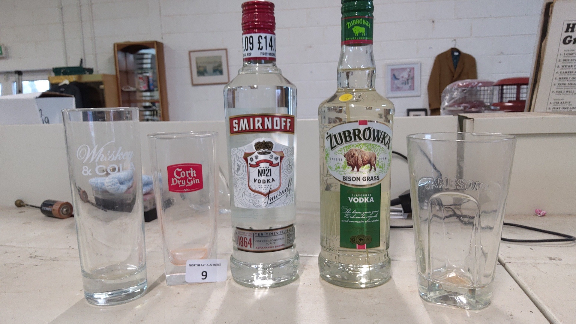 Group of two 500ml spirit bottles (unopened), comprising Smirnoff No.21 vodka and Żubrówka Bison Grass flavoured vodka, with three branded drinking glasses: Whiskey & Cola, Cork Dry Gin, and Jameson.