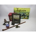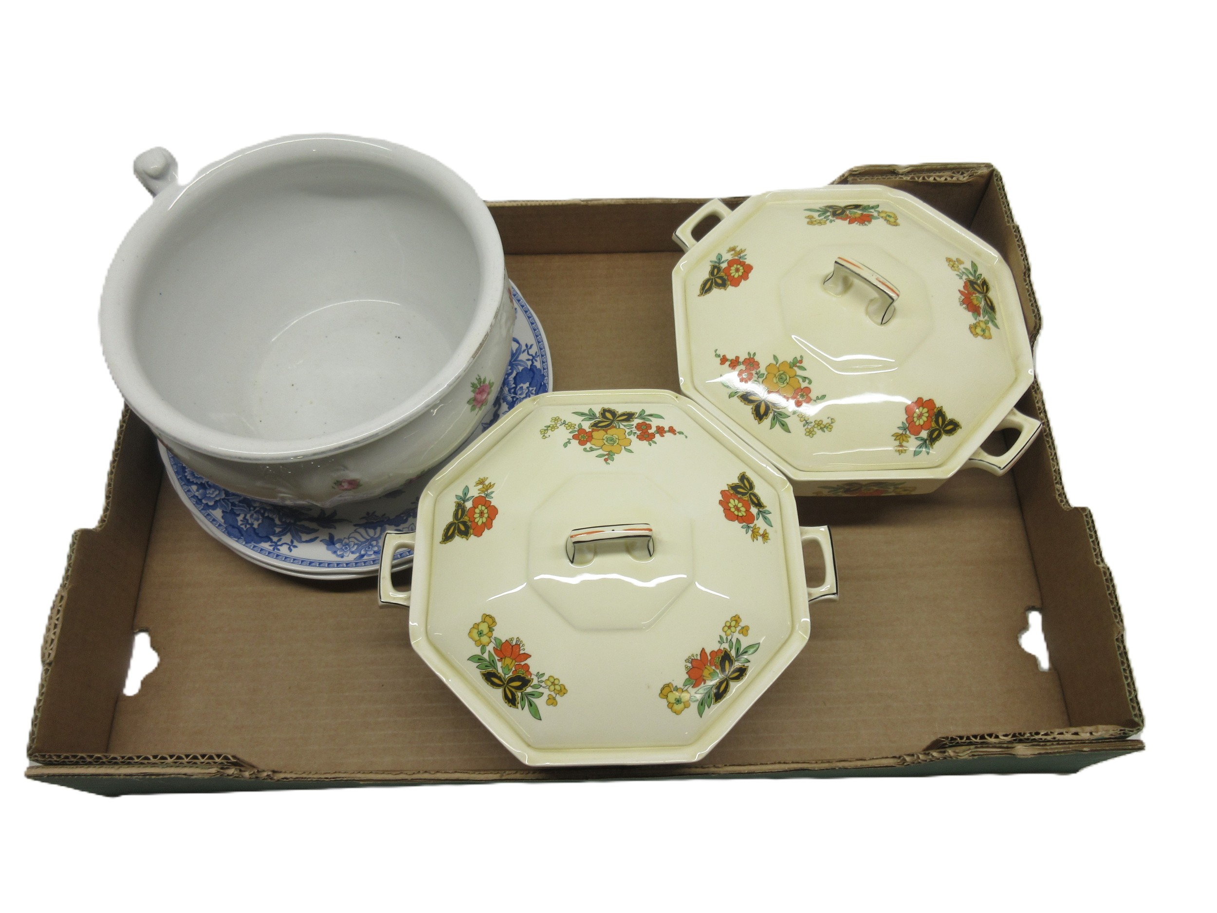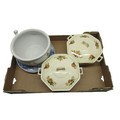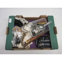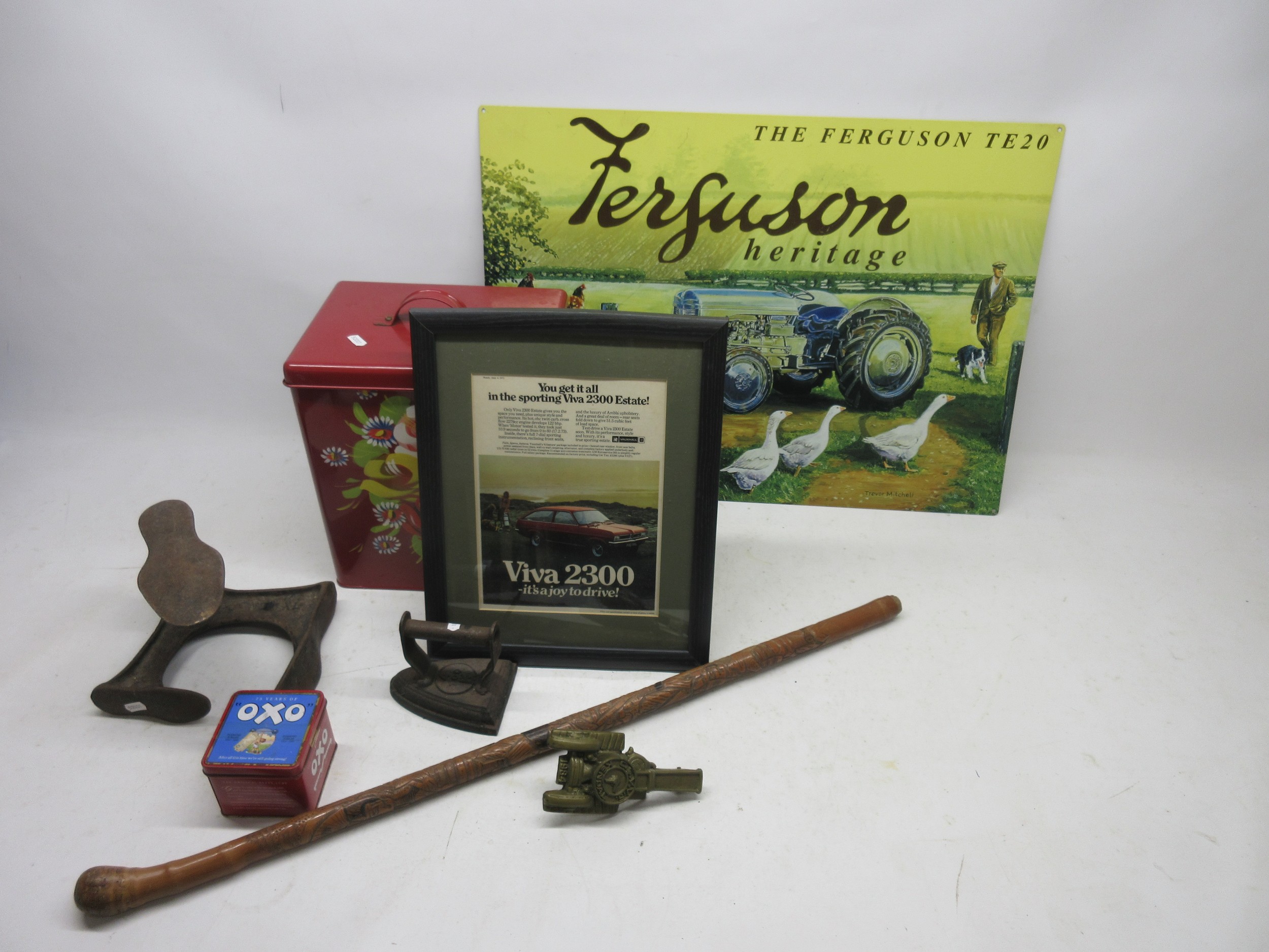 Mixed collection of decorative items, including set of three painted tins, cobbler's flat iron, ceramics, an enamel sign etc. (2 boxes)