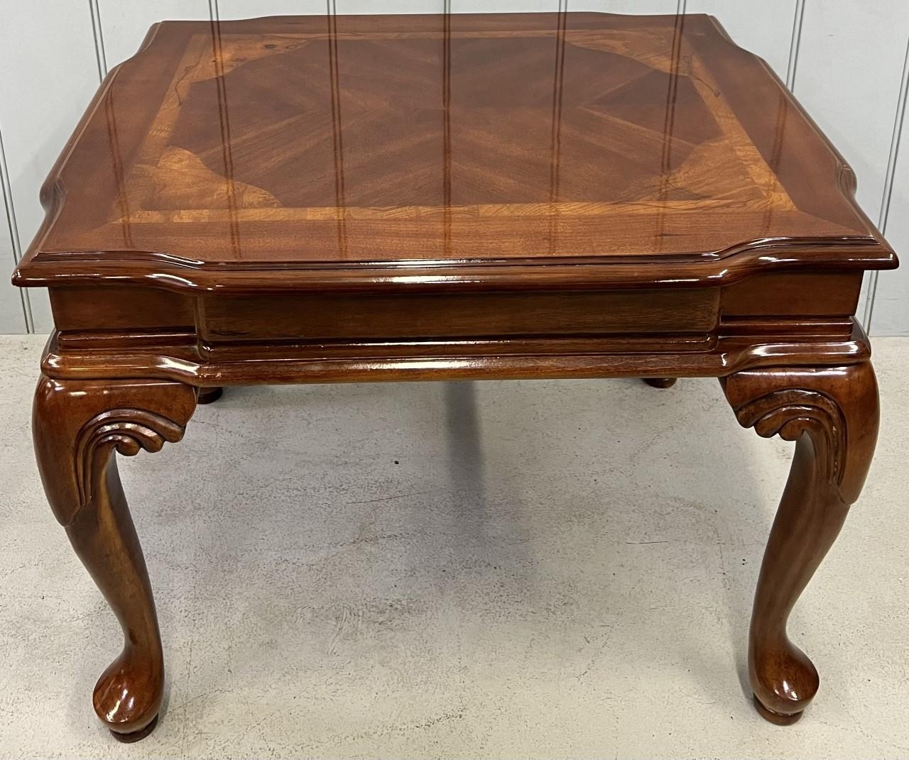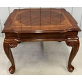 A reproduction, inlaid mahogany coffee table, with cabriole legs & pad feet. Dimensions(cm) H55, W71, D58.