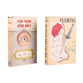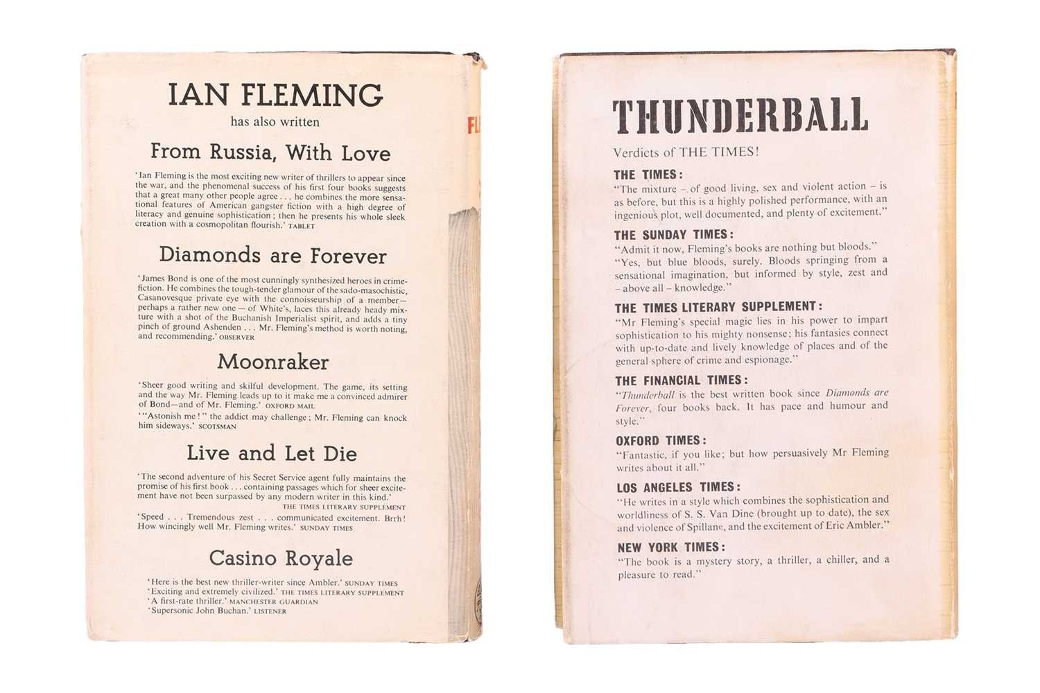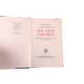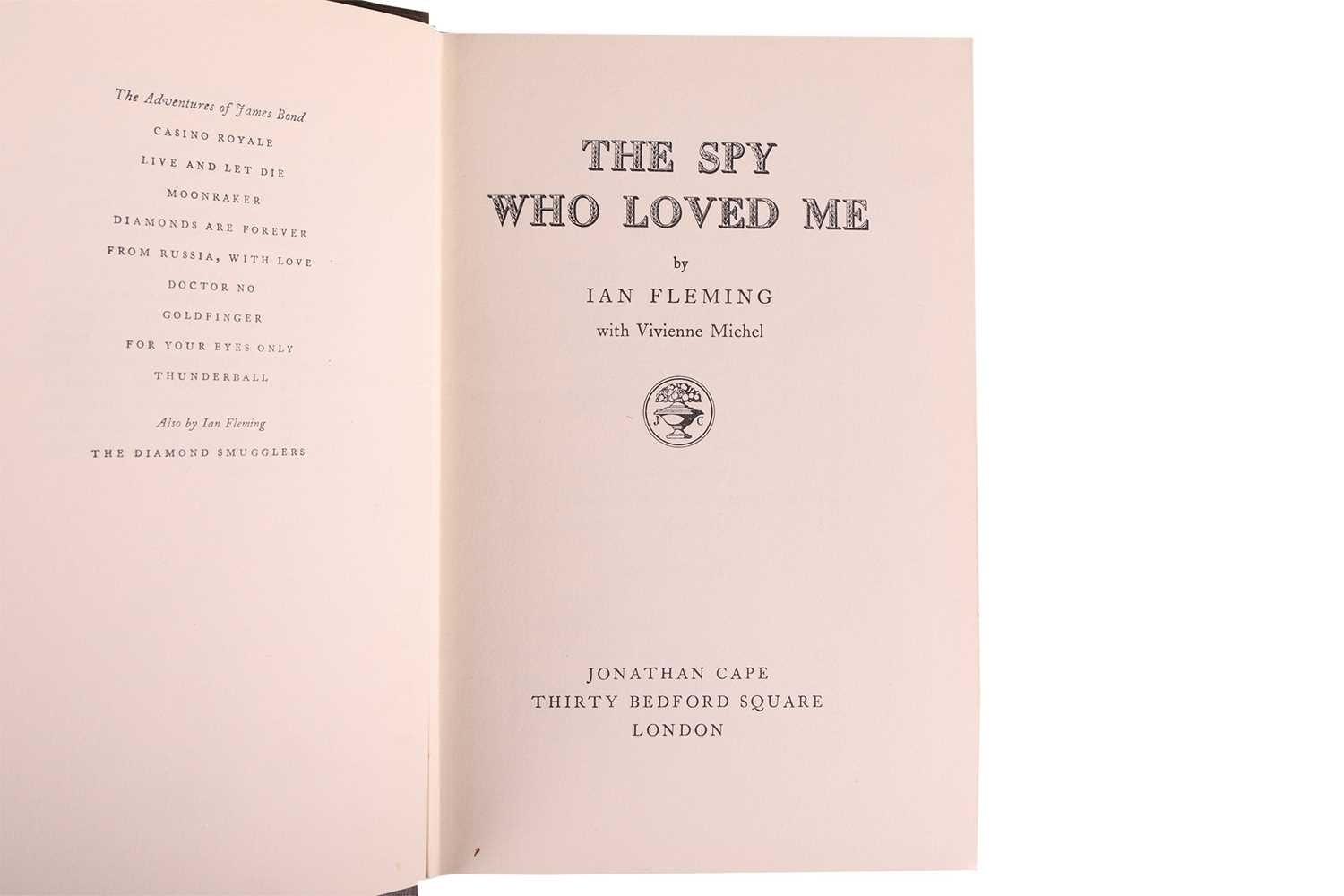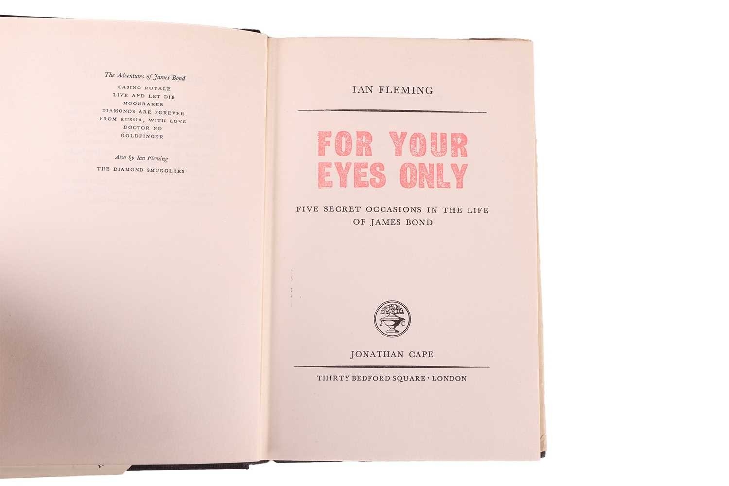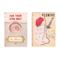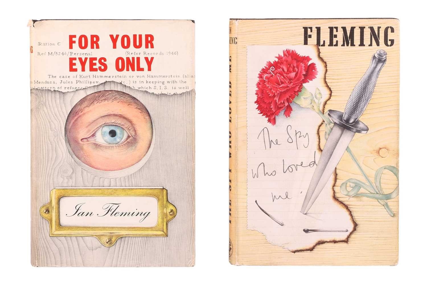 James Bond: Fleming (Ian Lancaster 1908-1964), 'The Spy Who Loved Me', first edition hardback with clipped dust cover (the design by Richard Chopping), original price (15s. net) showing, published by Jonathan Cape, London 1962, black boards with silver lettering to spine, dagger with silver blade to upper cover and red endpapers, together with 'For Your Eyes Only' by the same author, first edition hardback with clipped dust cover (the design by Richard Chopping), original price (15s. net) showing, Cape, London 1960, black boards with silver lettering to spine, and 'Eye' to the black cover. Qty: (2) Private collection, deceased London estate. Wear and small tears to both dust jackets. Split to the spine binding on 'For Your Eyes Only'.