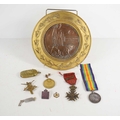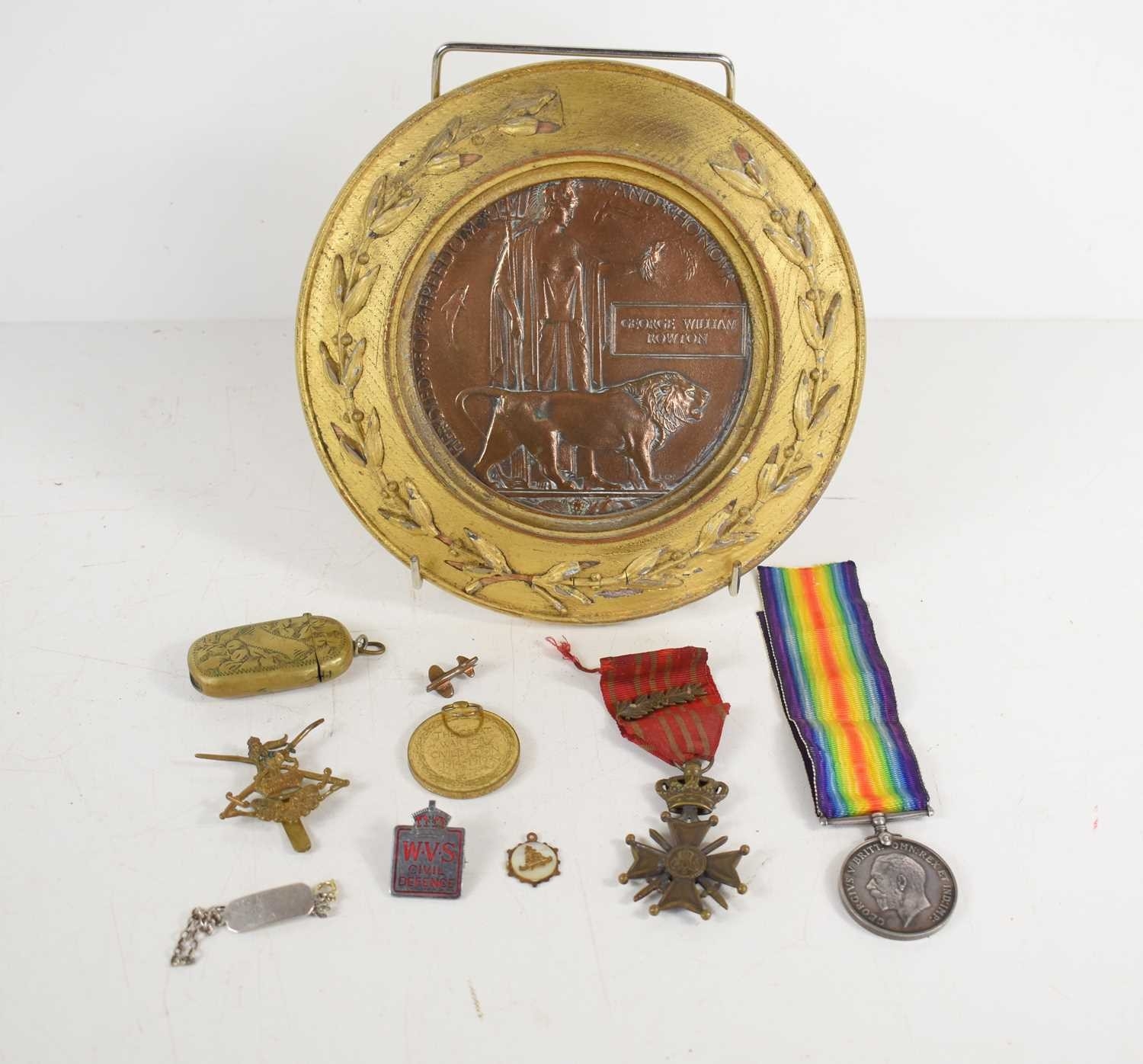 A group of militaria to include a framed WWI death penny for George William Rowton, a 1914-1918 war medal awarded to Ralph Hazell, RAF, 23942, a British infantry training cap badge, a WWI Belgium Croix de Guerre medal and other items.