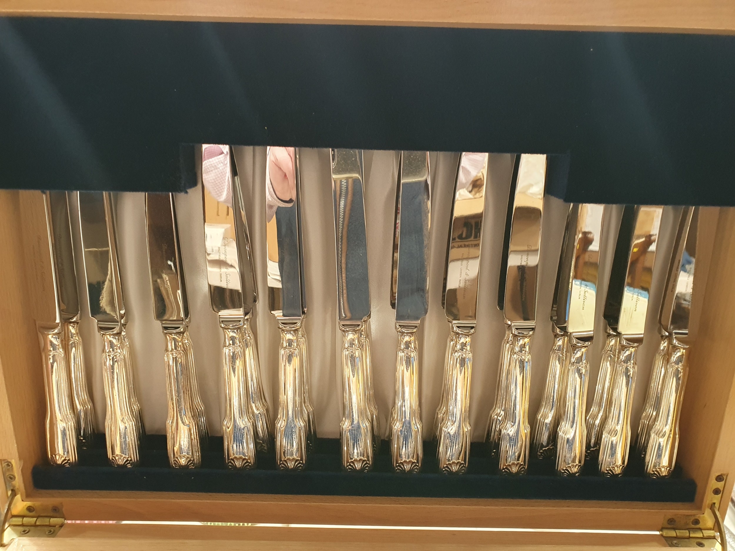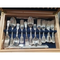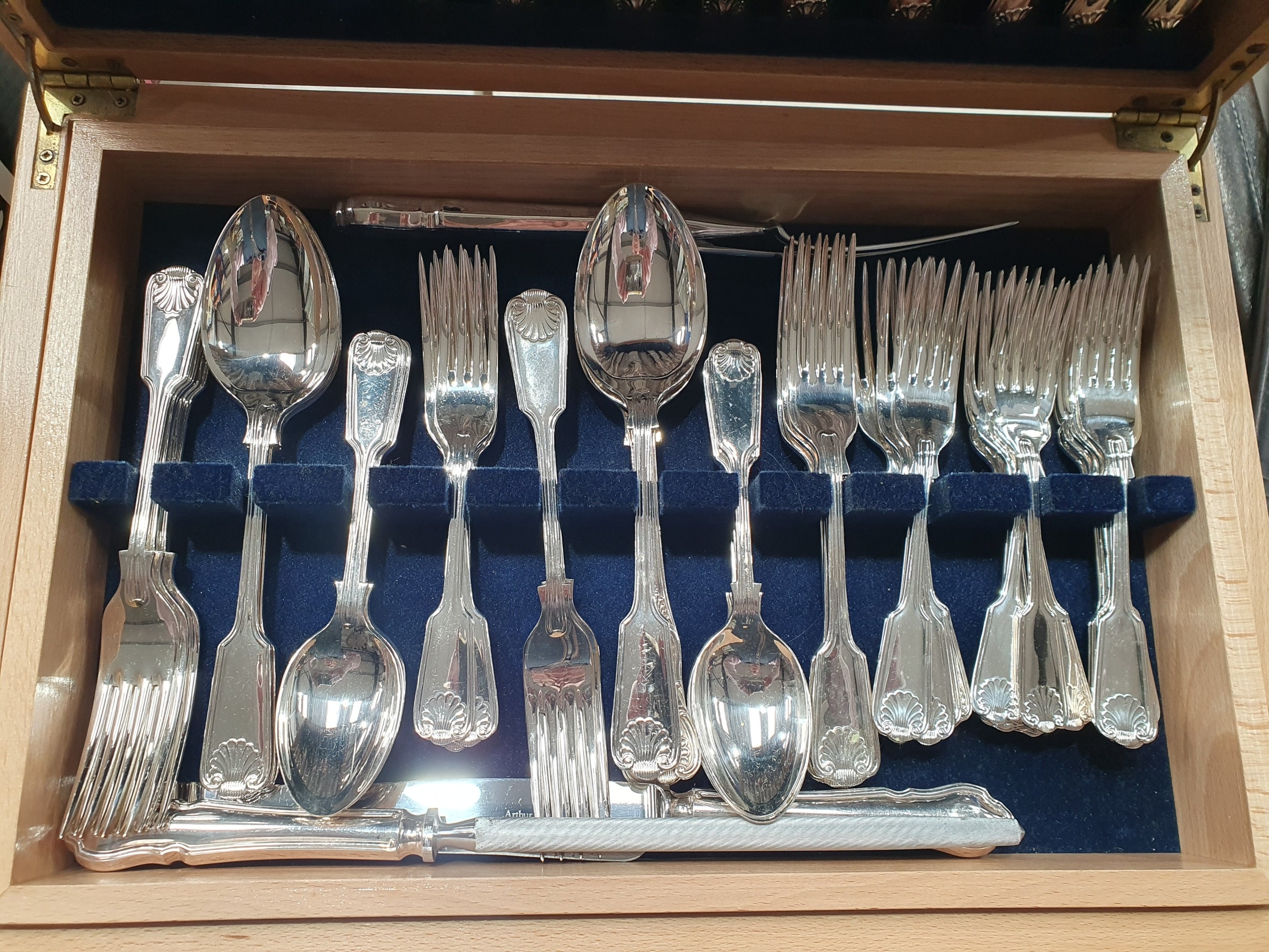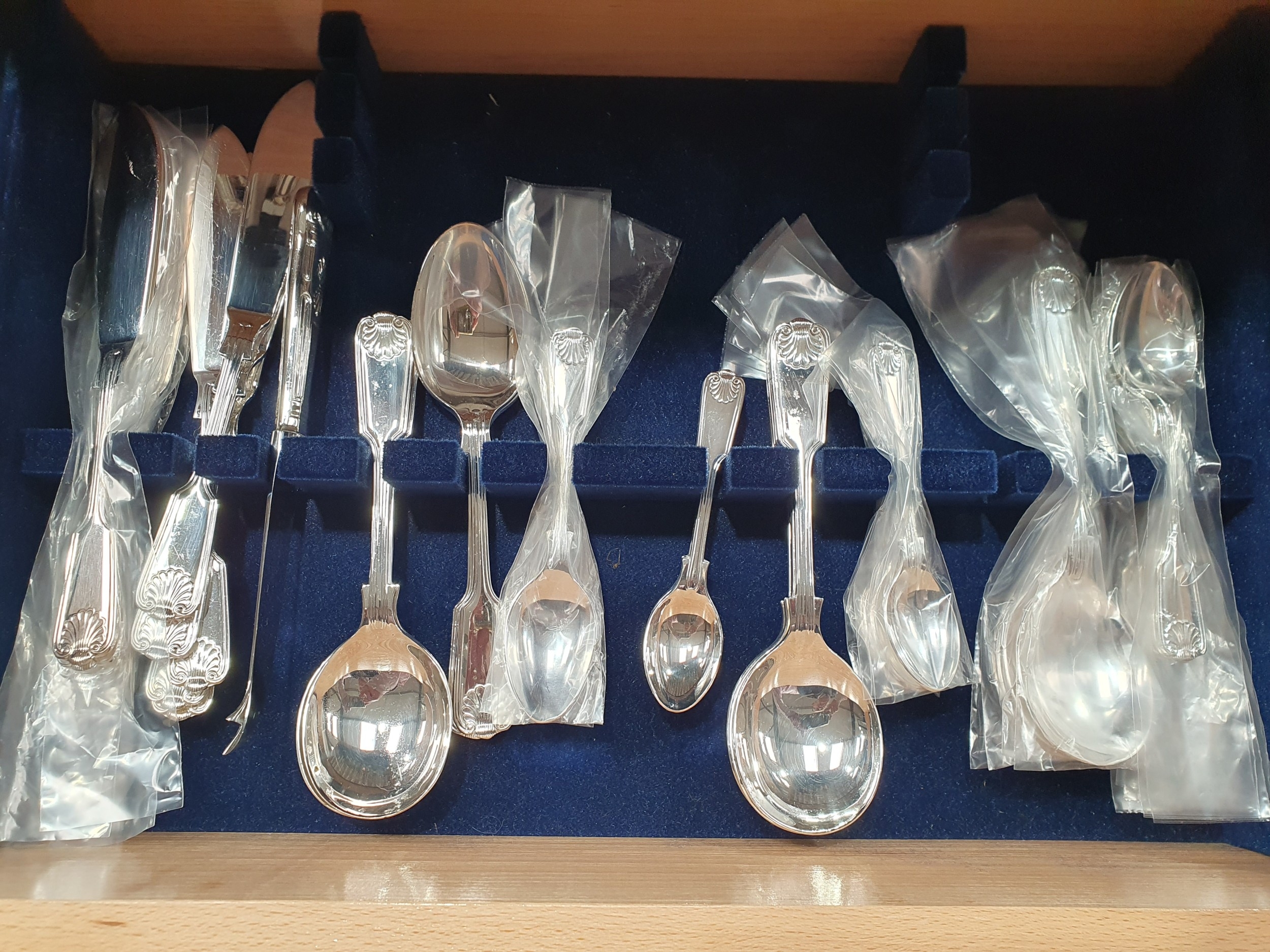A Canteen of plated Cutlery for twelve, fiddle, thread and shell pattern, in beech case, as new, mostly unused