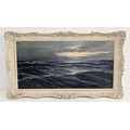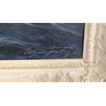 A striking seascape depicting rolling waves under a brooding sky, the surface animated with rich impasto and tonal subtleties in deep blues, greys and silvers. Freyberg’s mastery of light is evident in the luminous reflections breaking across the water’s crest — a hallmark of his maritime compositions.
