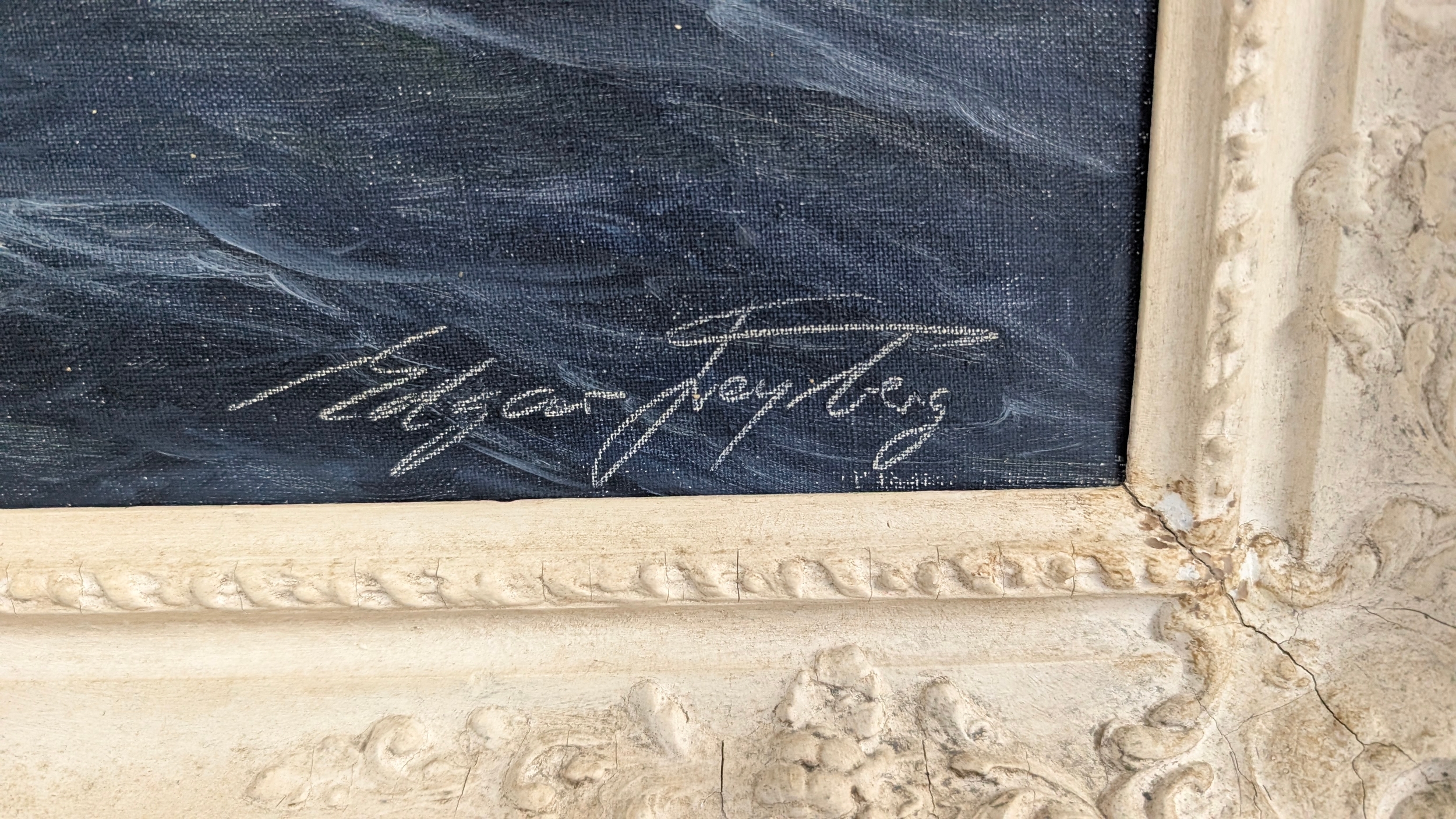 Presented in an ornate cream-painted Rococo-style frame