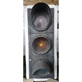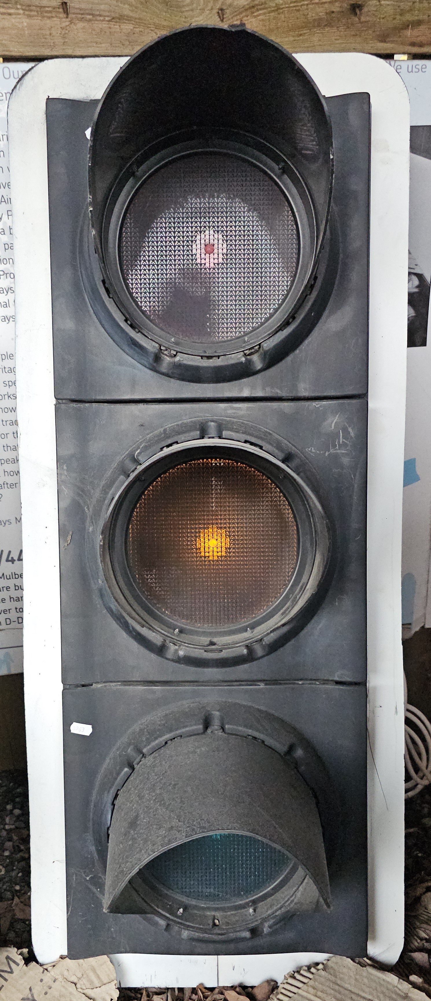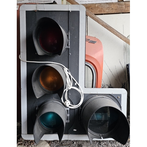 A large vintage 20th-century traffic light, plastic case finished in black with glass coloured traffic control lights, rewired with 12V halogen bulbs with a transformer, 115 x 47cm