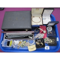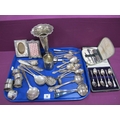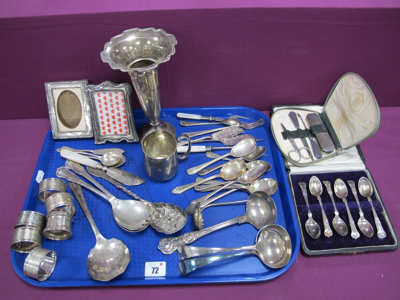 A Hallmarked Silver Golfing Trophy Vase, HWLd, Birmingham, inscribed "Crews Hill Golf Club presented to Mrs C. A. Whitcombe as a memento of the Victory of C. A. Whitcombe in Challenge Match between C. A. Whitcombe and Abe Mitchell played at Crews Hill on 24th April 1926", 20.5cm high; together with a cased manicure set with engine turned decoration, case hallmarked silver coffee spoons, assorted plated cutlery, two rectangular photograph frames, a decorative hallmarked silver and mother of pearl butter knife, a Harrods plated mug, sauce ladles etc :- One Tray