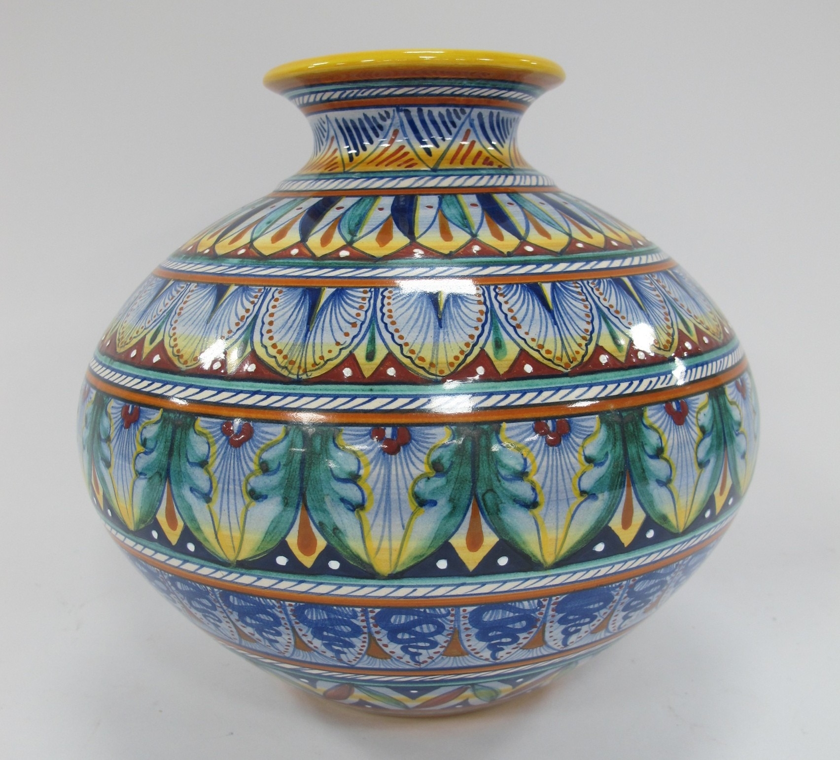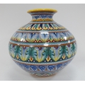Italian Majolica Hand Painted Vase 'Dip A Mano Terra Di Siena', featuring bands of snakes, butterfly wings and foliage, 21cm tall.