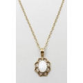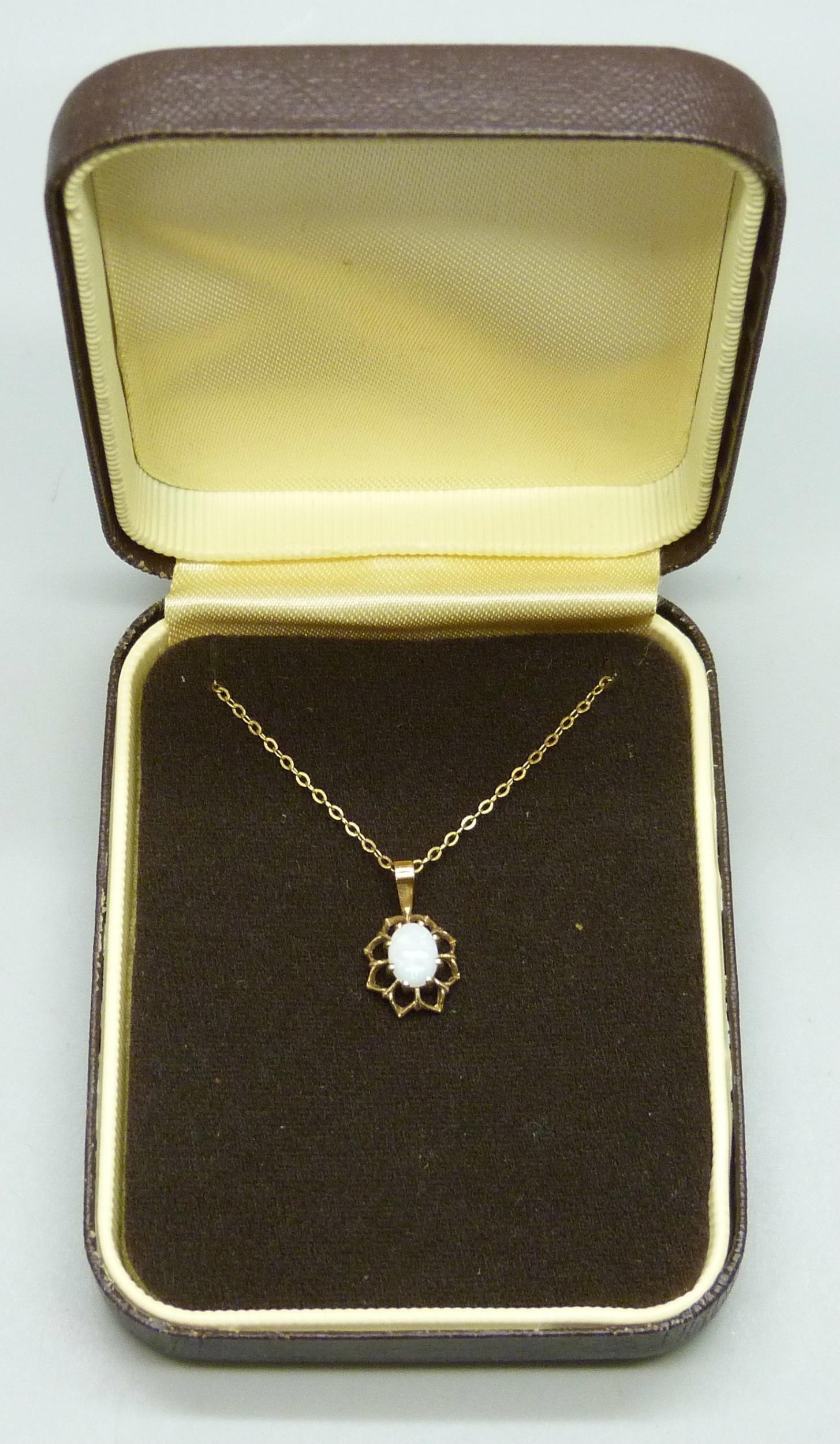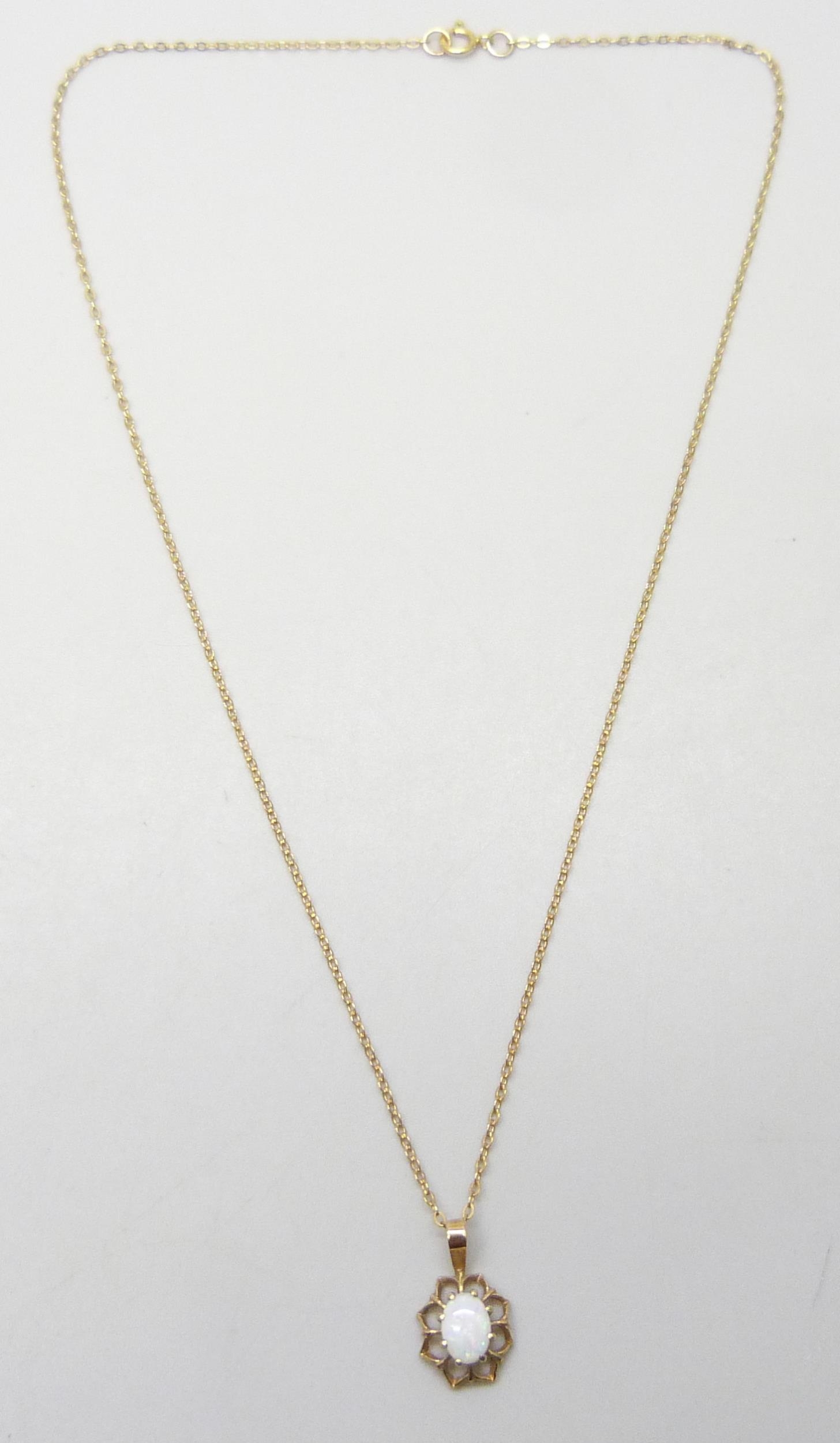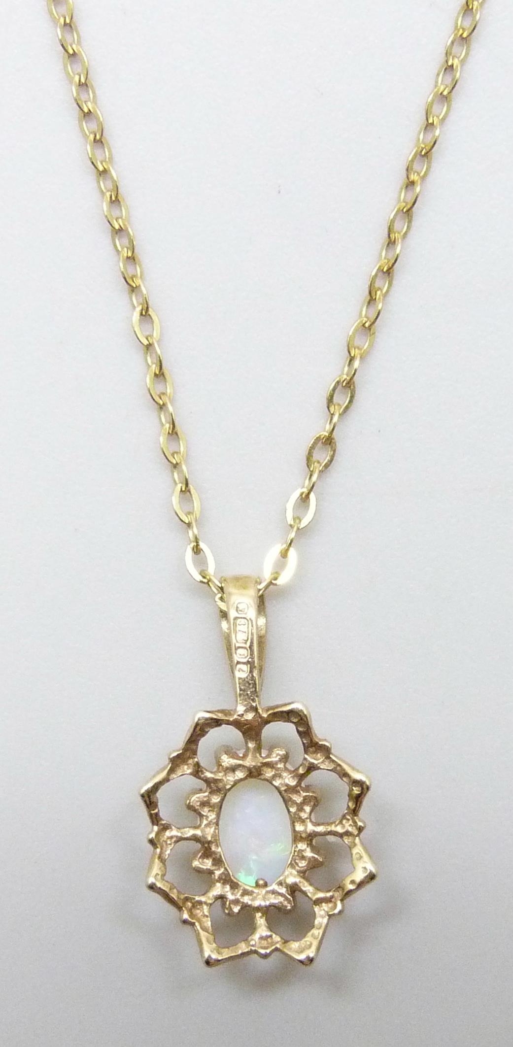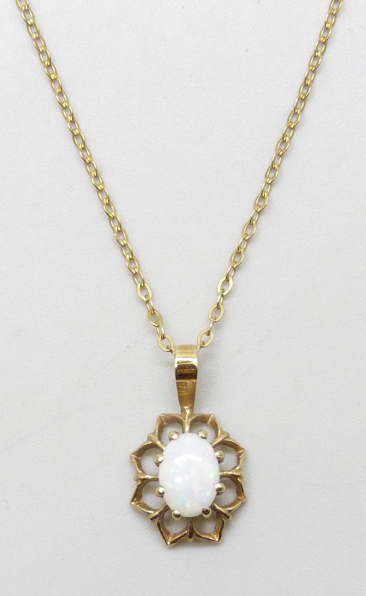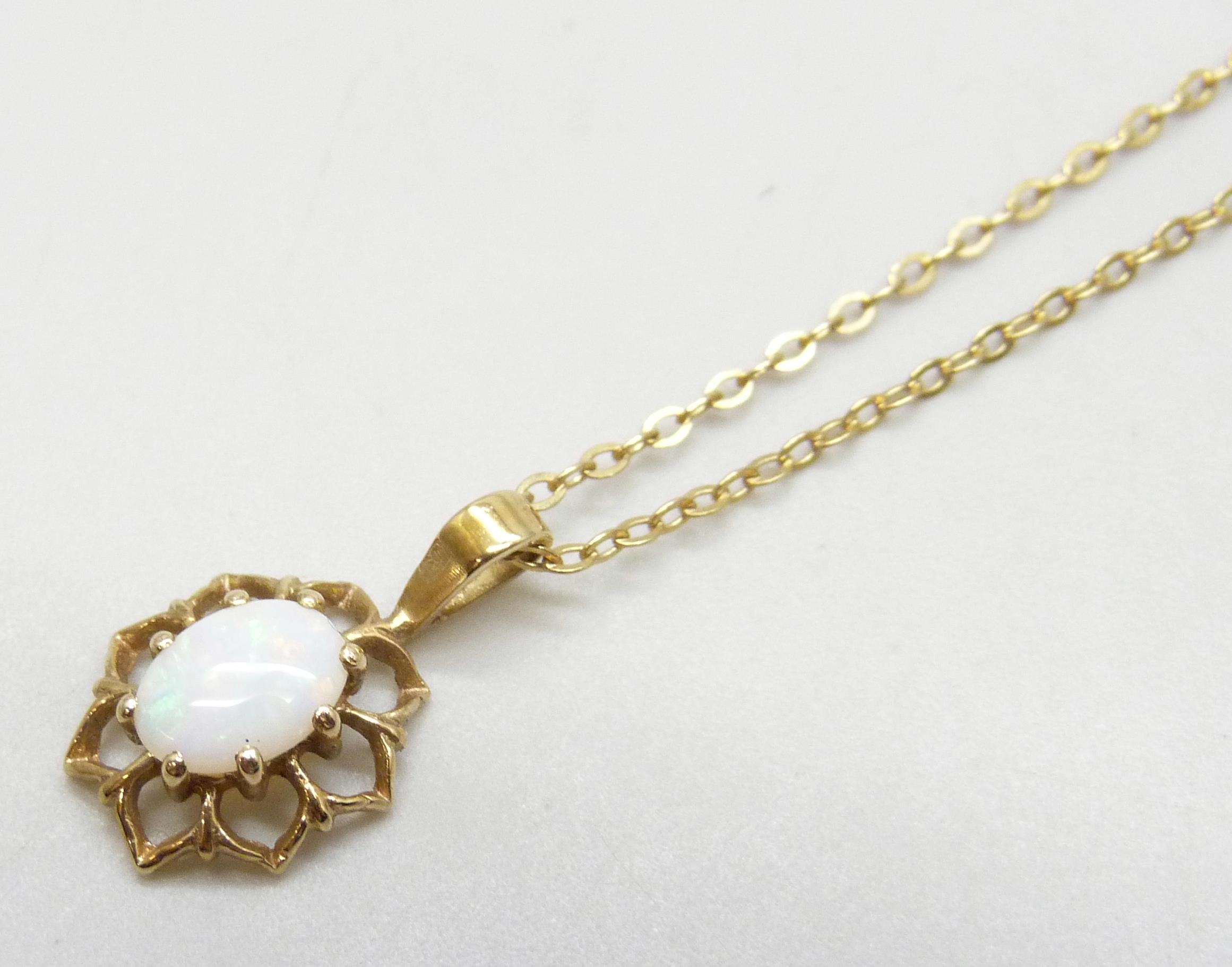 A 9ct gold, opal set pendant, 16mm including bail, on a 9ct gold chain, 1.5g