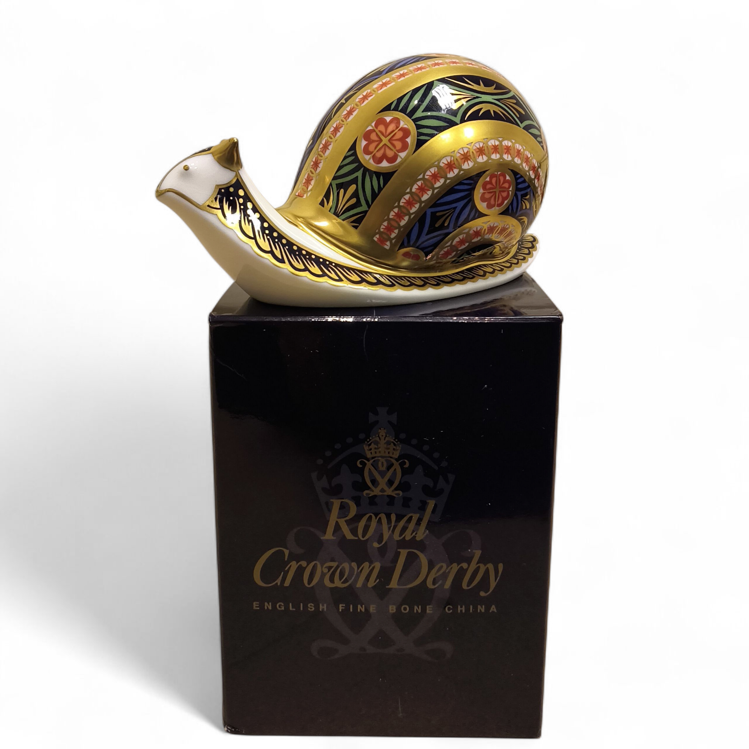 A Boxed Royal Crown Derby Paperweight Garden Snail, gold stopper, with certificate no 1205 of 4500..