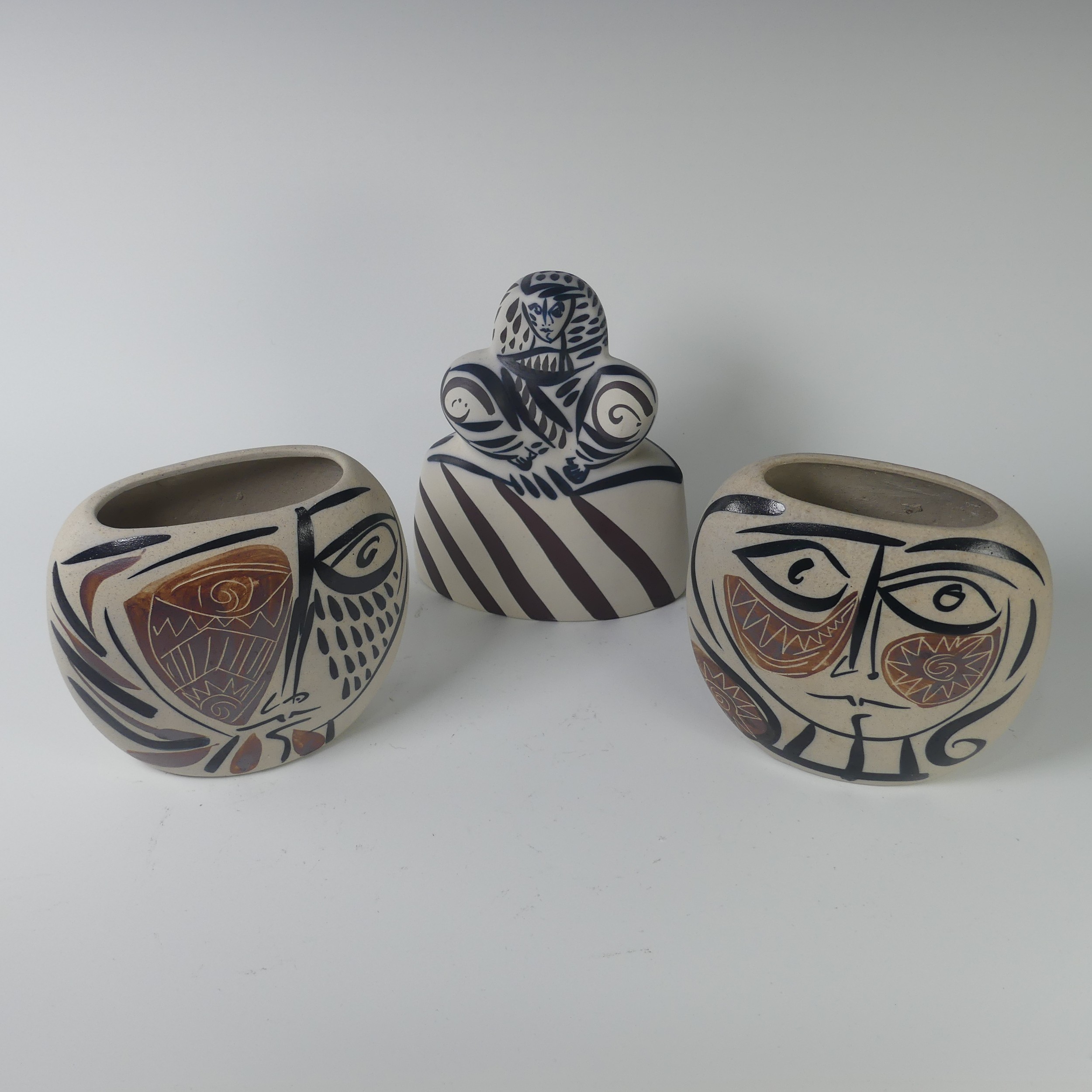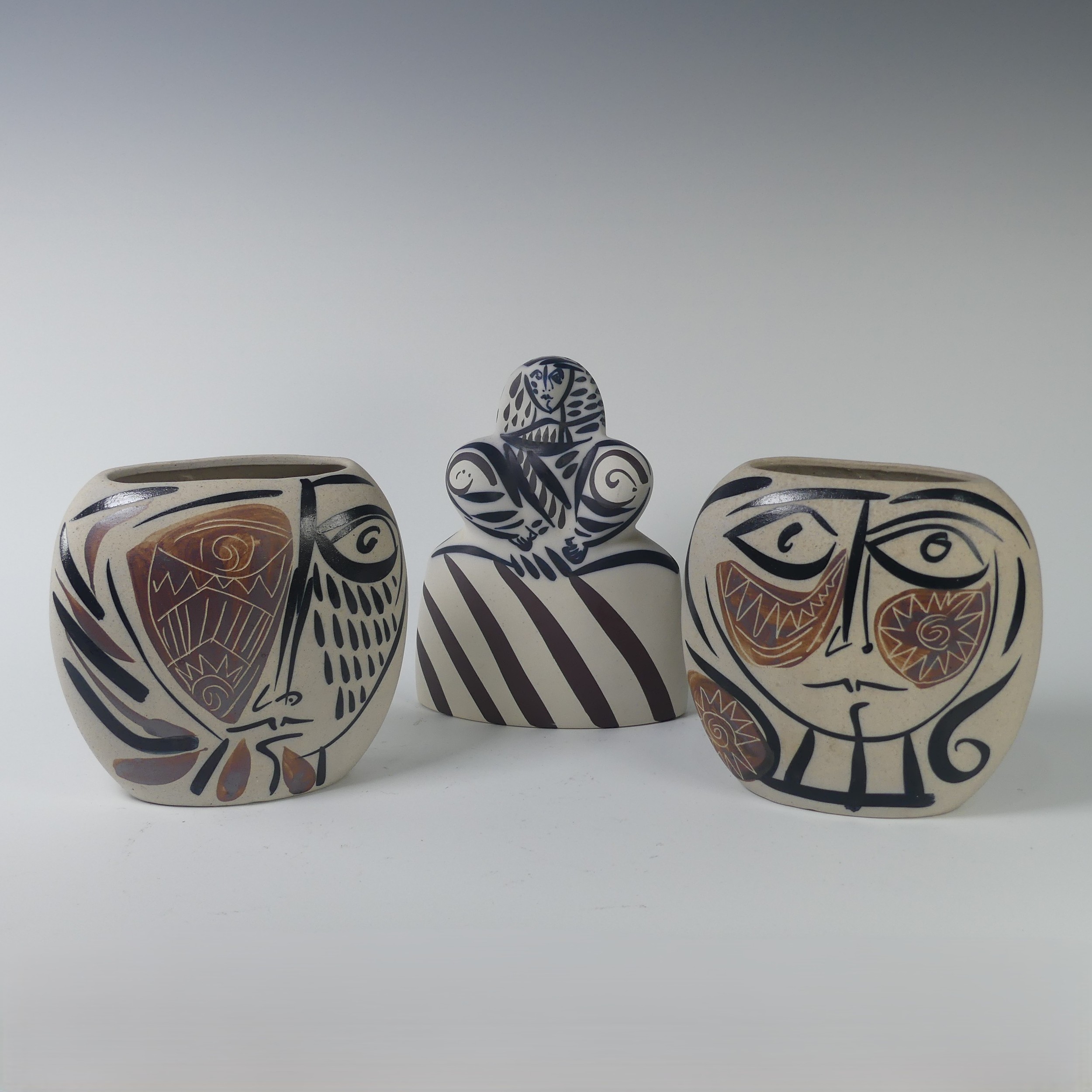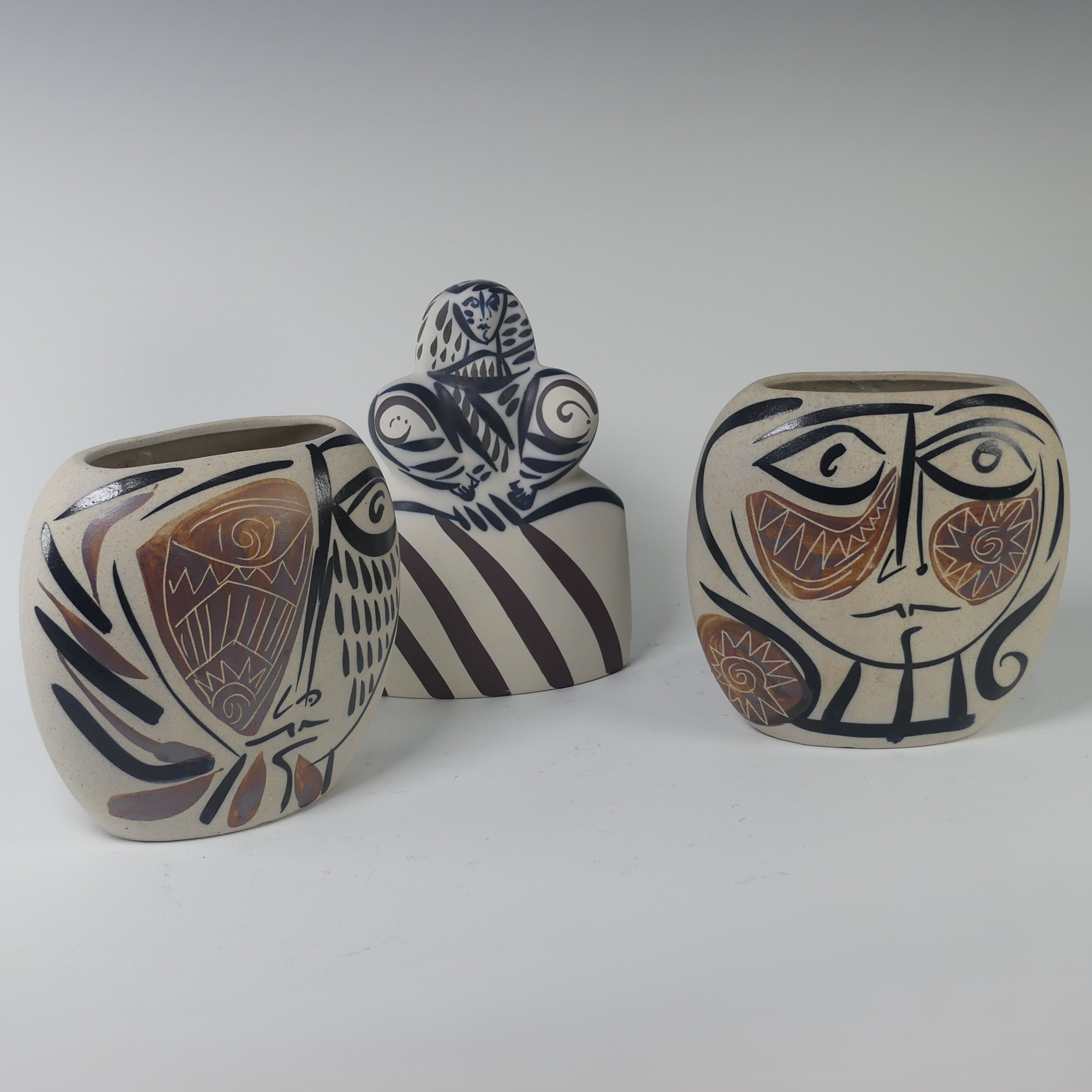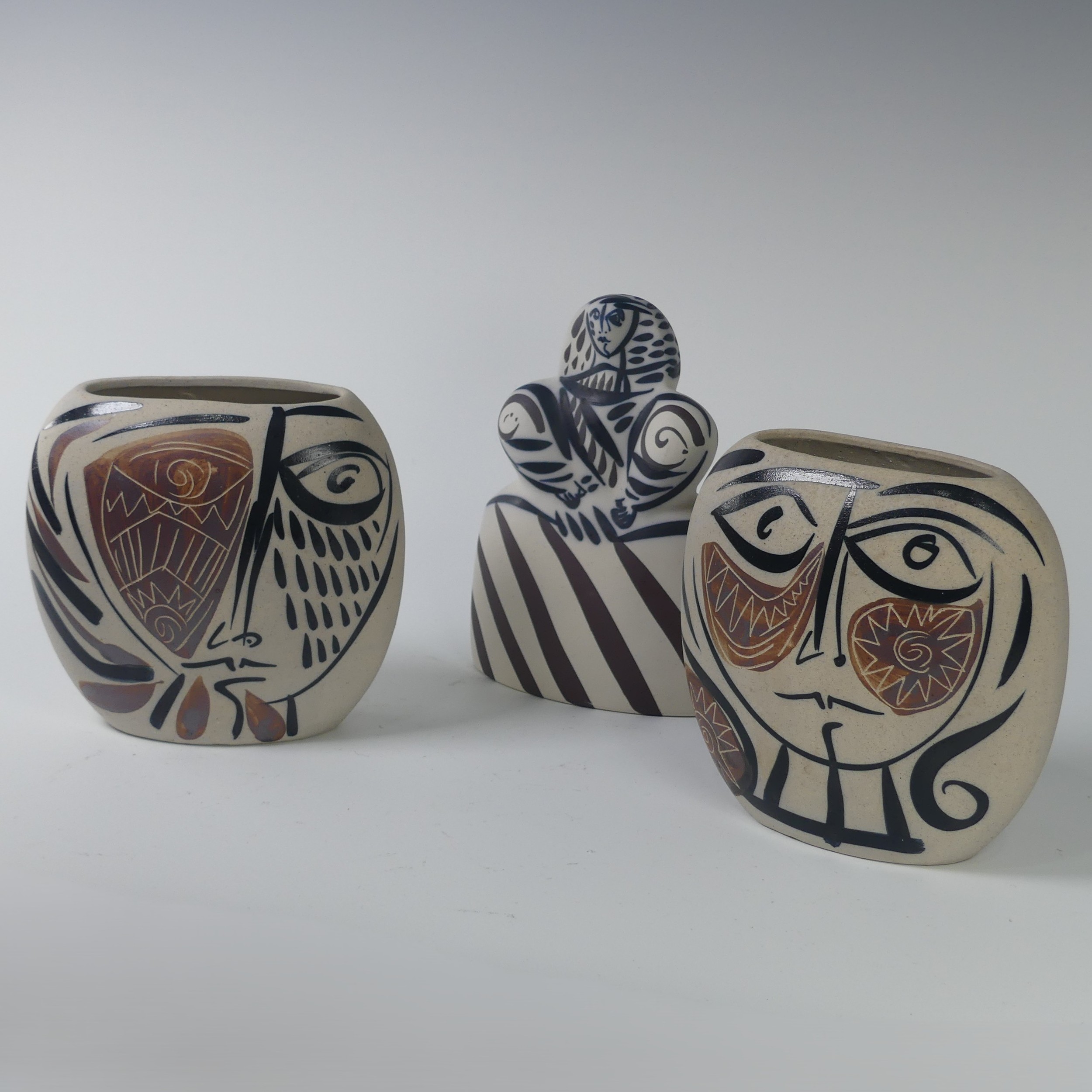 A pair of Otero Regal ceramic Vases, mid-20th century, with 'Picassoesque' decoration, signed on base, 20cm high, together with a figurine of a lady by the same hand, 23cm high (3)