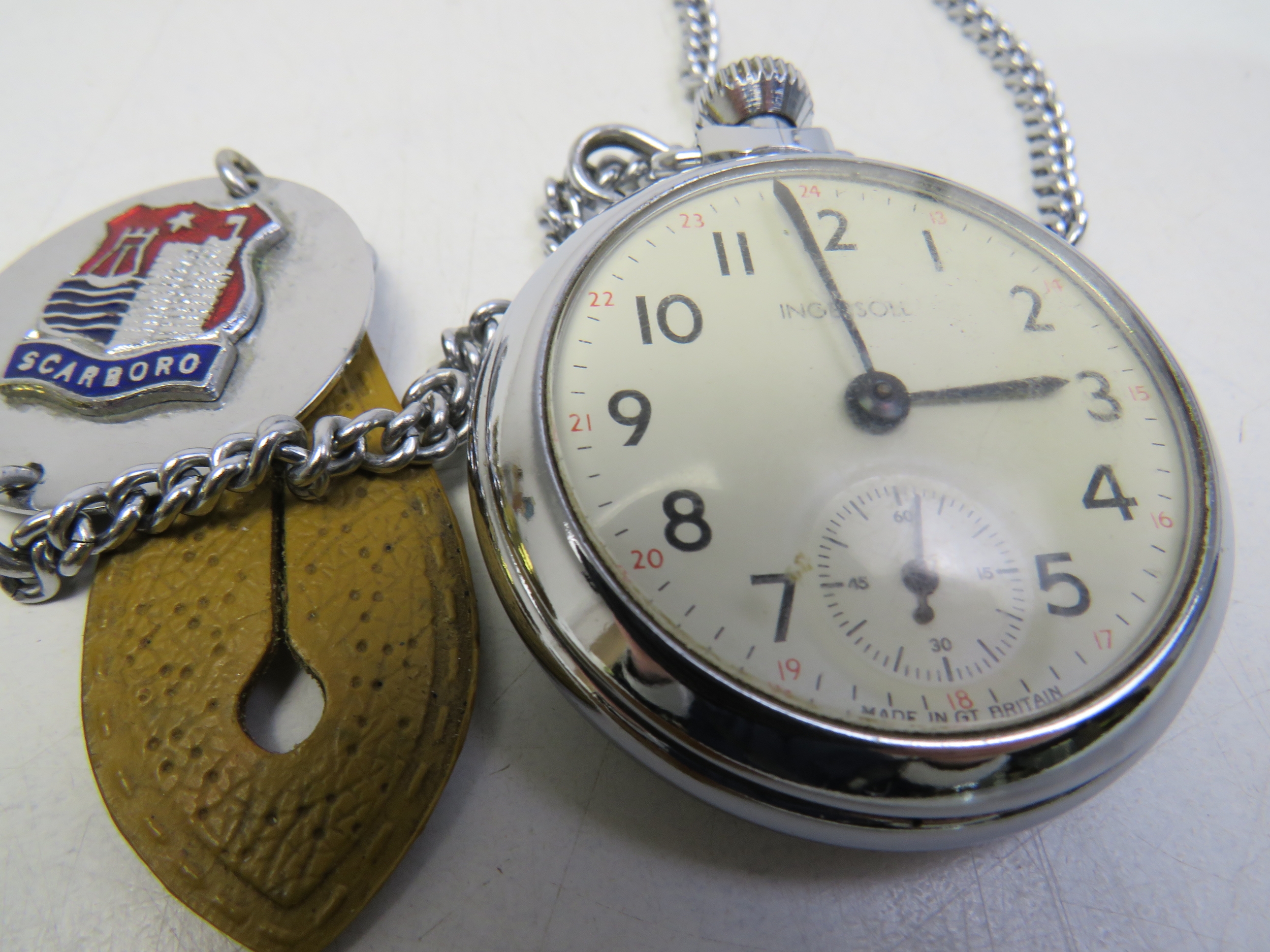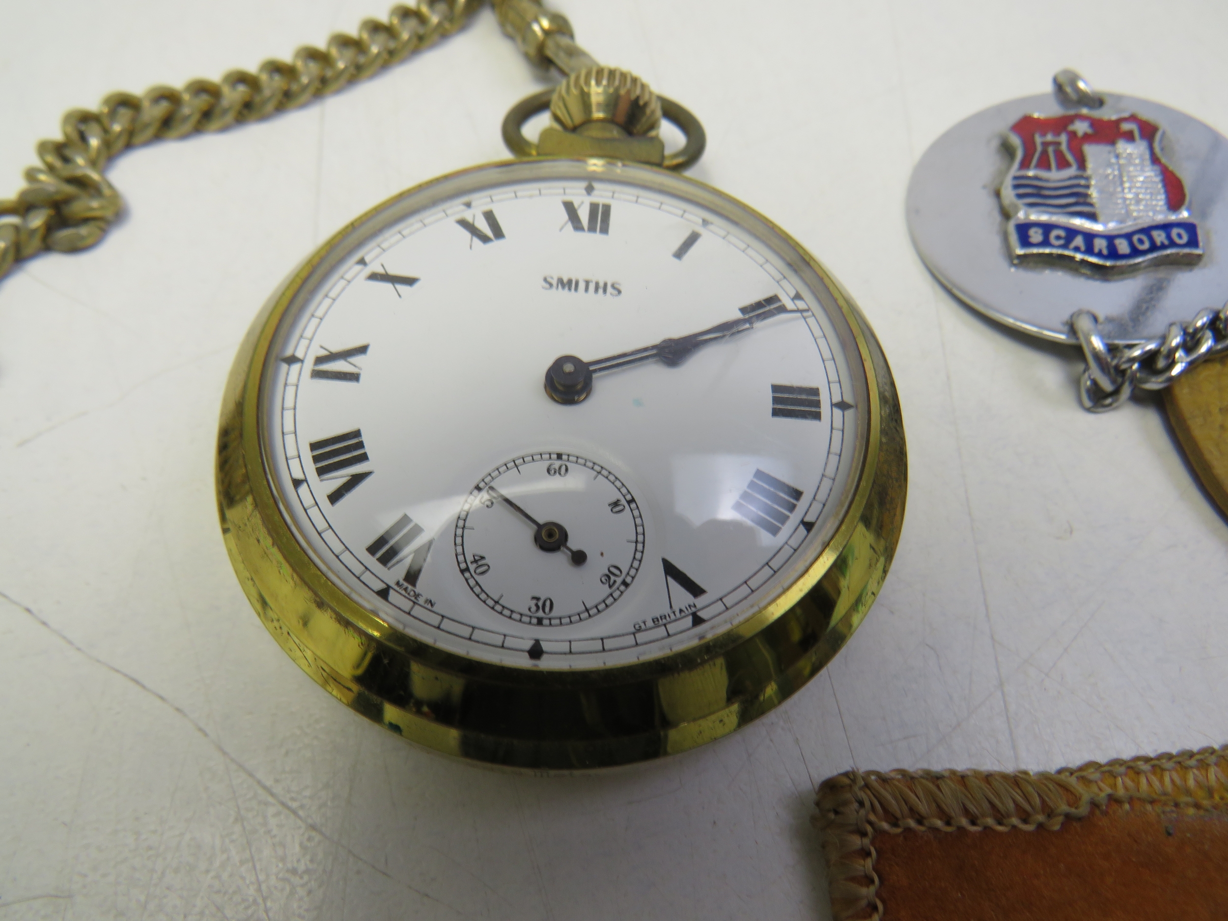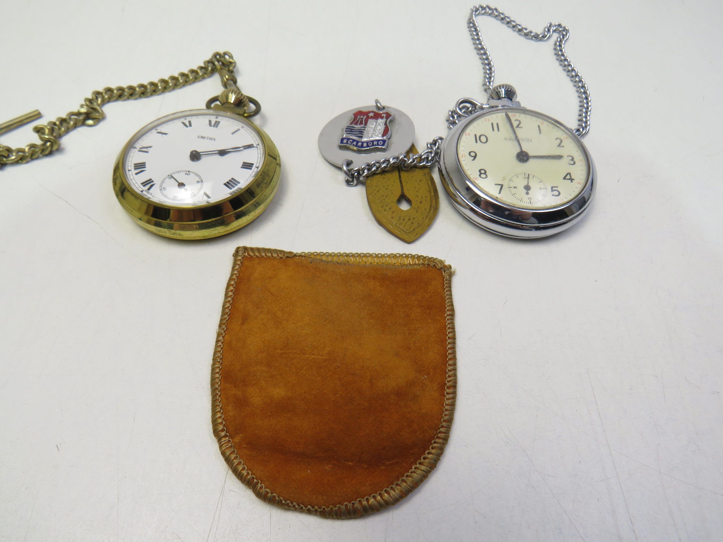 Two pocket watches, including Smiths and Ingersoll.