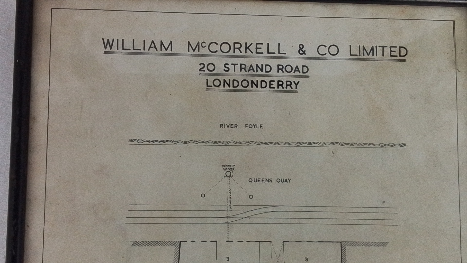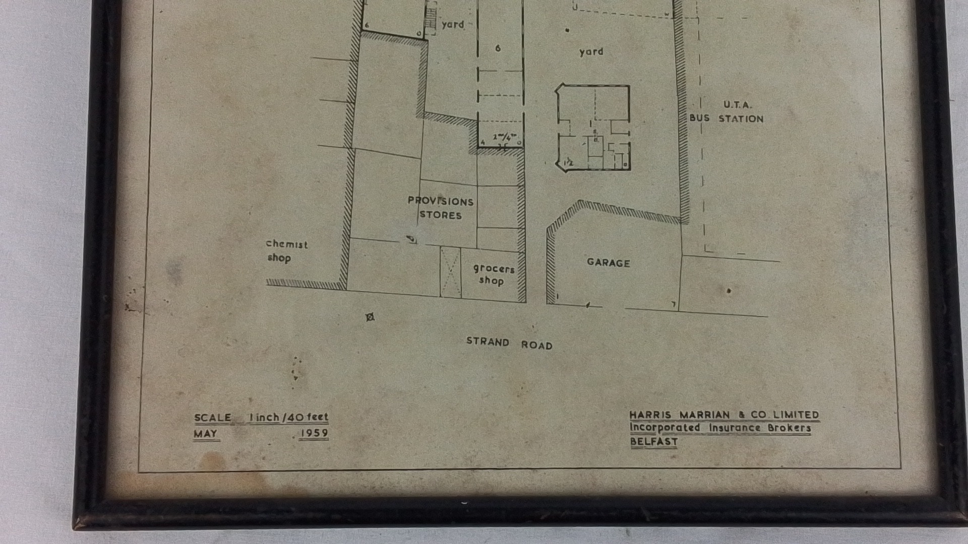 A framed survey plan for William McCorkell & Co. Limited, 20 Strand Road, Londonderry, showing site layout adjoining the River Foyle and Queen’s Quay; scale 1 inch/40 feet, dated May 1959., 28cm x 43cm.