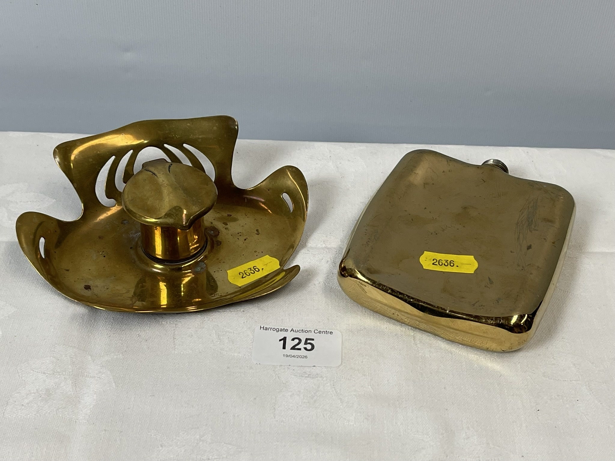 ANTIQUE BRASS HIP FLASK & ART NOUVEAU BRASS INK WELL