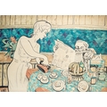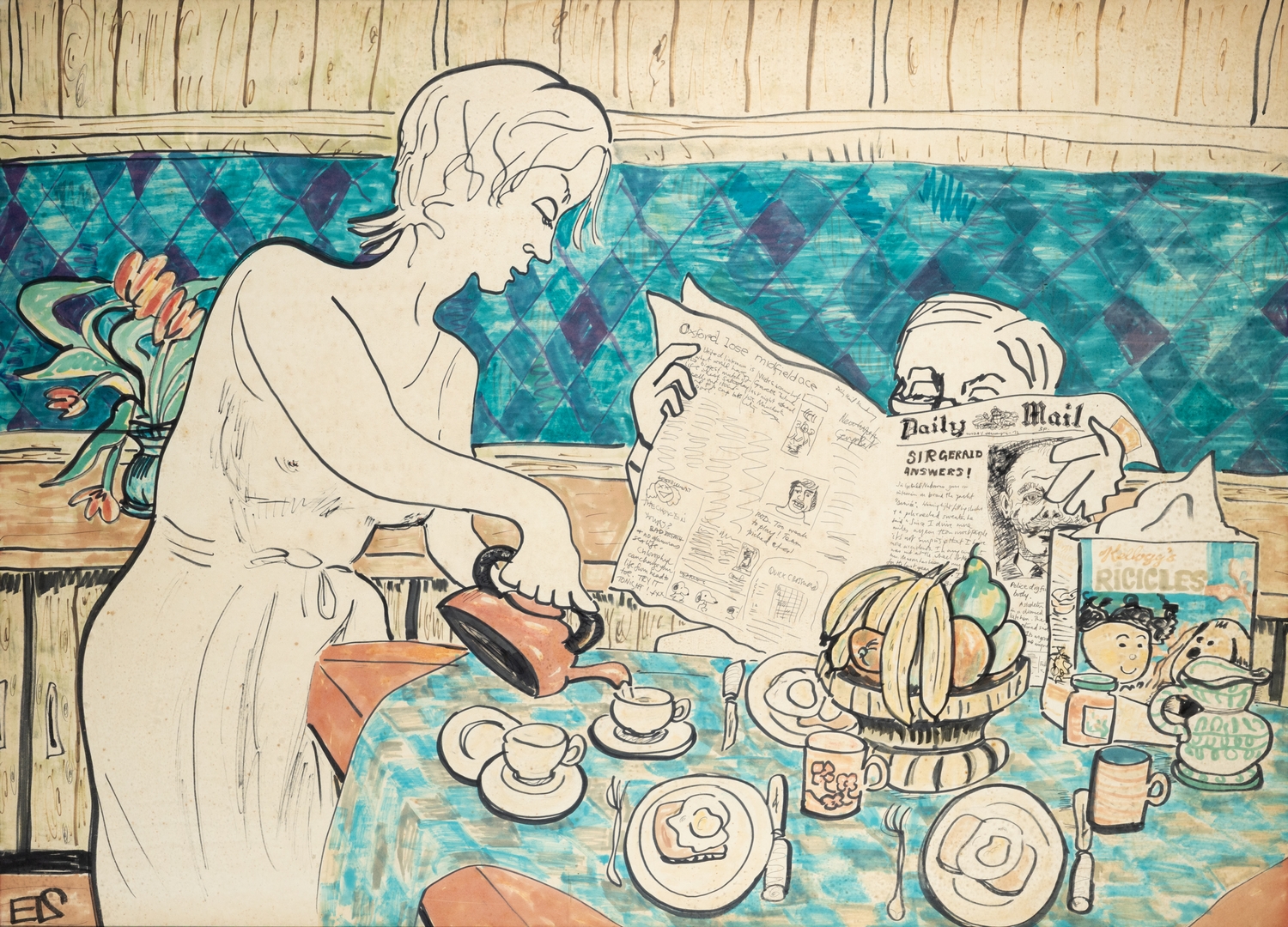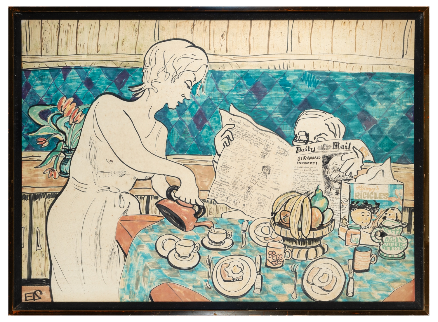 EDWINA SANDYS (BRITISH B. 1938) At Breakfast, Ink and watercolour, 78 x 108cm Signed with initials