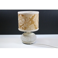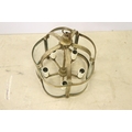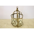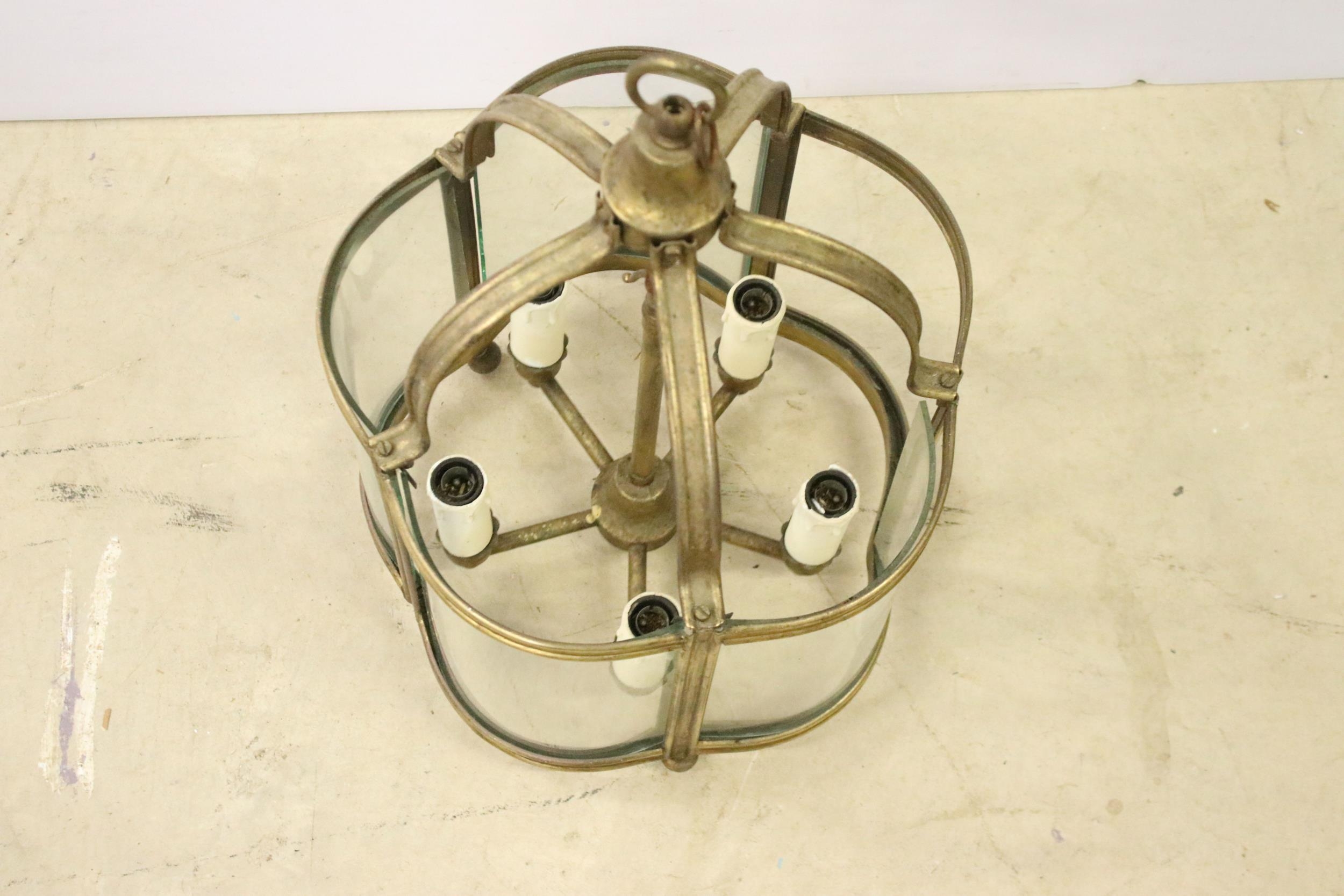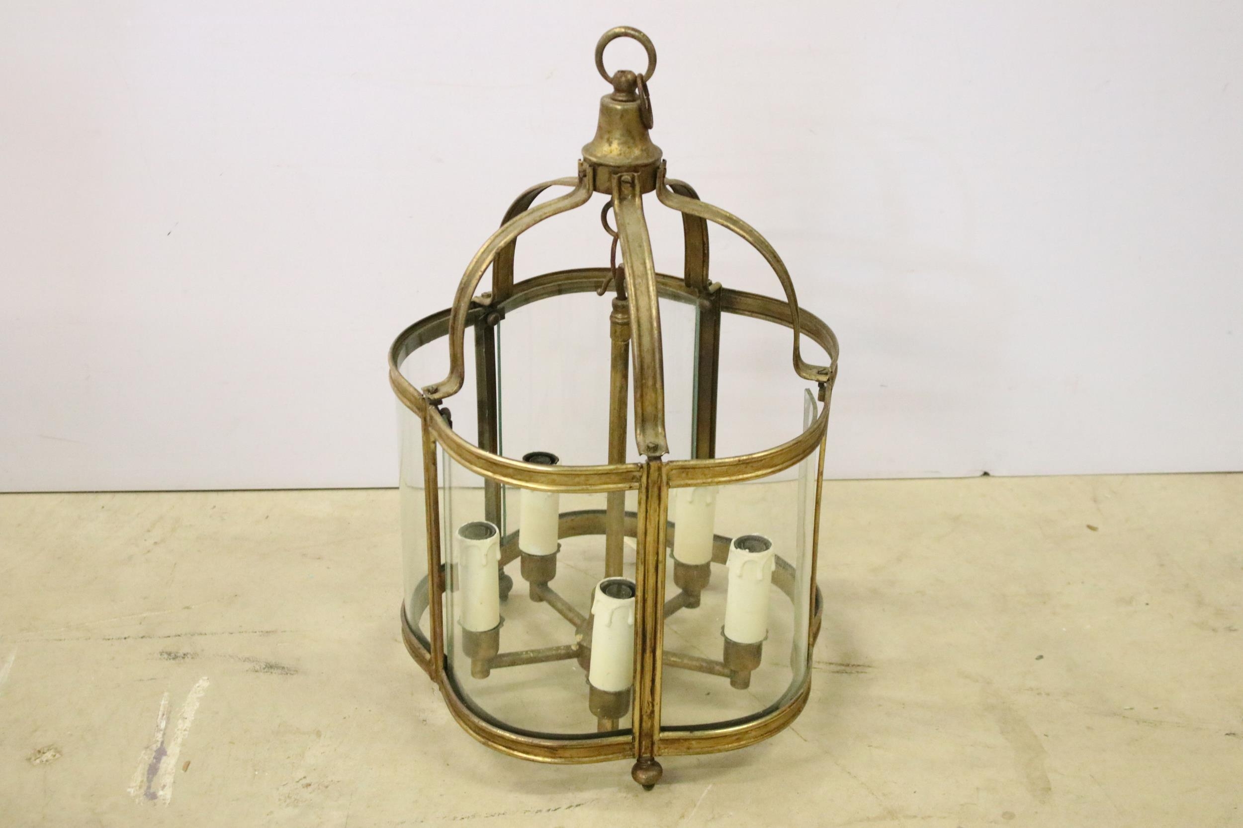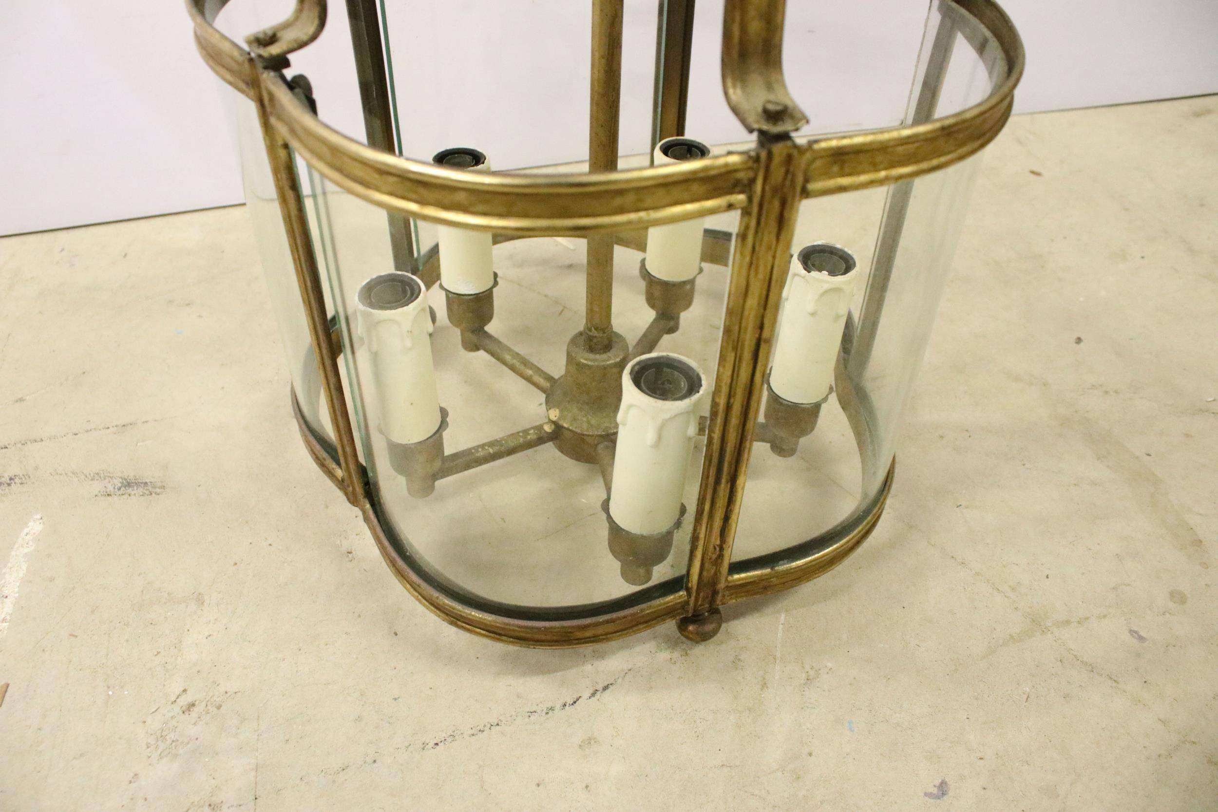 Brass ceiling hanging porch light having curved glass panels with four faux candle within. Measures 47cm tall.