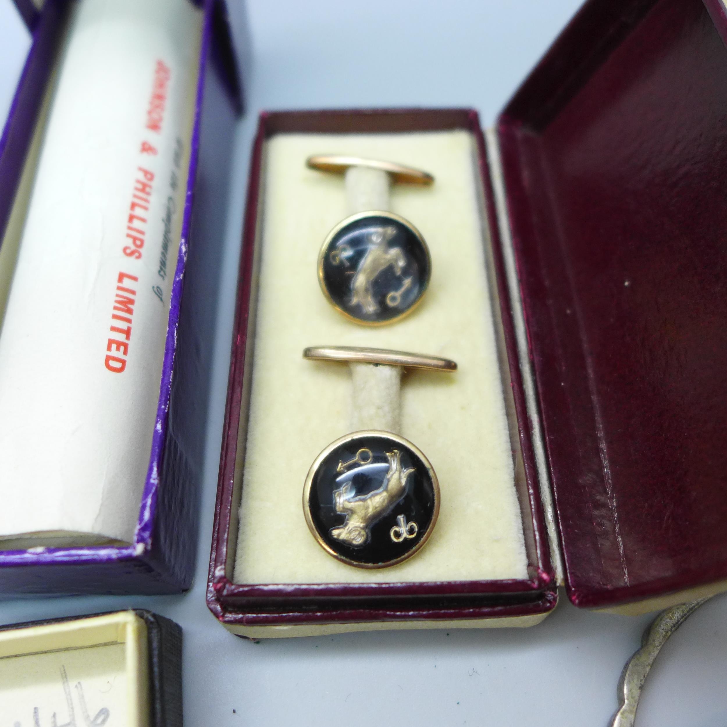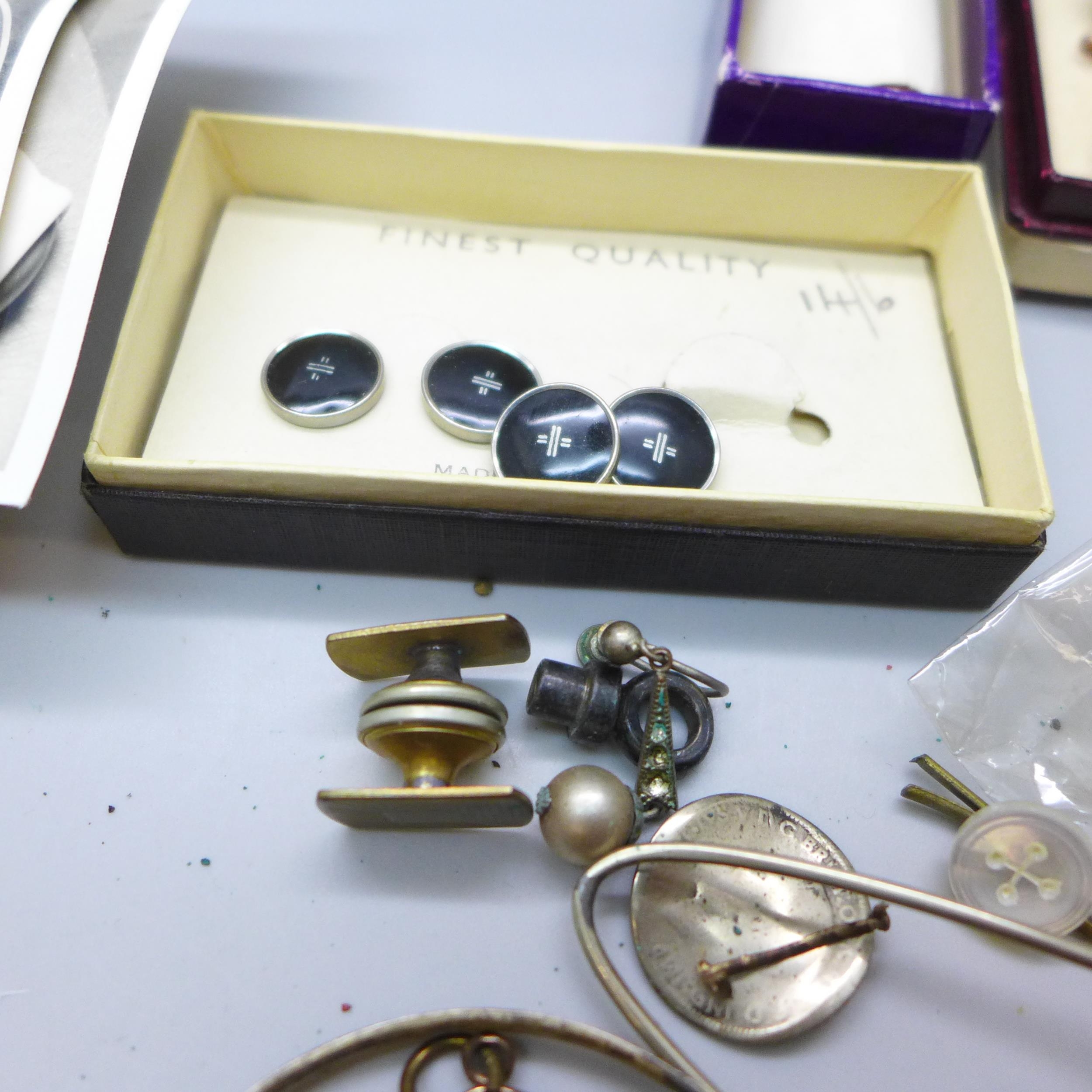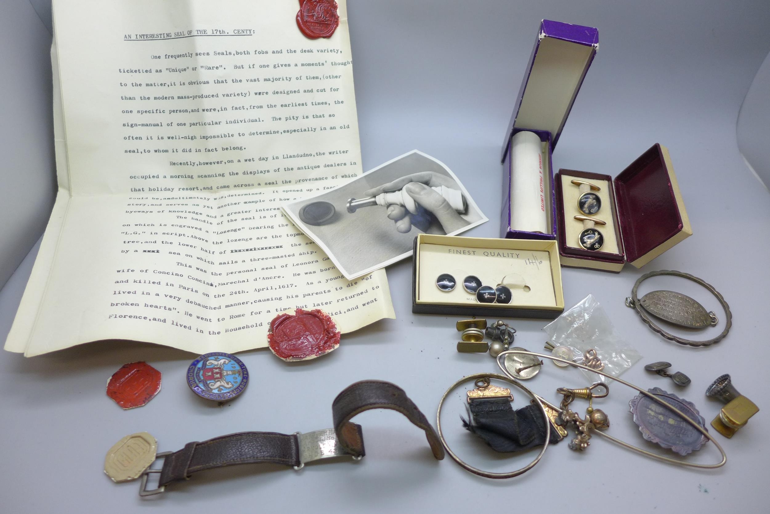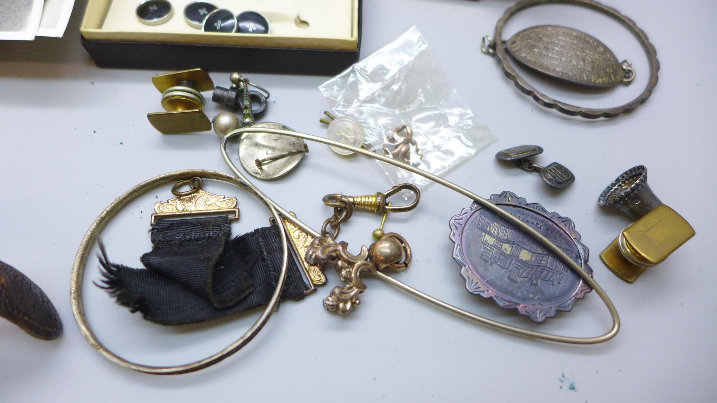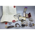 A hallmarked silver bell charm, other jewellery, cufflinks, badges, etc.
