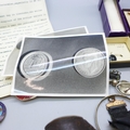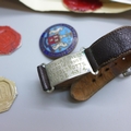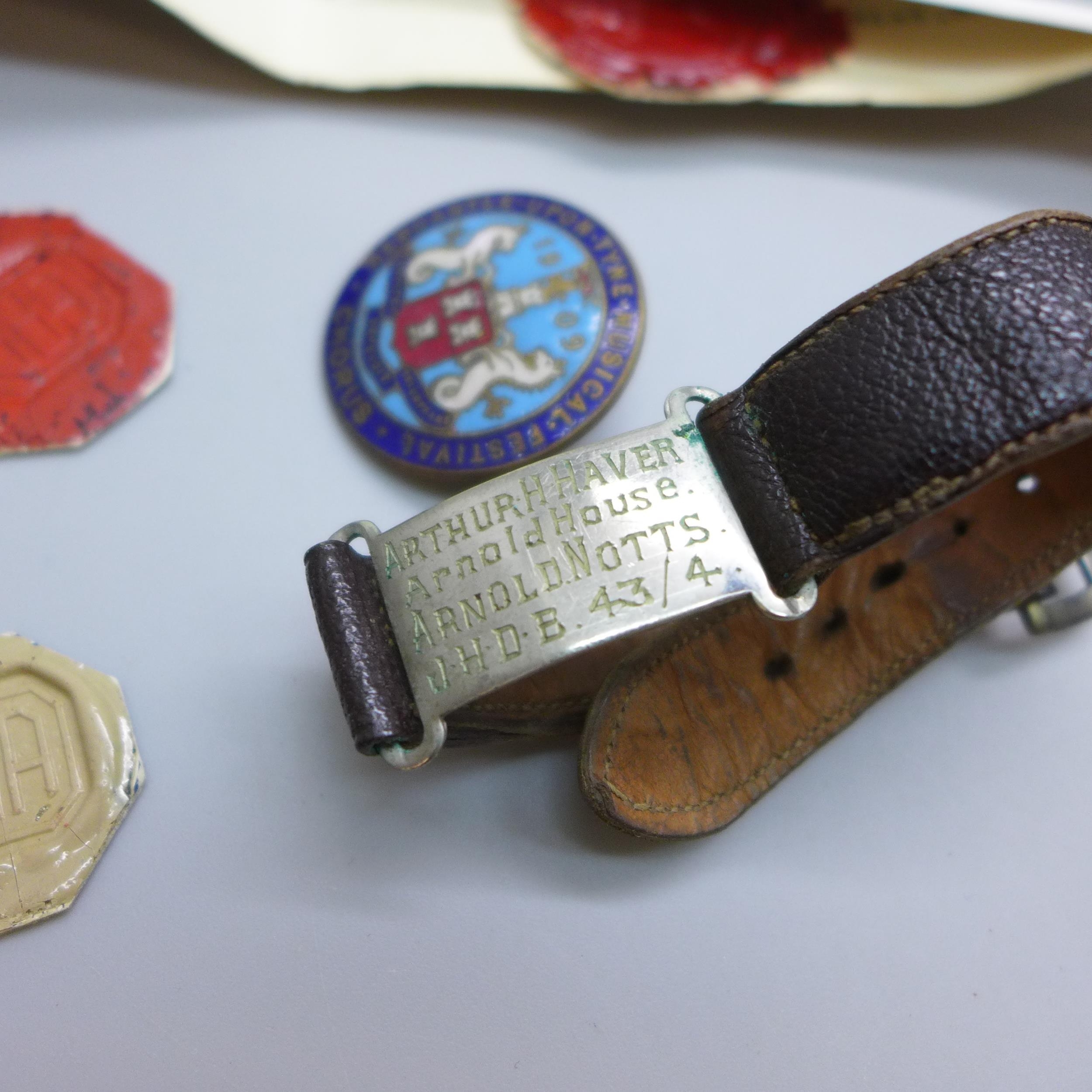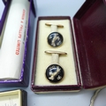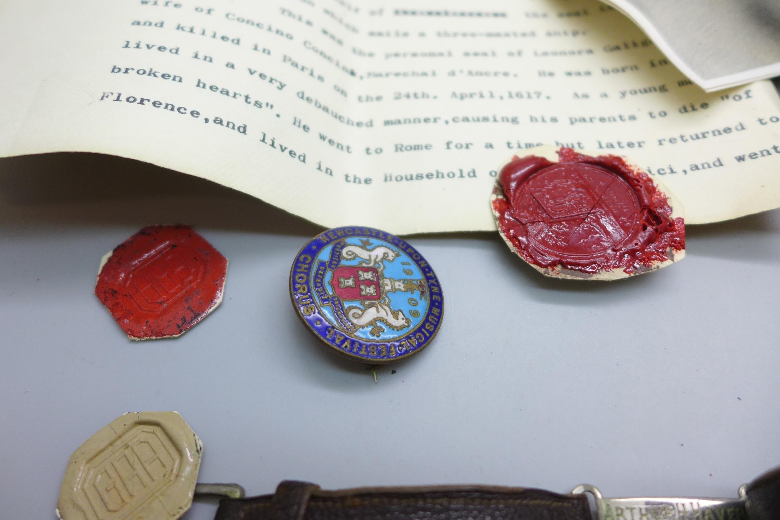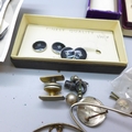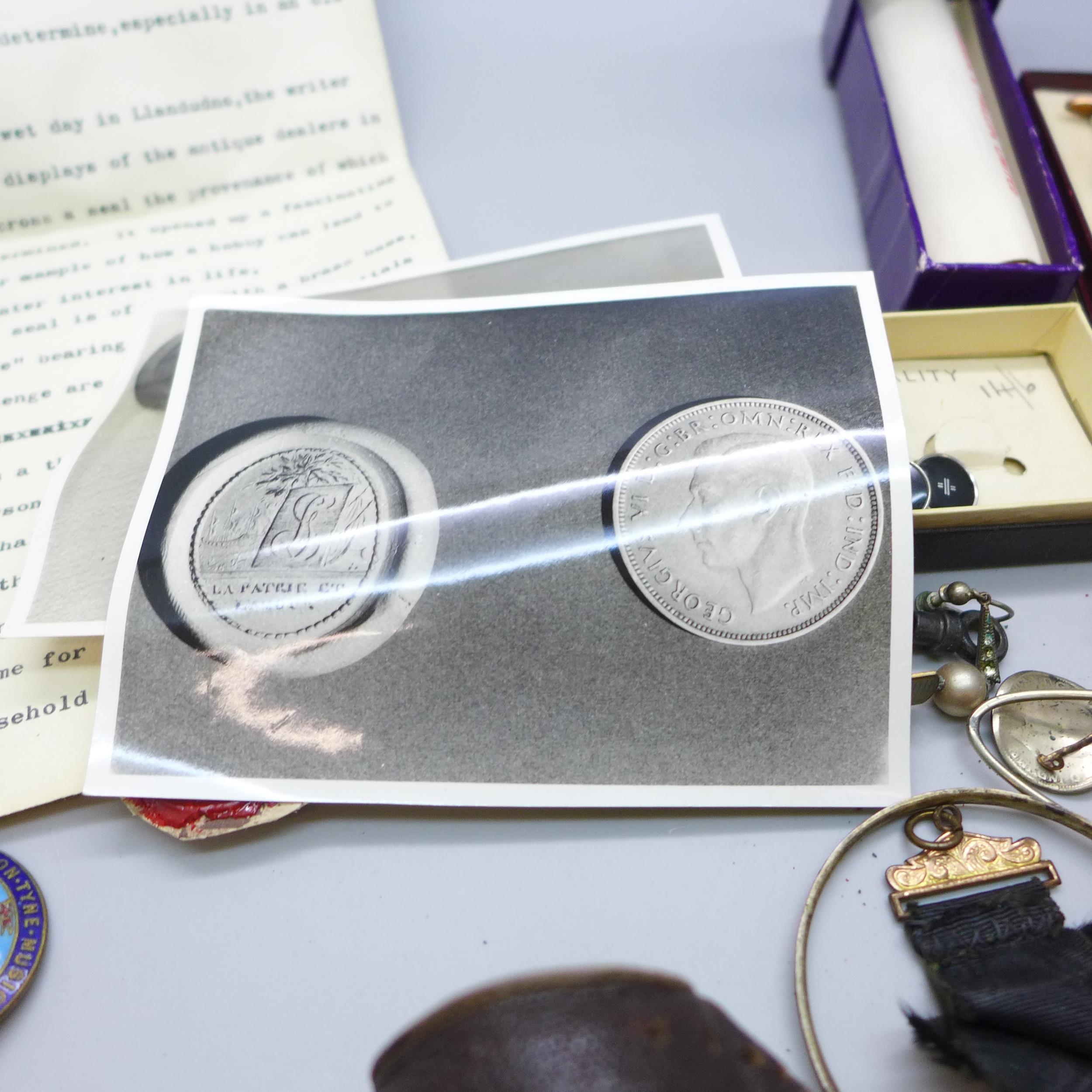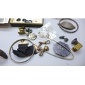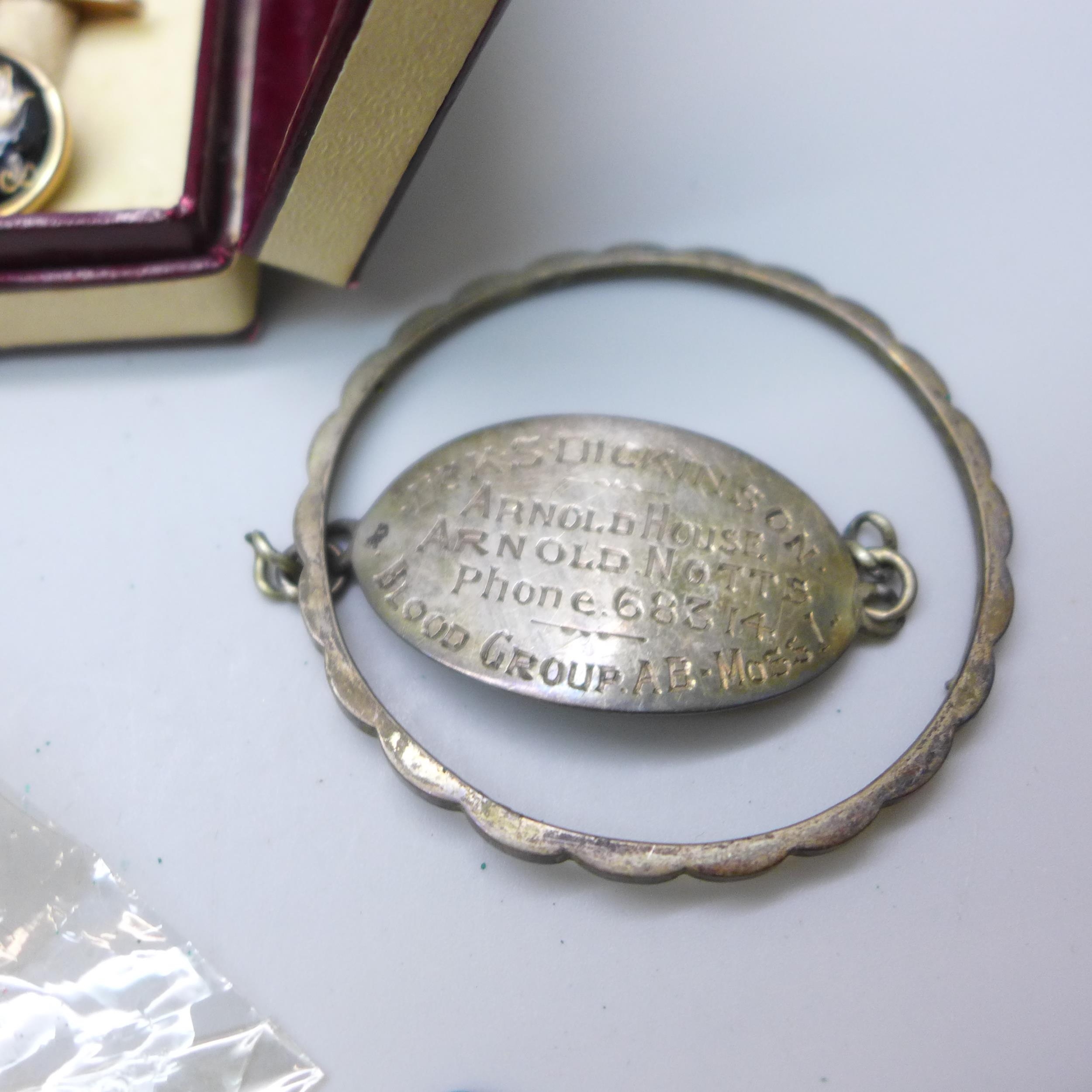 A hallmarked silver bell charm, other jewellery, cufflinks, badges, etc.