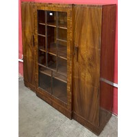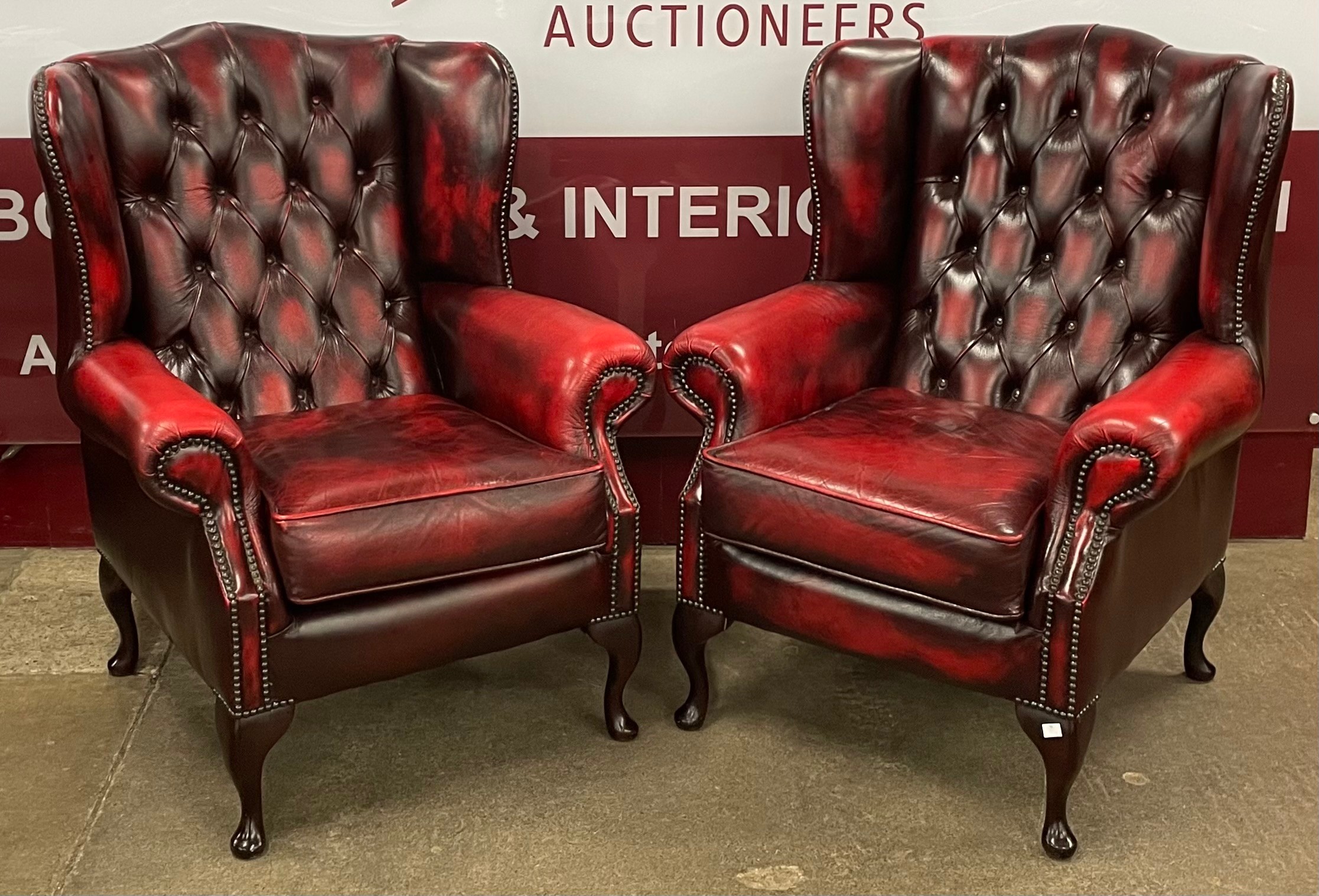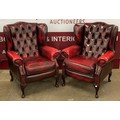 A pair of Queen Anne style oxblood red leather wingback armchairs